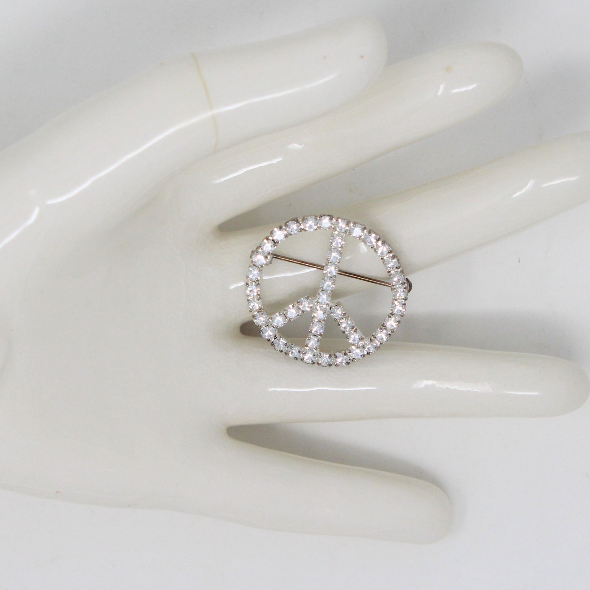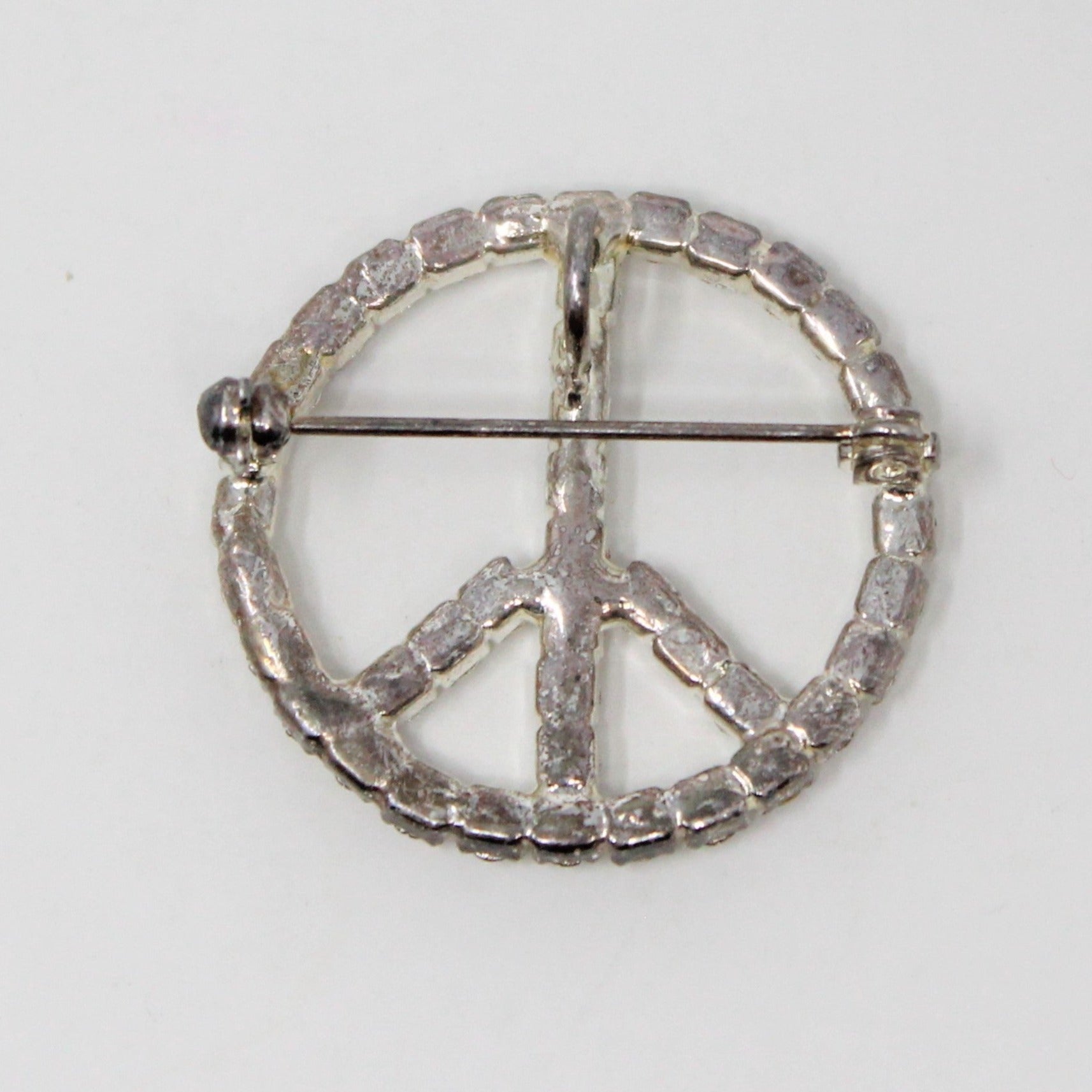 - Details: One look at this retro peace sign brooch / pendant and you'll be thinking it's Groovy, Far Out, you're really gonna Dig It! Gorgeous, clear rhinestones with lots of sparkle and shimmer set on silver-tone metal, make this a really wonderful brooch. It can be worn as a brooch or pendant. We are sure you'll love it for its retro design and significance!