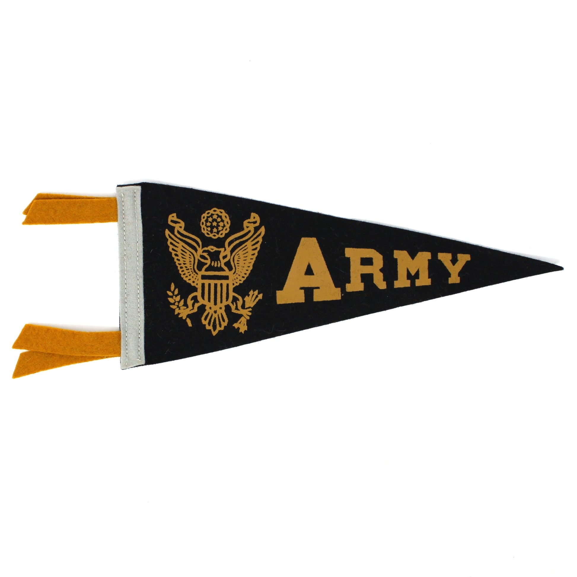 - Details: A wonderful vintage mini pennant to celebrate the Army, a great branch of the US Armed Forces. It is black color felt with gold lettering. The screen printing is done directly onto wool felt and is in perfect condition. This is a great addition to a pennant, patriotic memorabilia or souvenir collection. Perfect as decor for a game room, a dorm room or great gift for a veteran.