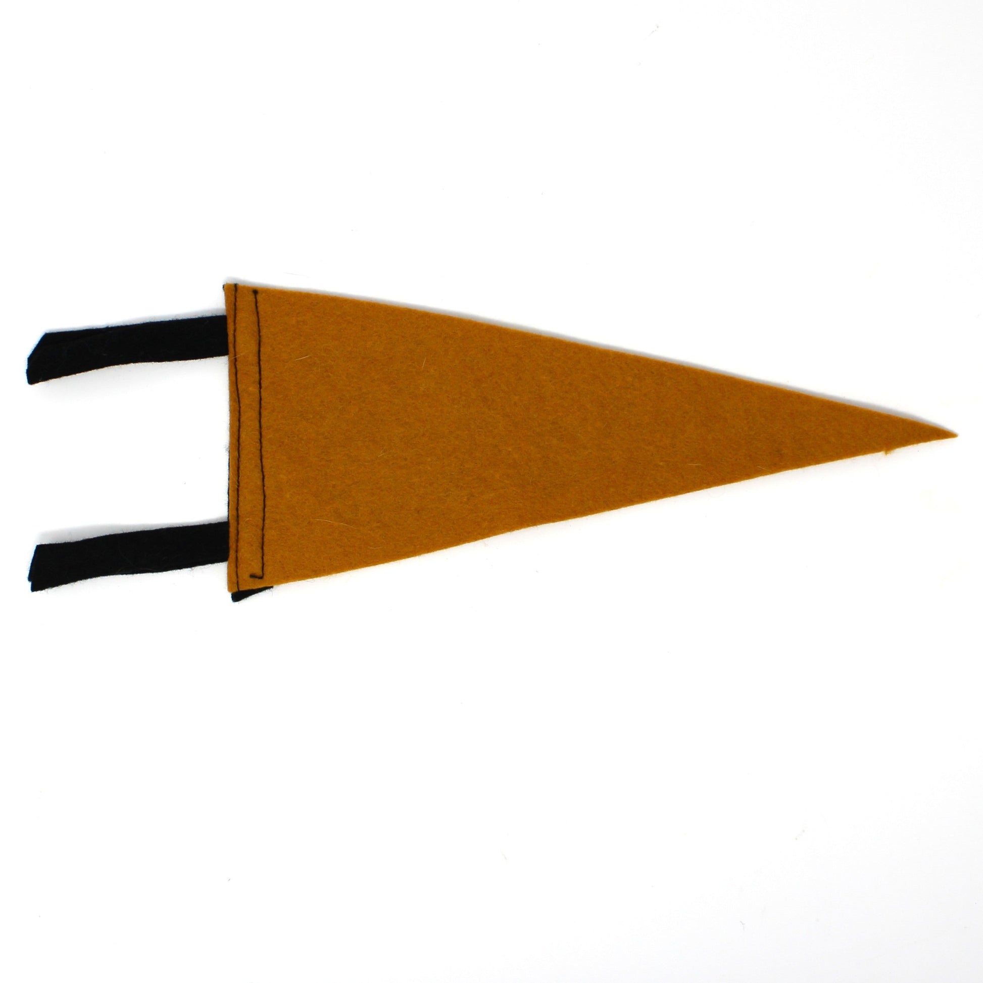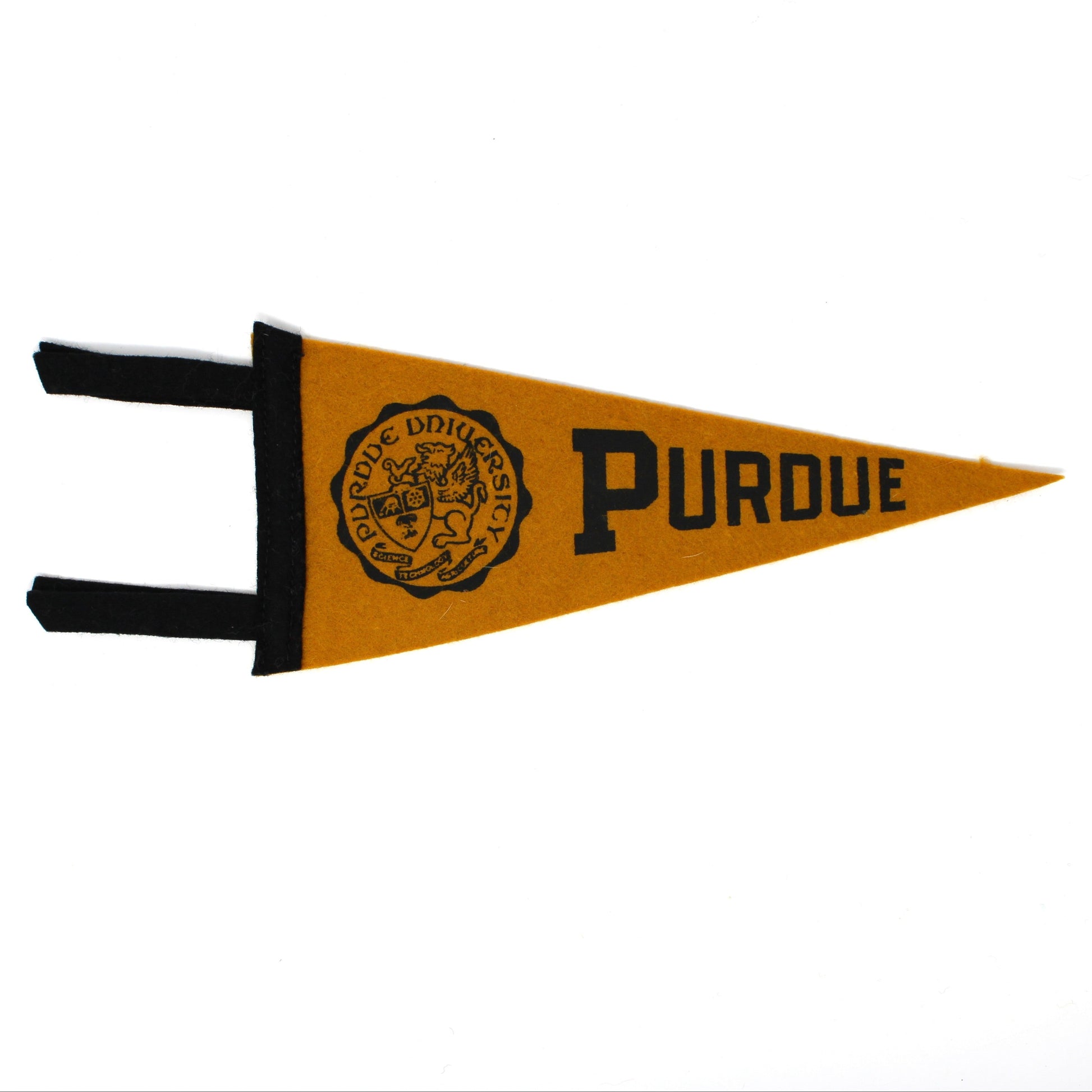 - Details: A wonderful vintage mini pennant for Purdue University, with school seal. It is mustard yellow felt with black lettering. The screen printing is printed directly onto wool felt and is in perfect condition. This is a great addition to a pennant, memorabilia or souvenir collection. Perfect as decor for a game room, a dorm room or great gift for an alumni.