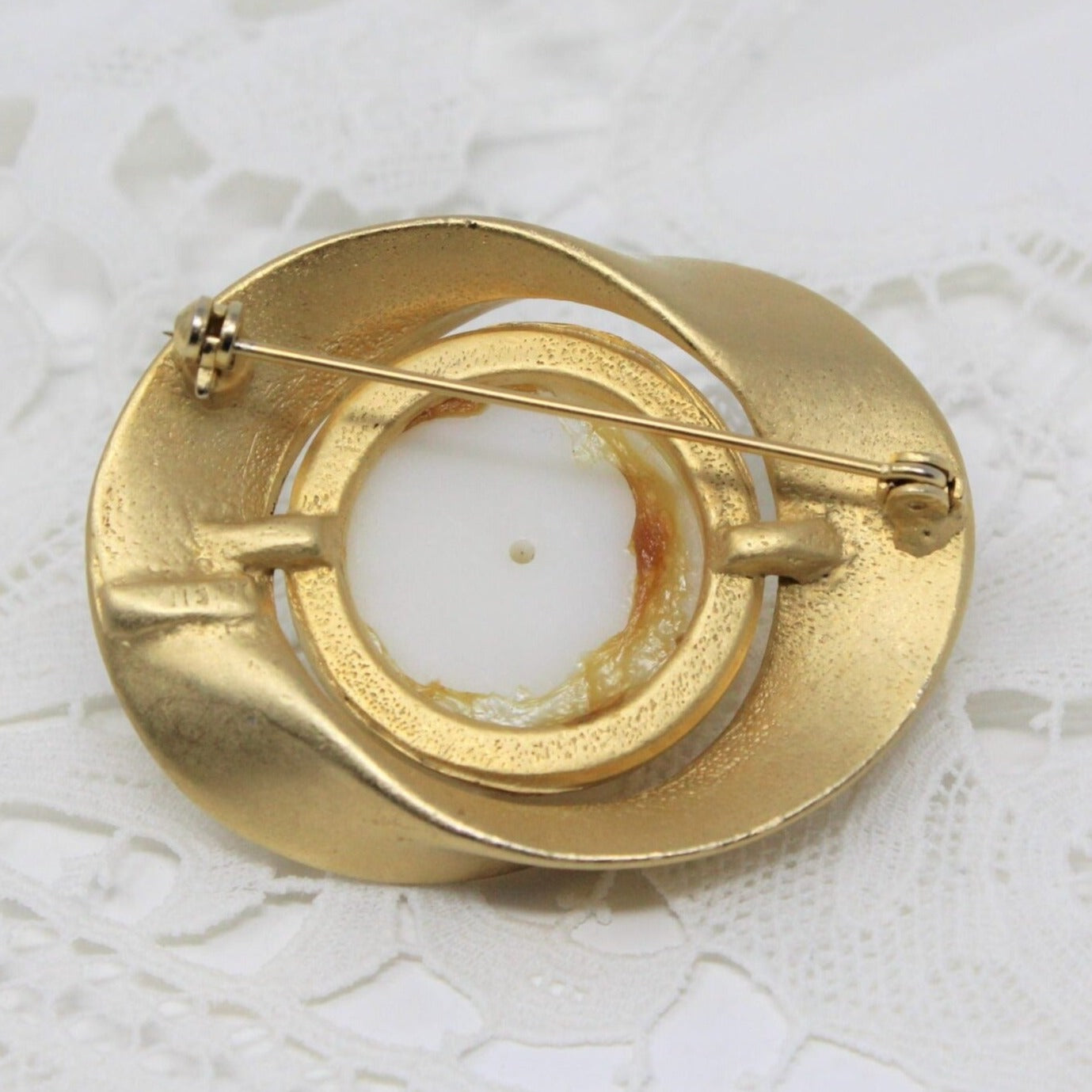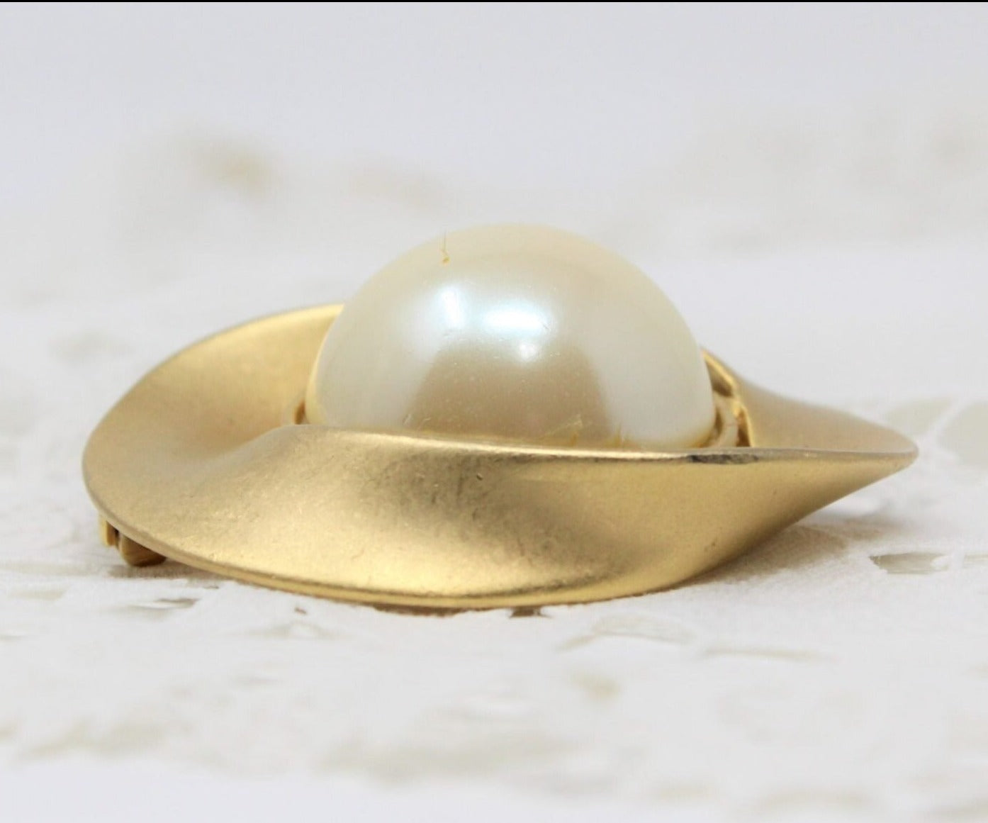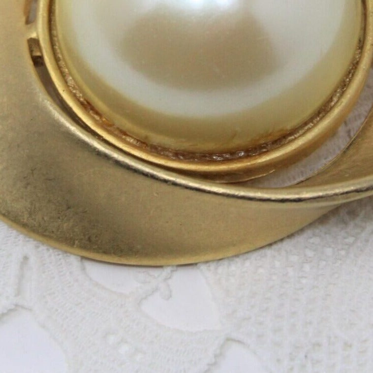 - Details: Such a beautiful brooch! Looks very modern due to its abstract design. This is an estate find, brushed gold-tone metal, in an rounded abstract form with a very large, single simulated pearl, in the center. It is very simple, but it's that simplicity that makes it a very elegant looking piece. Wish we could tell you about the manufacturer but it's unmarked. A perfect year-round.