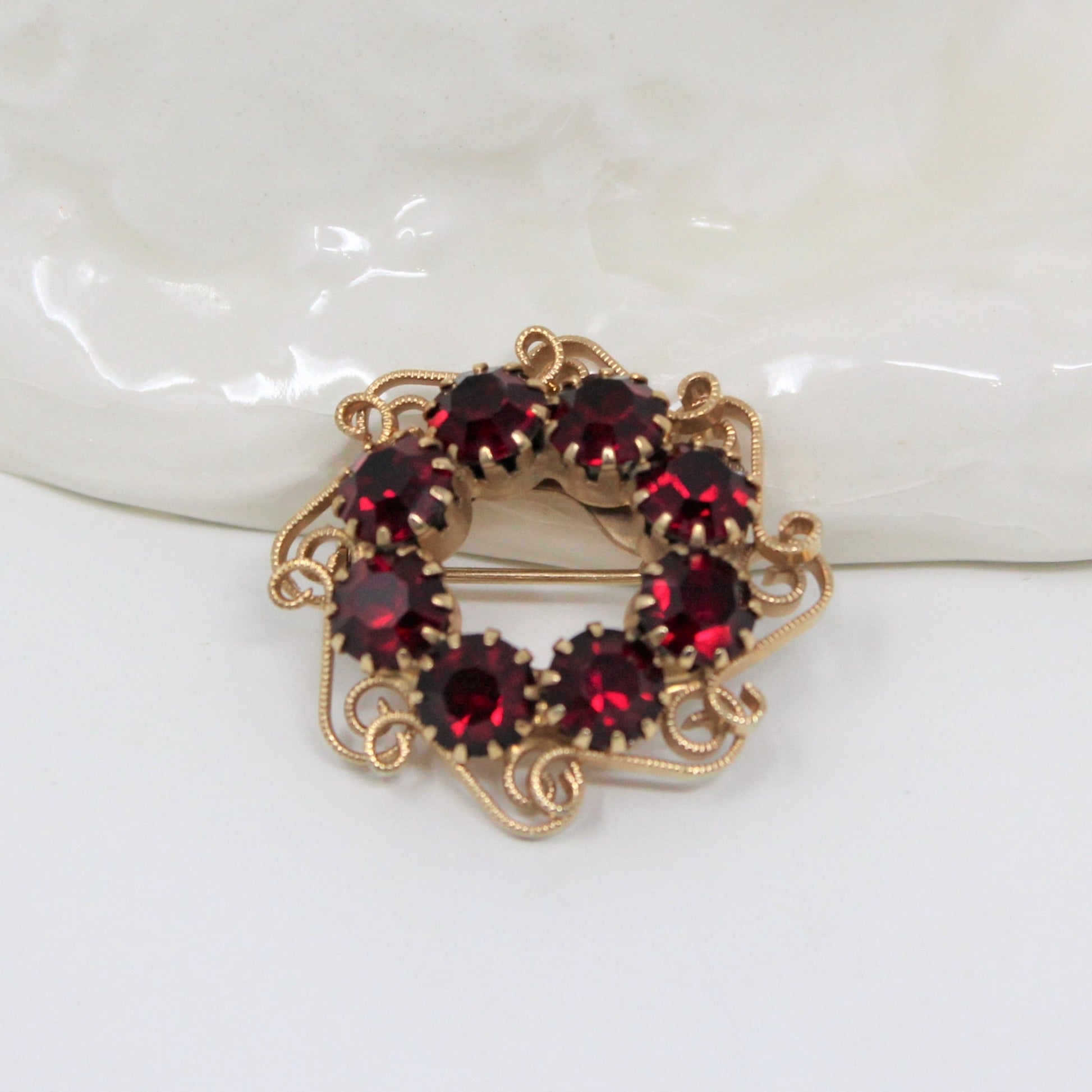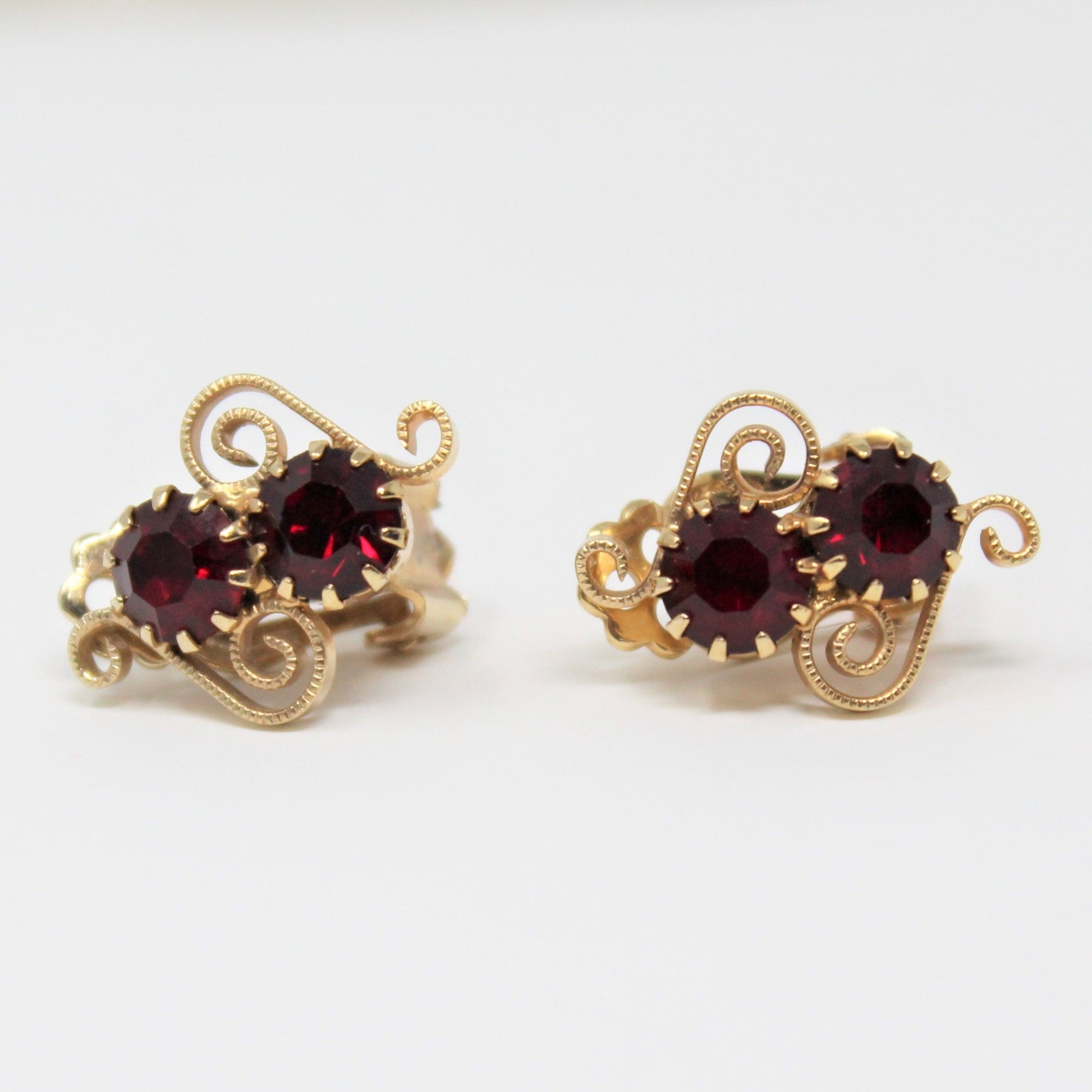 - Details: Such a feminine brooch and earring set! It features a round brooch and clip on earrings with beautiful deep dark red rhinestones. All pieces have wonderful large, round, prong set, red faceted rhinestones set within gold-tone filigree swirls. Overall a really well made piece, lots of attention to detail. Perfect for so many outfits, ideal for Valentine's and Christmas! Unfortunately they are unmarked so we're unable to tell you more beyond the description, but the set is beautiful enough for gift-giving.