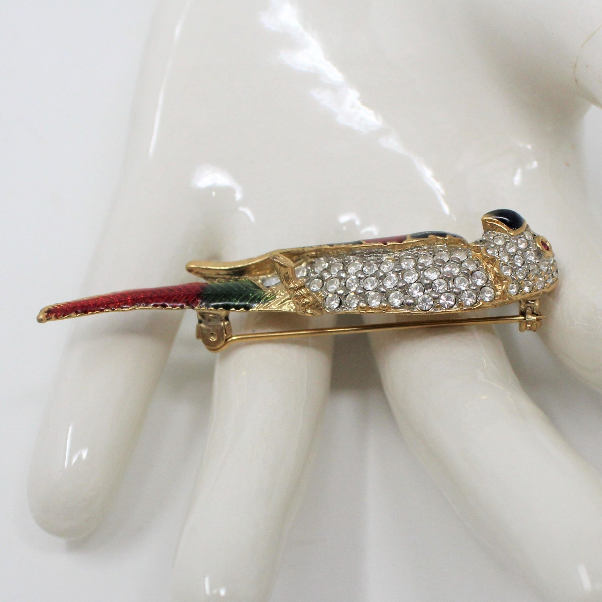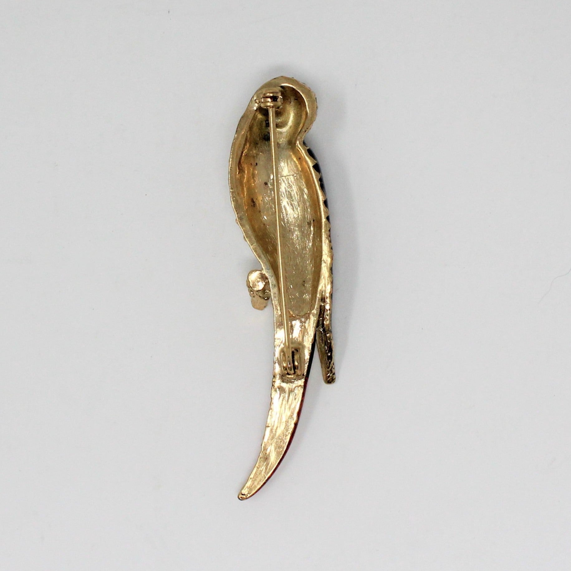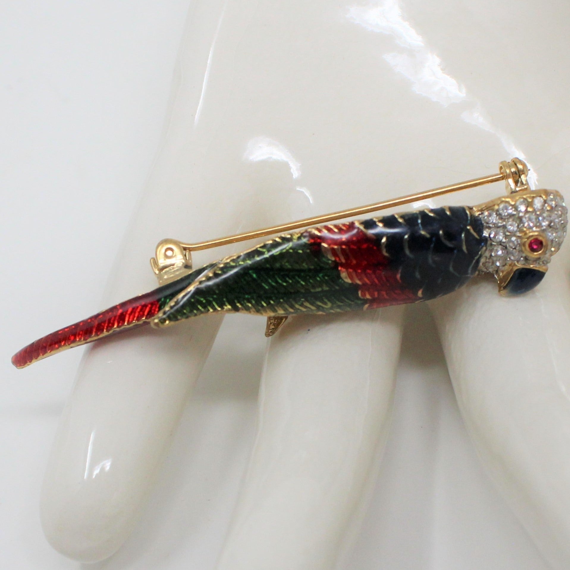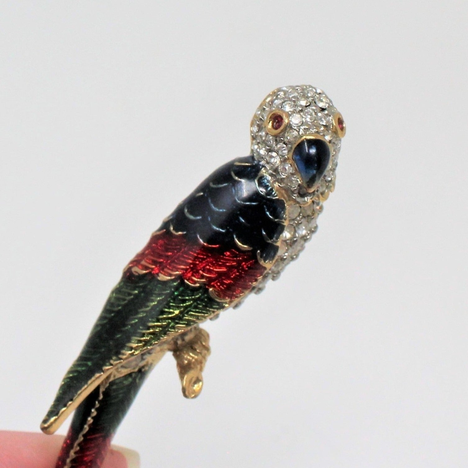 - Details: Such a lovely parrot pin! It has a wonderful blue, red and green enamel wing and tail feathers & clear rhinestones on the rest of the body. The eyes are red rhinestones and the beak is blue enamel. This piece is unmarked, however, we've done some research and believe this is a reproduction from an original Giorgio Armani design. If you love the look but not ready to splurge on the real thing, (starting at $95 Used and up into the $100's), this is a great alternative. It's a high quality brooch, the rhinestones are extremely clear and shiny and the enamel work is absolutely perfect. And you'll still be able to afford a great night on the town to show it off! Perfect condition for gifting!