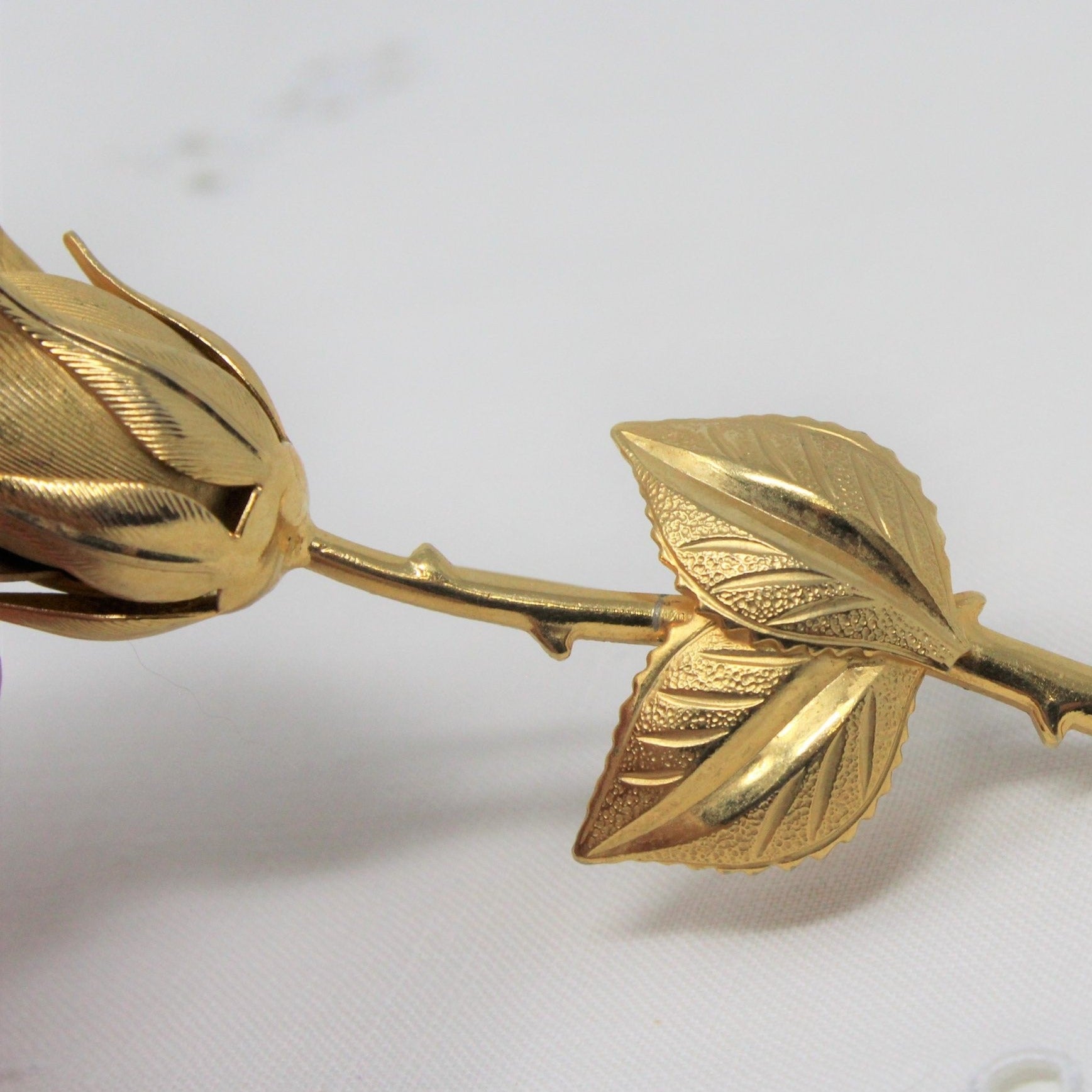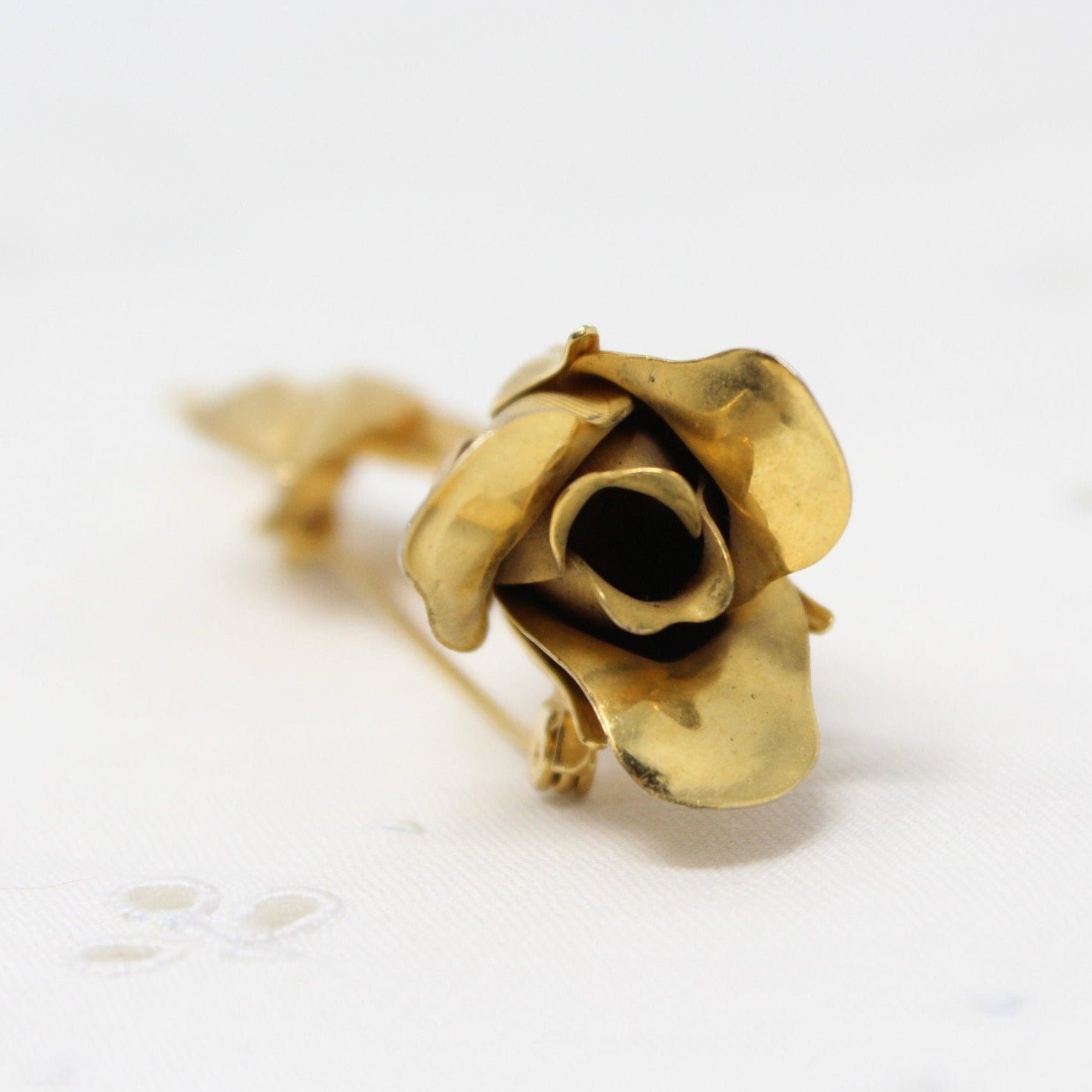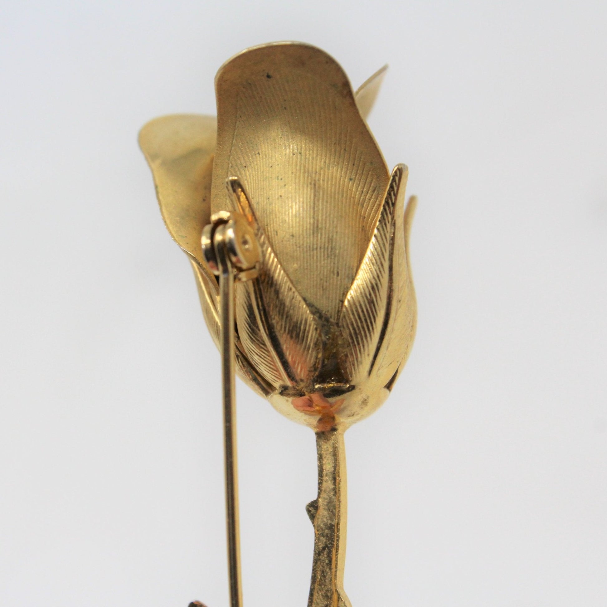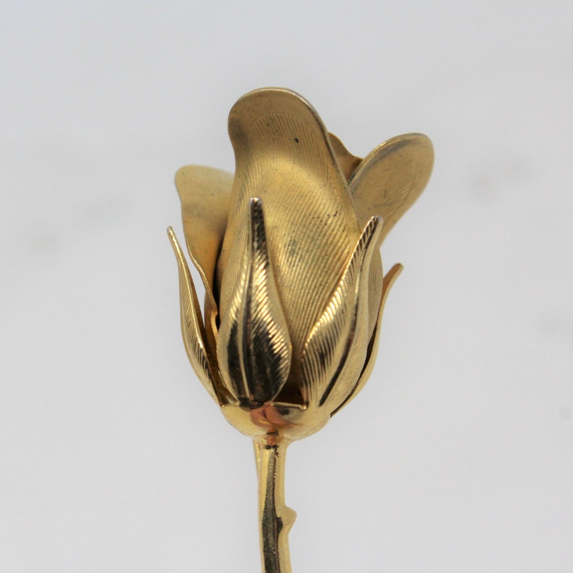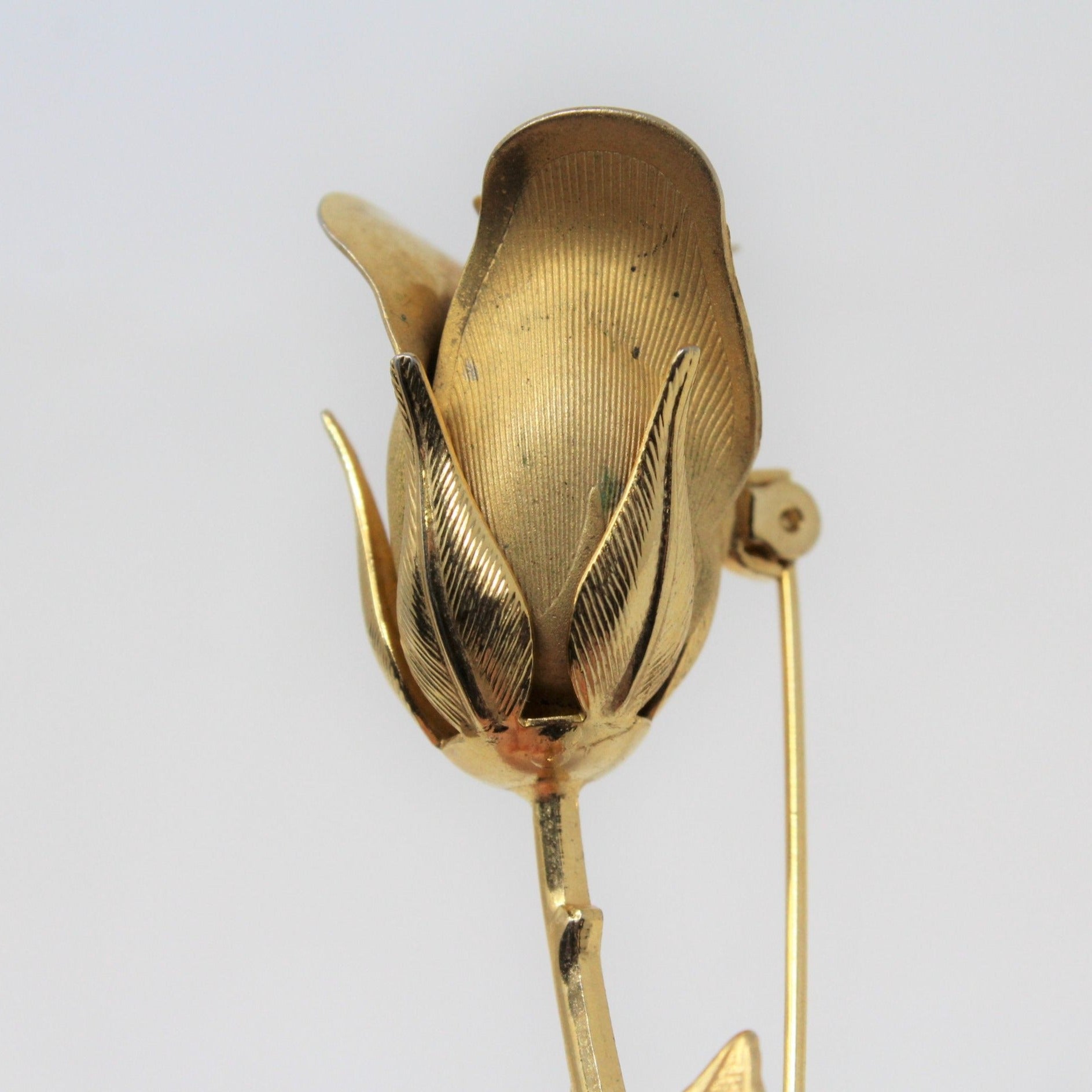 - Details: Such a beautiful pin! It is a gold tone metal rose bud with lots of texture. The rose petals are shiny on the inside and have a detailed, brushed finish on the outside. The sepals have a different texture and the leaves yet another texture. Overall a really well made piece, lots of attention to detail. Wish we could tell you about the manufacturer but it's unmarked. A perfect accessory for Spring and Summer!!