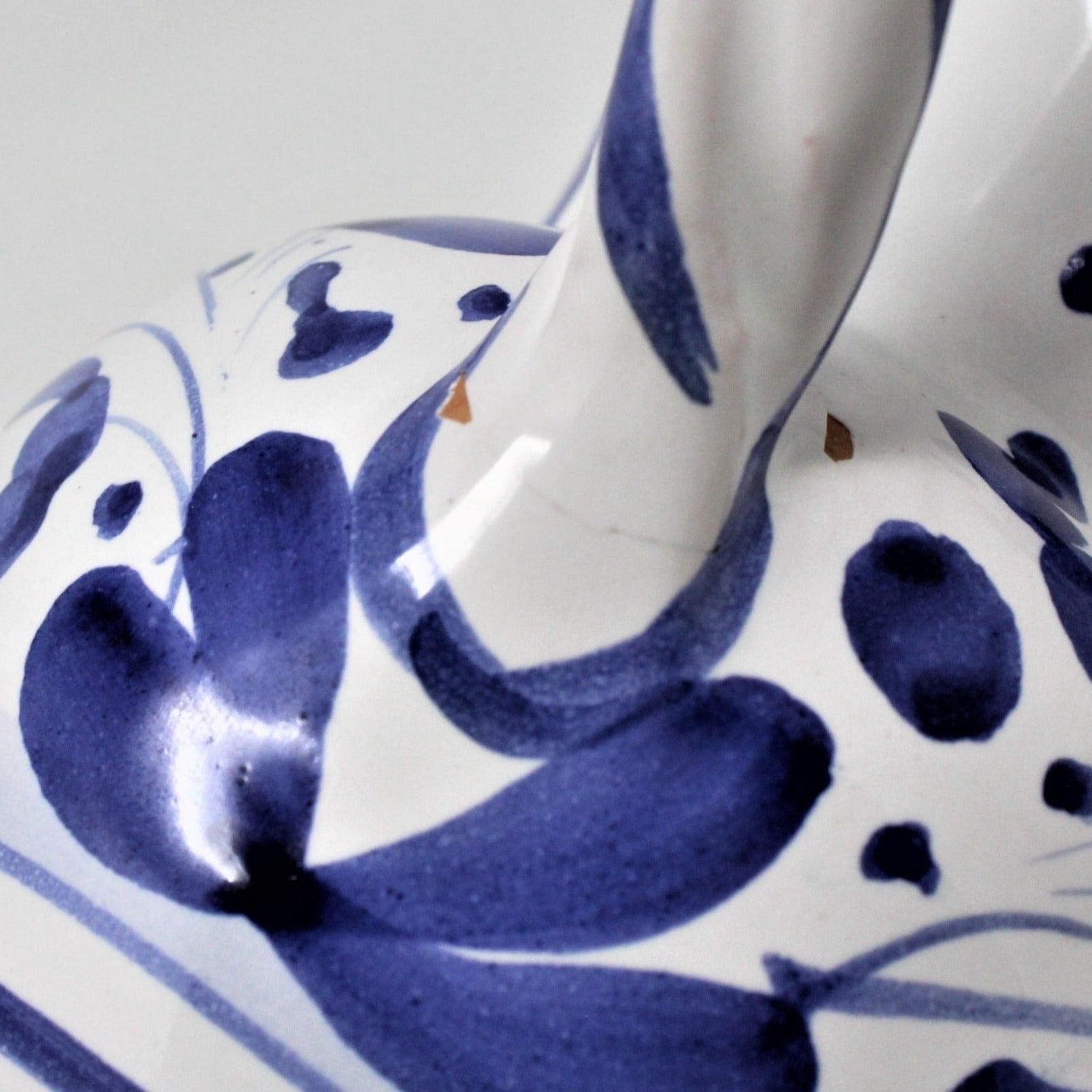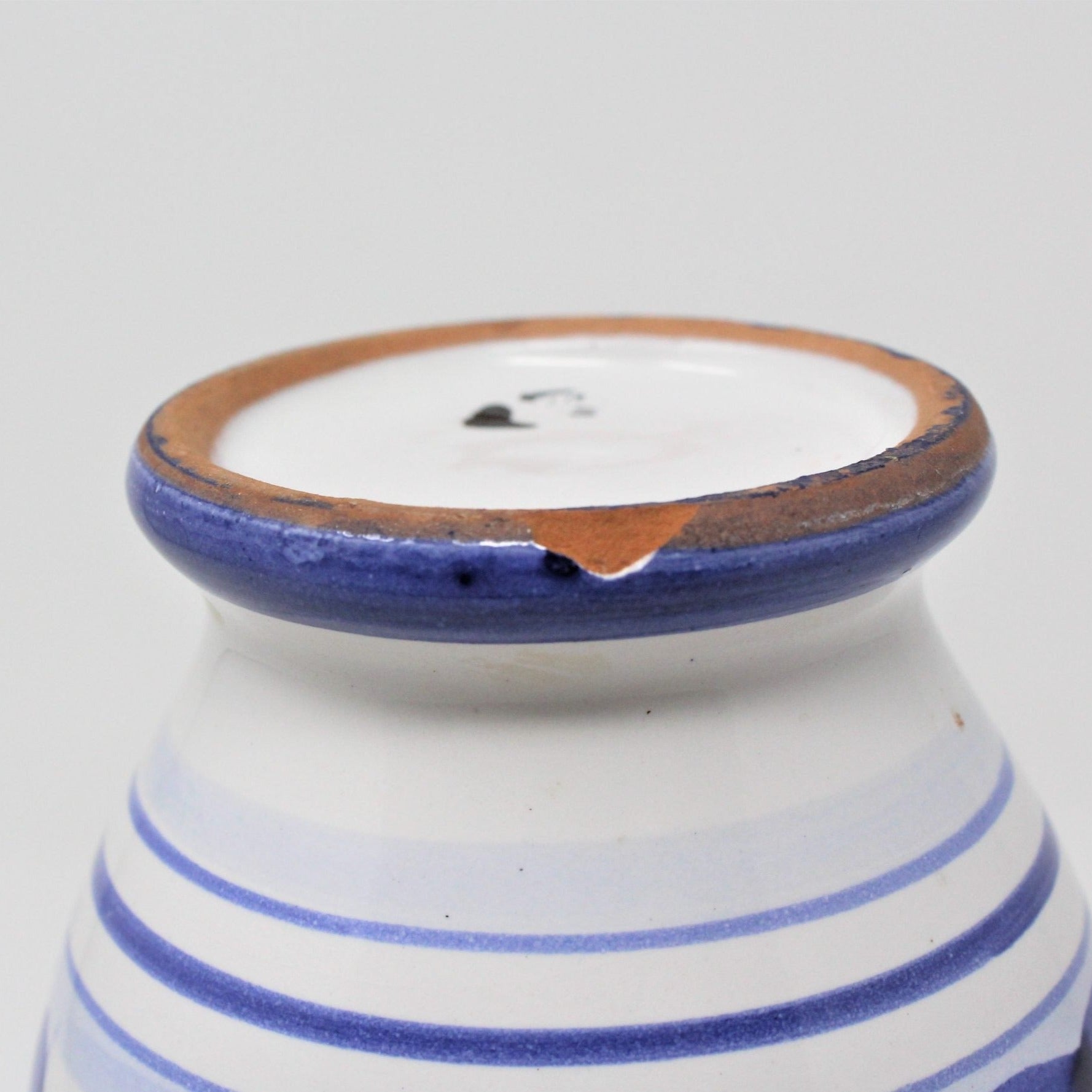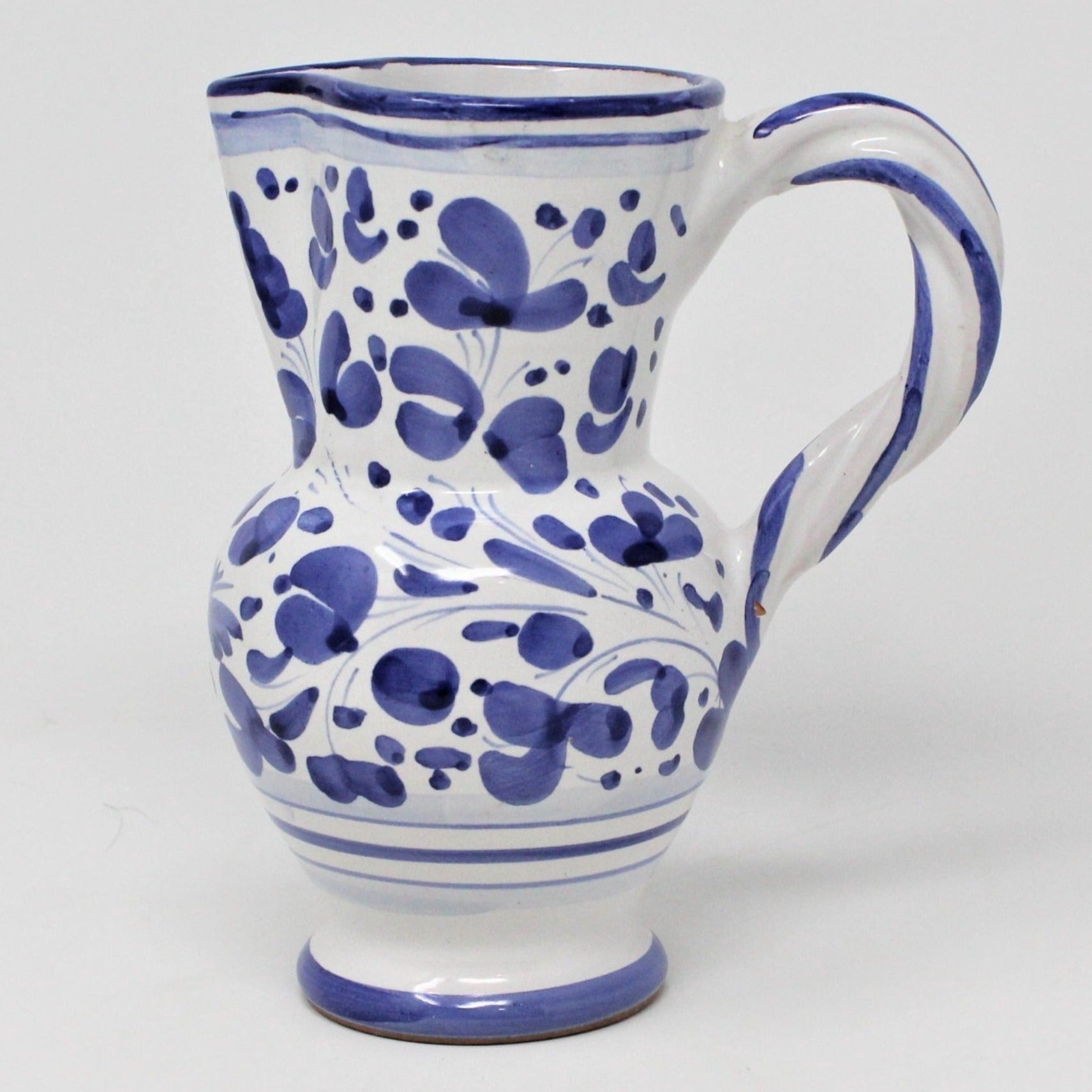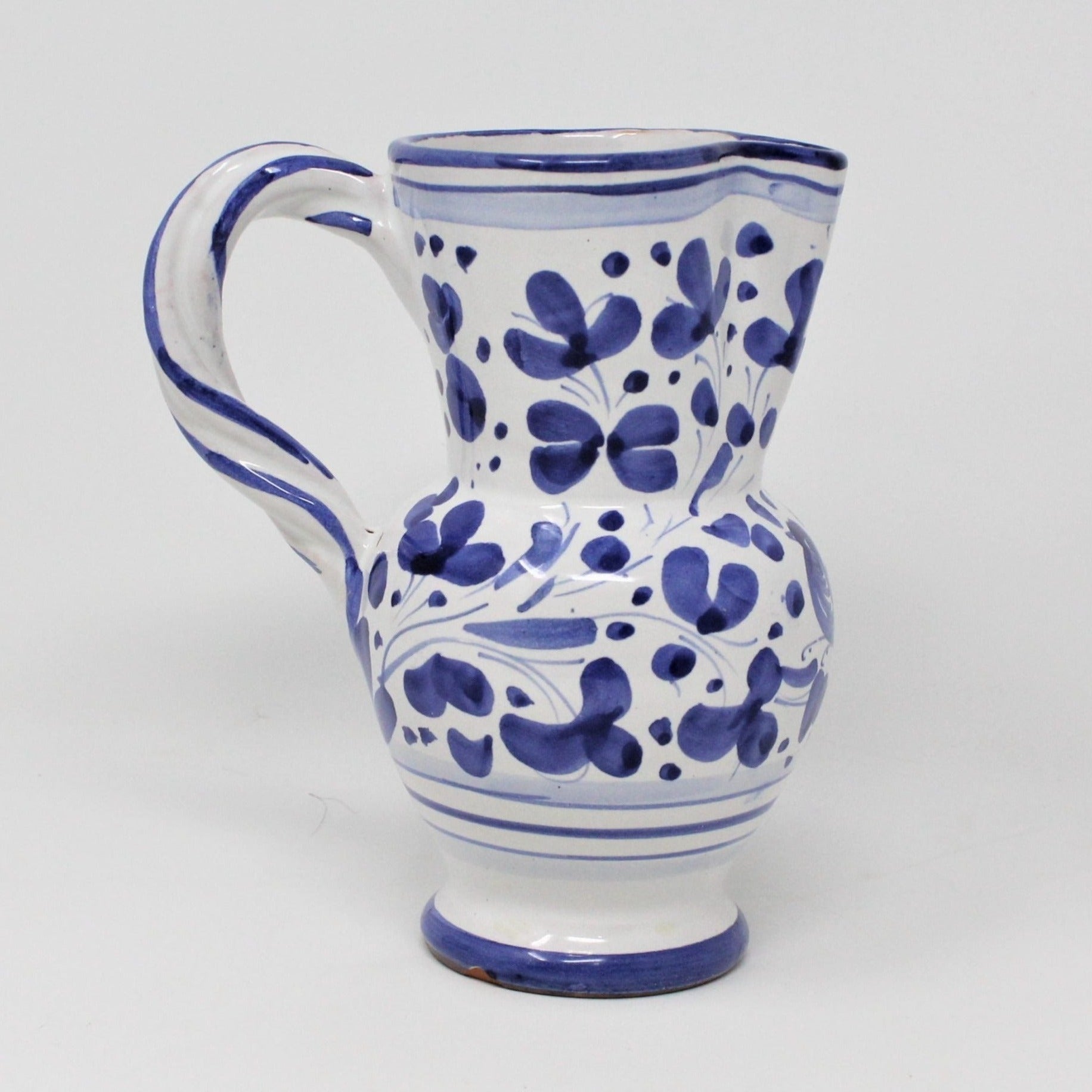 - Details: This is a very pretty pitcher in the much loved Blue and White colors. It is not vintage, the Deruta Arabesco Collection* is a signature design originating in Deruta, Italy, first issued in 2007. The pitcher is hand painted in the traditional Arabesco Bird design and some pretty stripes in light and dark blue and again, that twisted handle. The piece is signed, however the signature is worn, only a fragment is visible. There are some condition issues, (see below), we have kept the price low. However, if you're just looking for a pretty piece of pottery to display or use as a floral vase, this might just be the piece for you. Ideal as kitchen decor, perfect in a farmhouse, country or Mediterranean styled home.