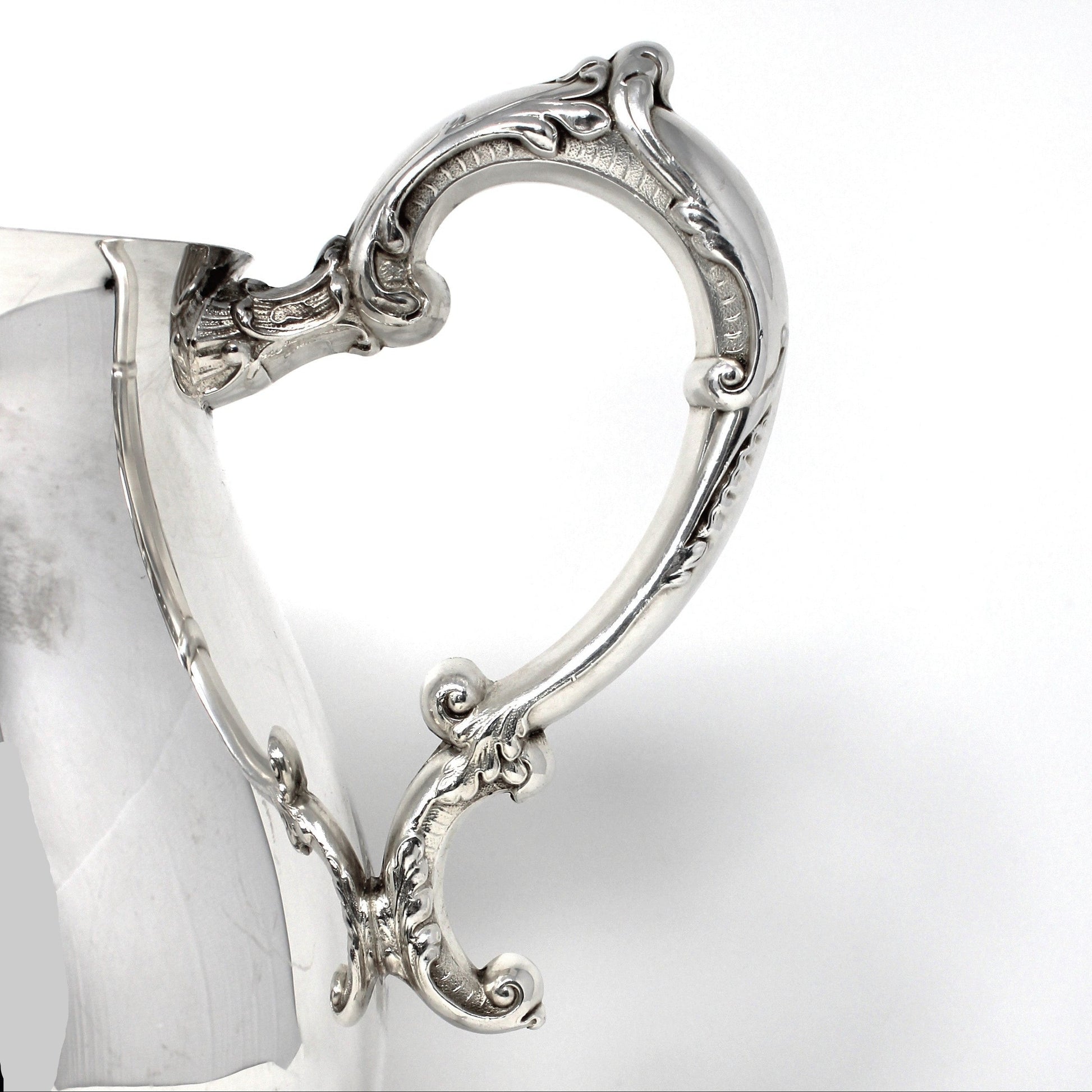 - Details: Elegant and very large silverplate beverage pitcher from Sheridan Silver with a handy ice lip to keep ice cubes out of your drink. The floral footed base and ornate handle showcase refined craftsmanship characteristic of classic serveware. Perfect for serving beverages at formal dinners, special occasions, or as a striking decorative accent in any room. A timeless piece that combines functionality with vintage charm. Silver is always a nice addition on a dinner table or buffet, makes a pretty floral vase too.