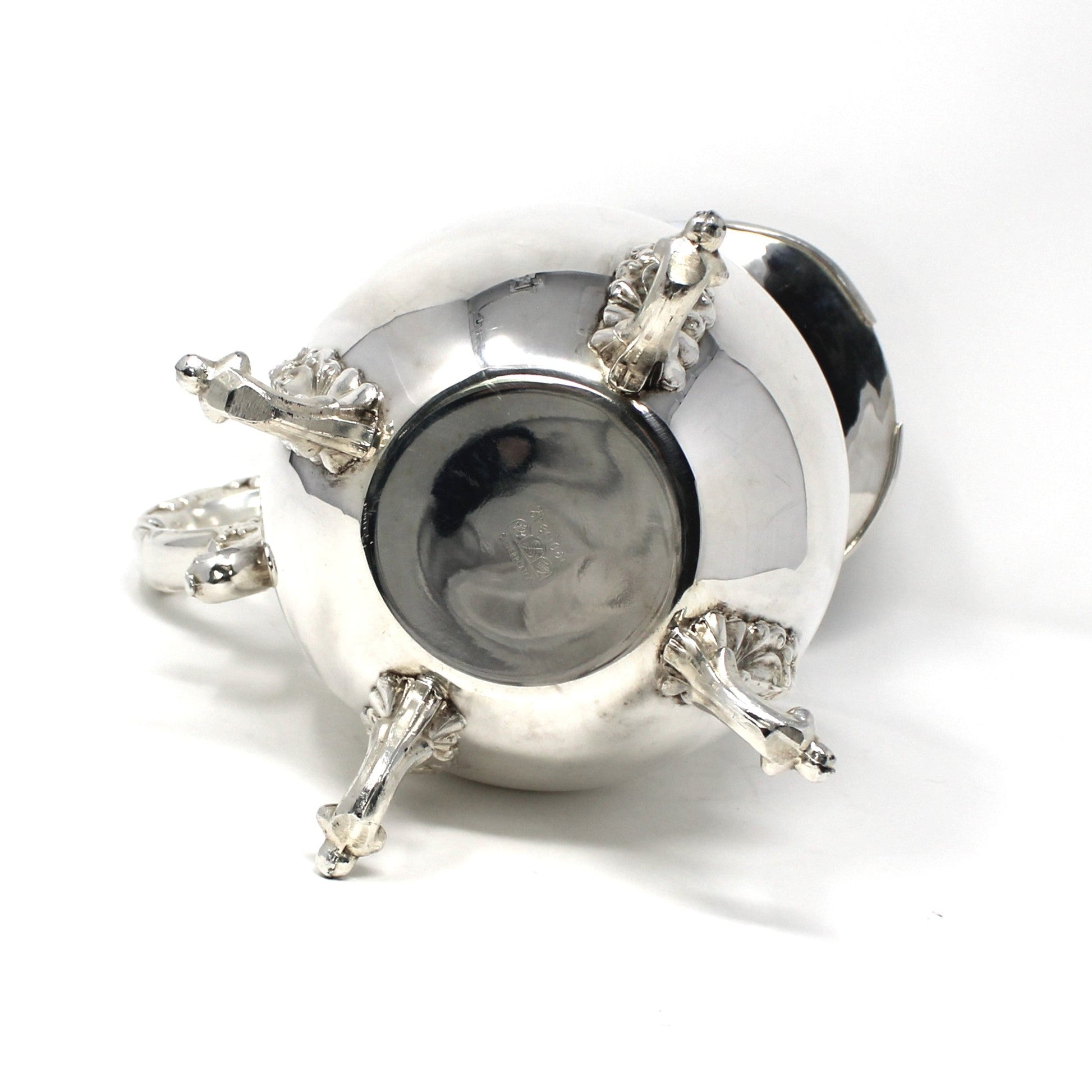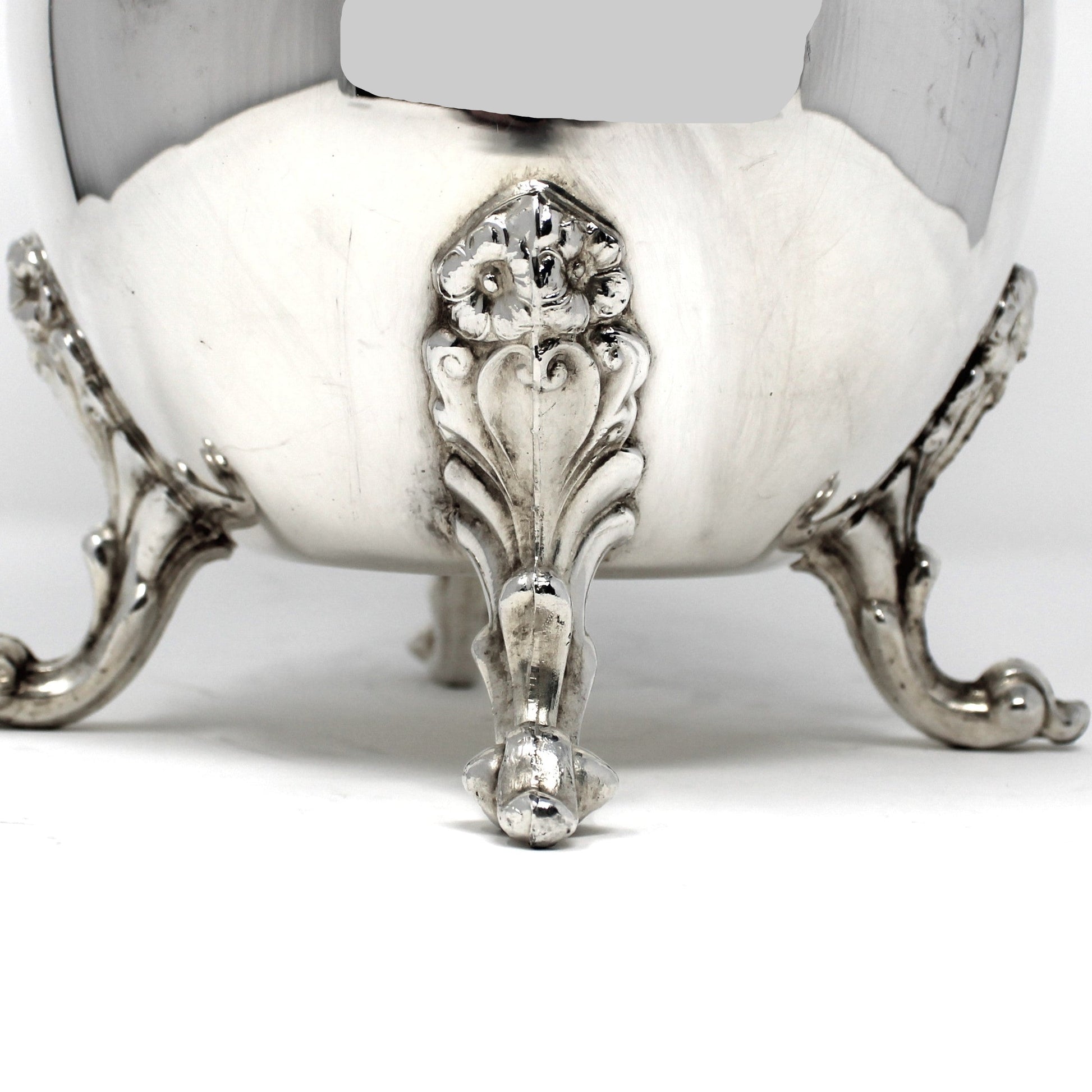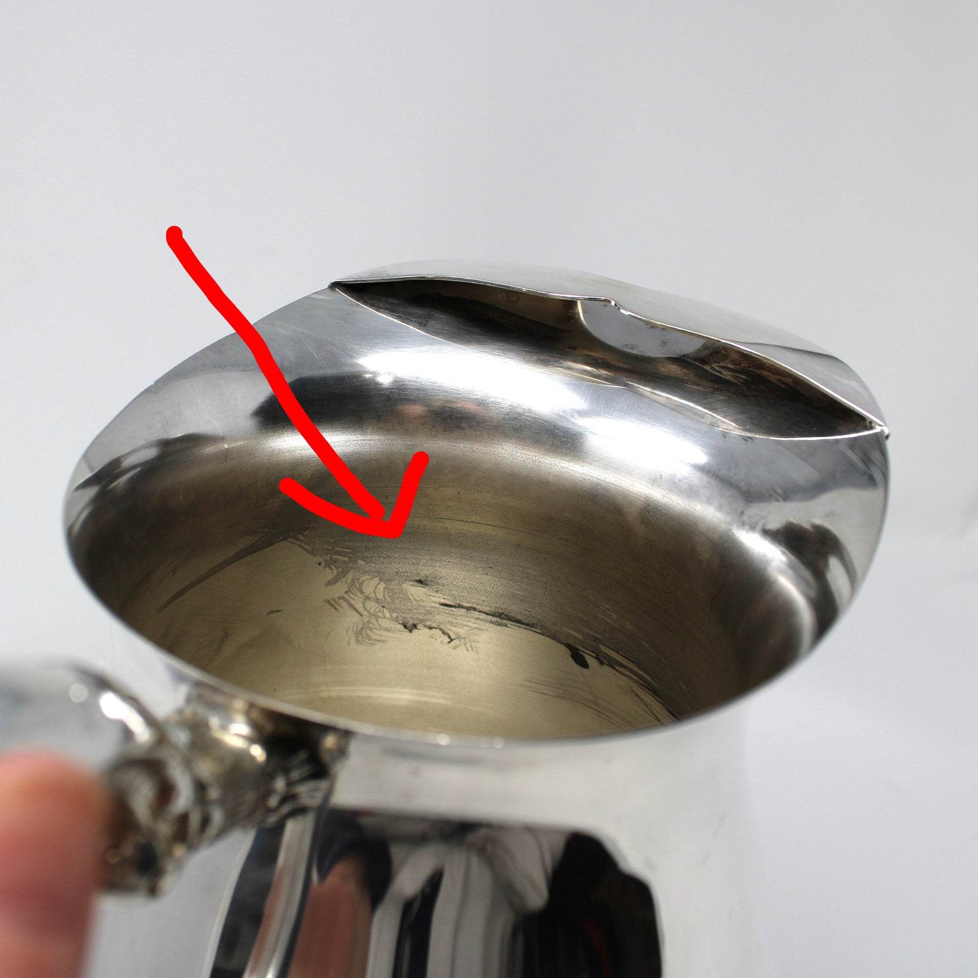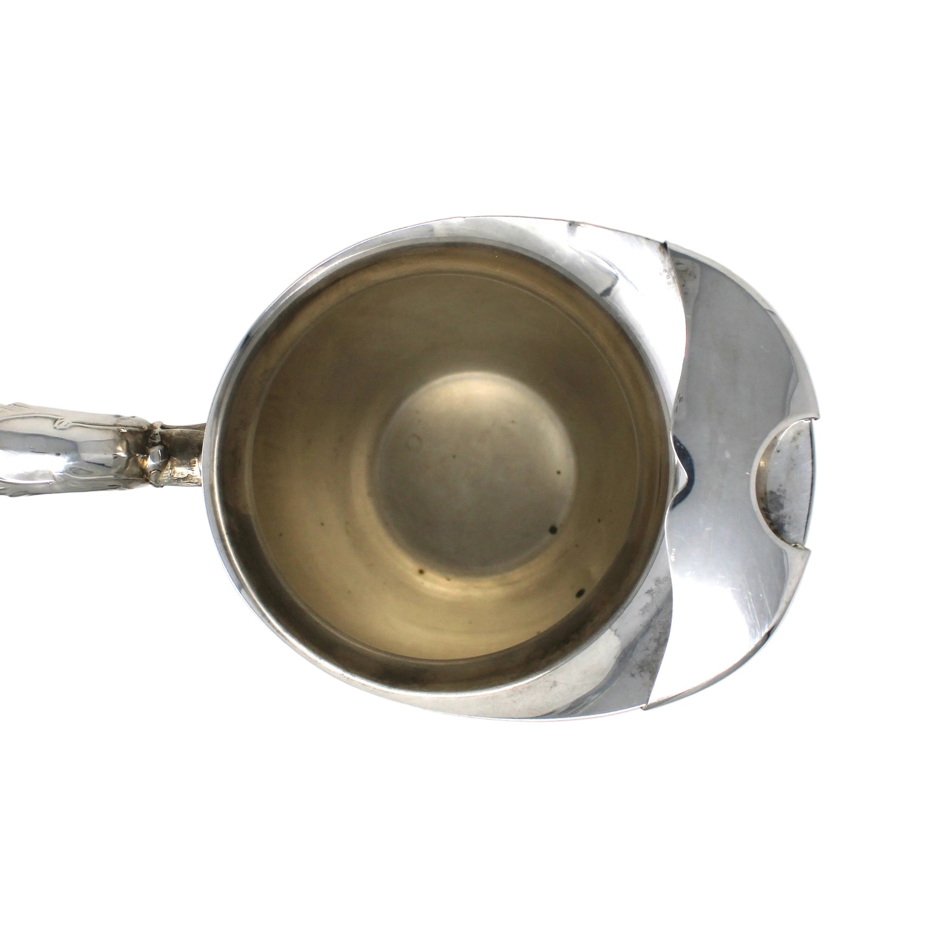 - Condition: Vintage - Used. Very Good Vintage Condition. There are a couple of black "dots", a stain on the inside and a "hazy" mark we couldn't remove. All photographed for your review. As with any used silver and silverplated items, there are surface scratches visible and other marks. No dents, or corrosion. There is nothing wrong with the center of this pitcher, the color is an attempt to cover our reflection when photographing the piece. Please review all pictures and make sure you love this item before purchasing, we can't accept returns. Please remember these are VINTAGE and ANTIQUE items, they are NOT new, every effort has been made to show scratches, wear and tear and imperfections.