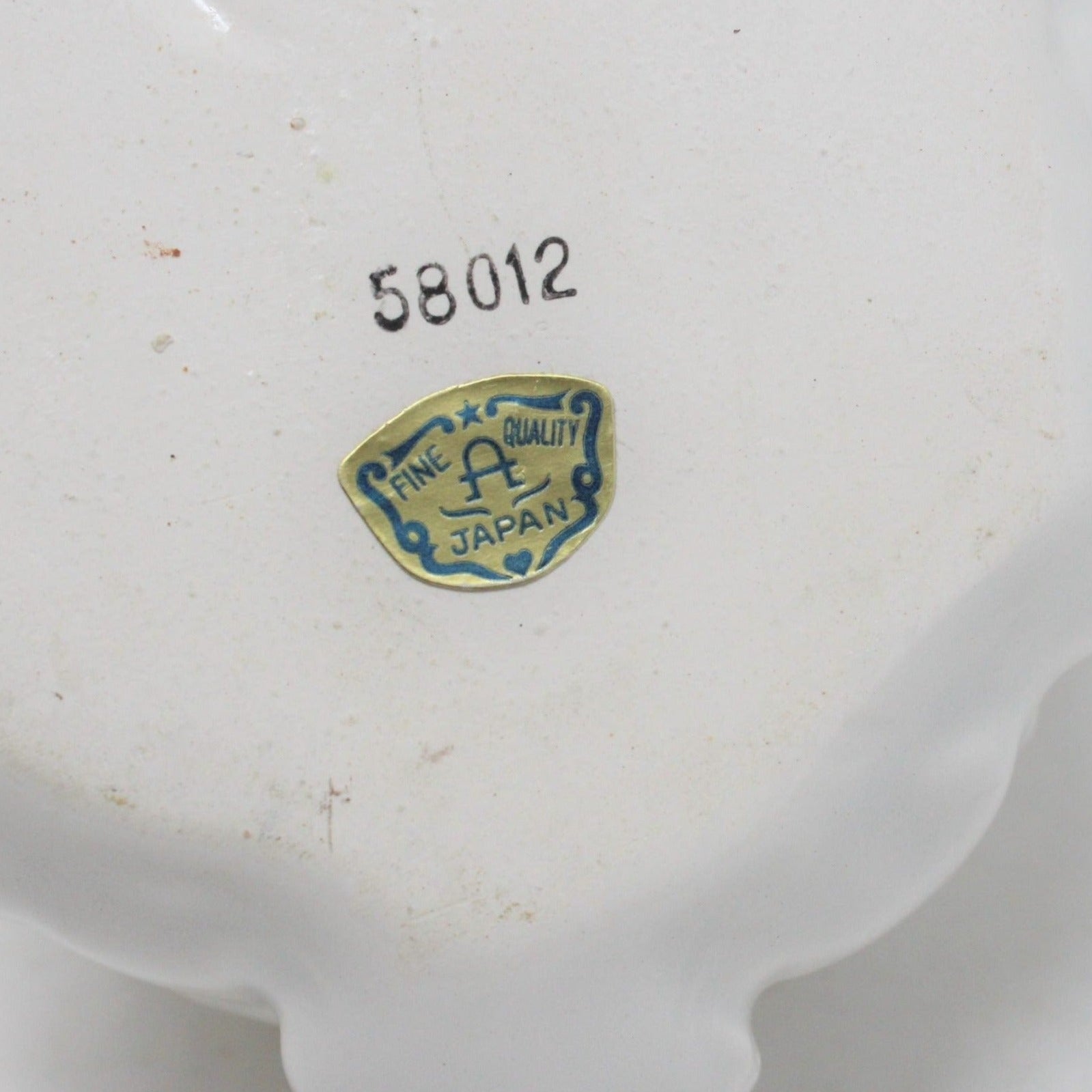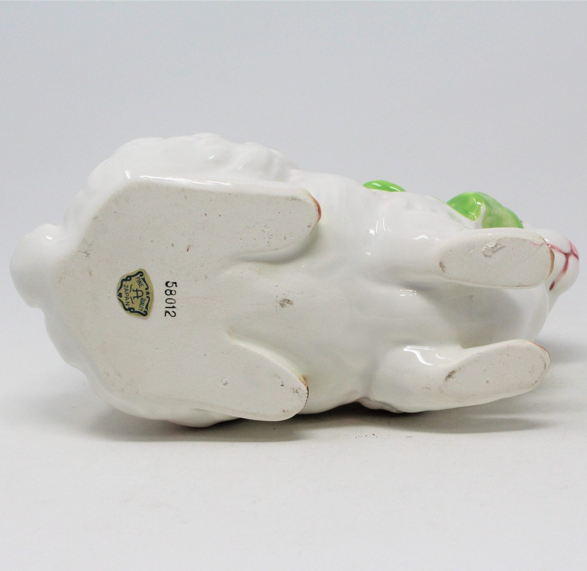 - Details: This is such a cute planter / cachet pot and ready for Easter! It is a very detailed fluffy bunny rabbit with his cottontail, expressive eyes and light pink nose and ears. He is wearing a large green bow tied around his neck. This piece looks hand painted and retains its original foil label that reads: " Fine Quality A Japan". The bottom is stamped with the numbers: 58012. Could be either Arnart or Arco but we believe this was made by Arco, they always used the "Fine Quality" word mark on their labels. There is no drainage hole so perfect as a cachet pot or vase. Great hostess gift with a little plant or for your own home decor. Perfect as Easter decor. Would look very cute in a baby's nursery or for a Baby Shower bunny theme.
