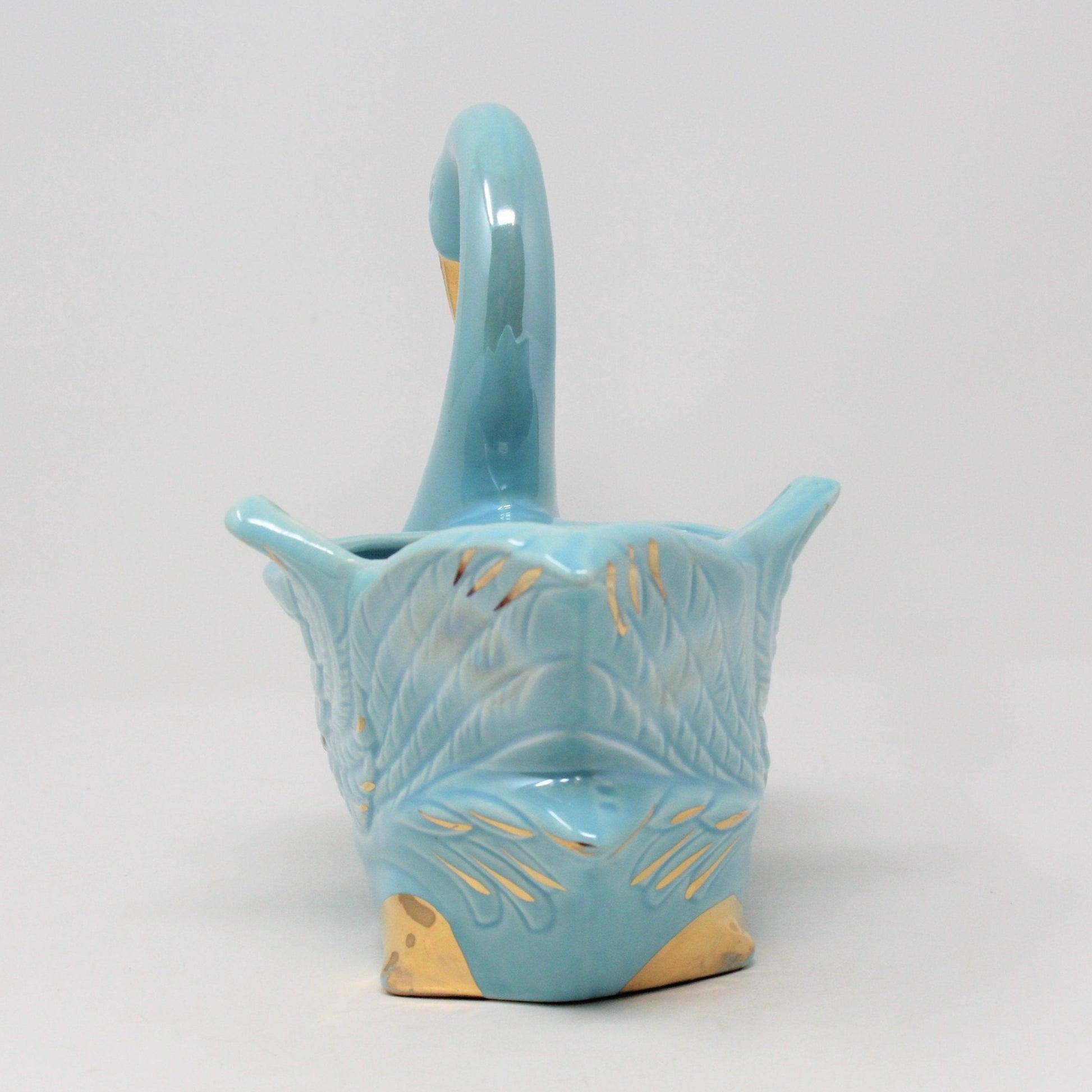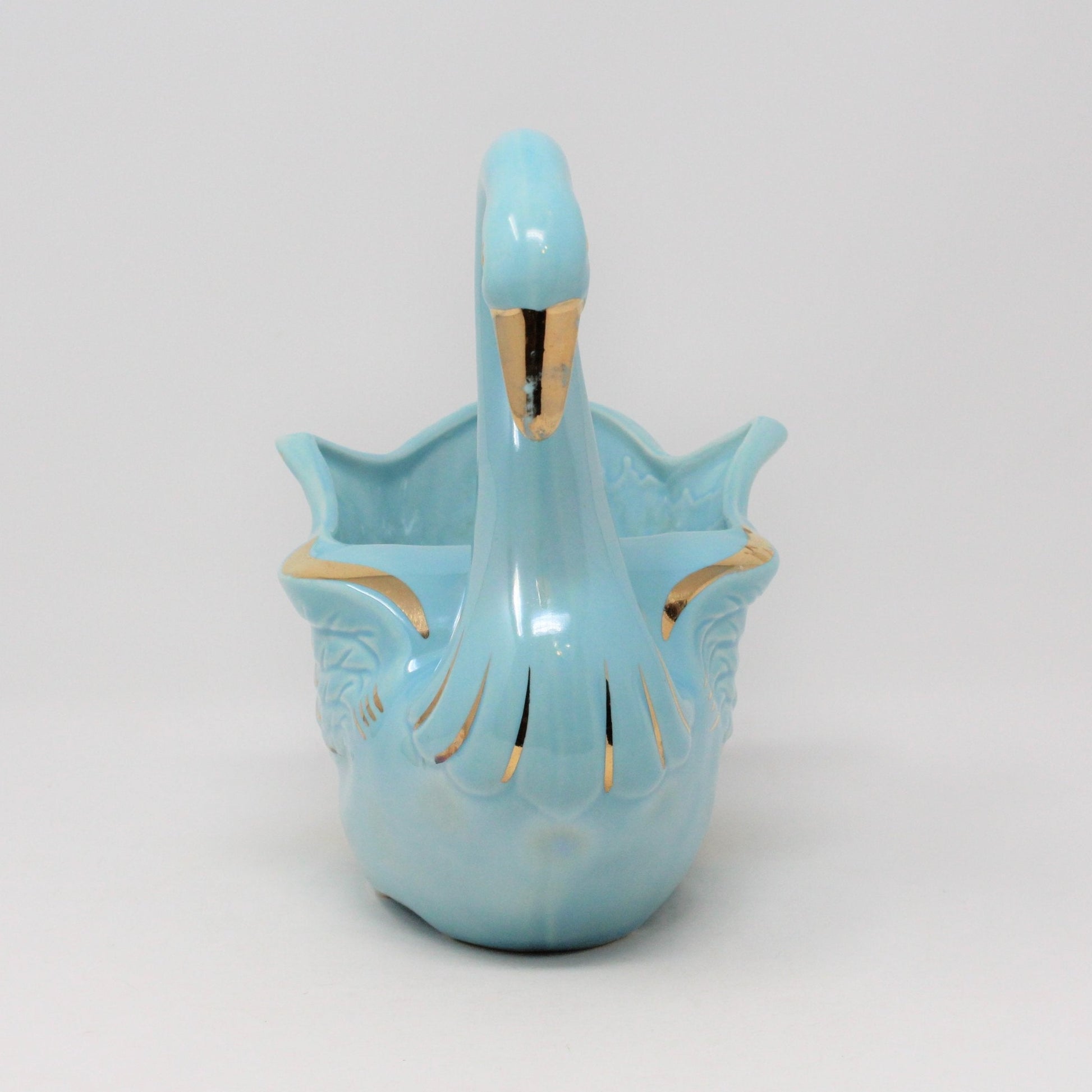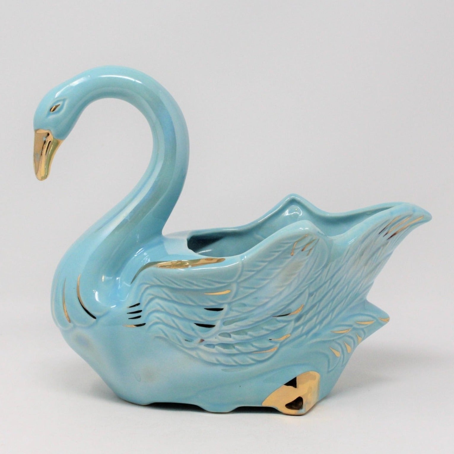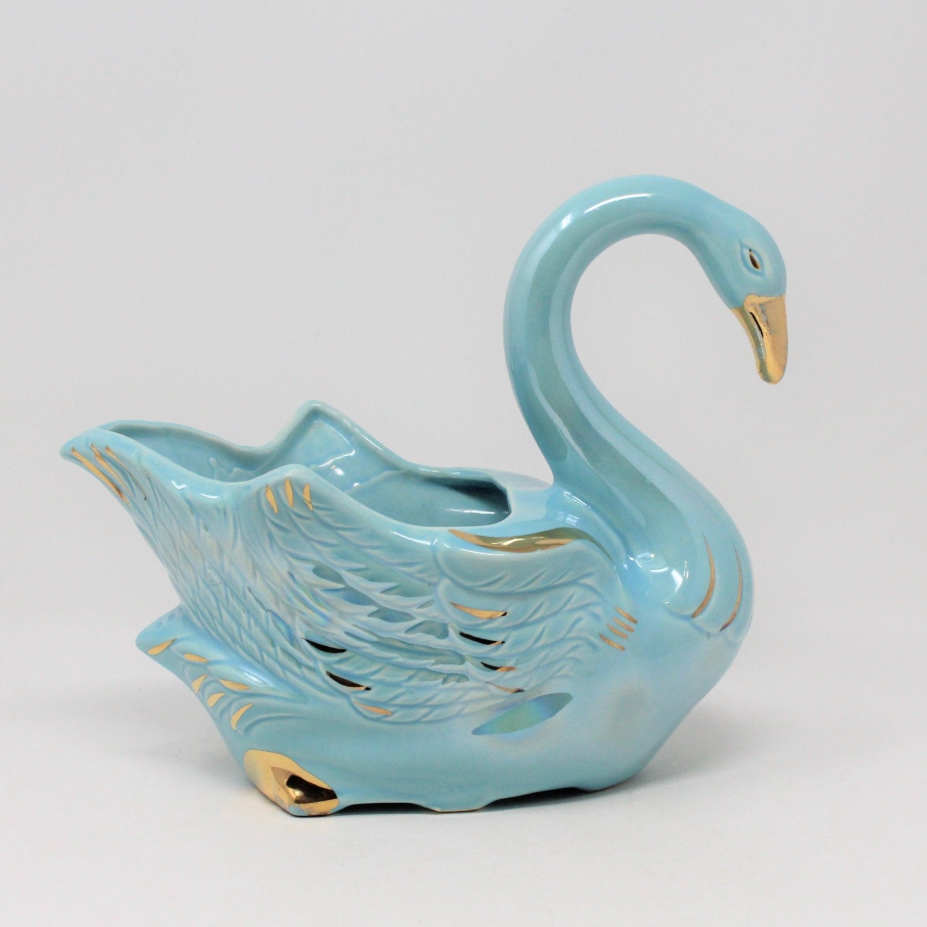 - Details: This is such a lovely planter and in absolutely wonderful vintage condition. This is the large swan, most likely by American Bisque Pottery. It is 8 inches tall, looks graceful and regal. It has a wonderful pastel blue, with an iridescent finish. There are lots of gold accents, wonderful detail, and finished with a high gloss glaze. There is no drainage hole so perfect used as a cachepot or vase. There are no makers marks but after some research we are pretty sure this is by American Bisque Pottery due to the mold wedges and other unique characteristics. American Bisque pieces are hard to find, many may sell them but rarely identify them as American Bisque. Great gift for a pottery collector or an American Bisque collector! Would look lovely as an accent / decor piece in the home.