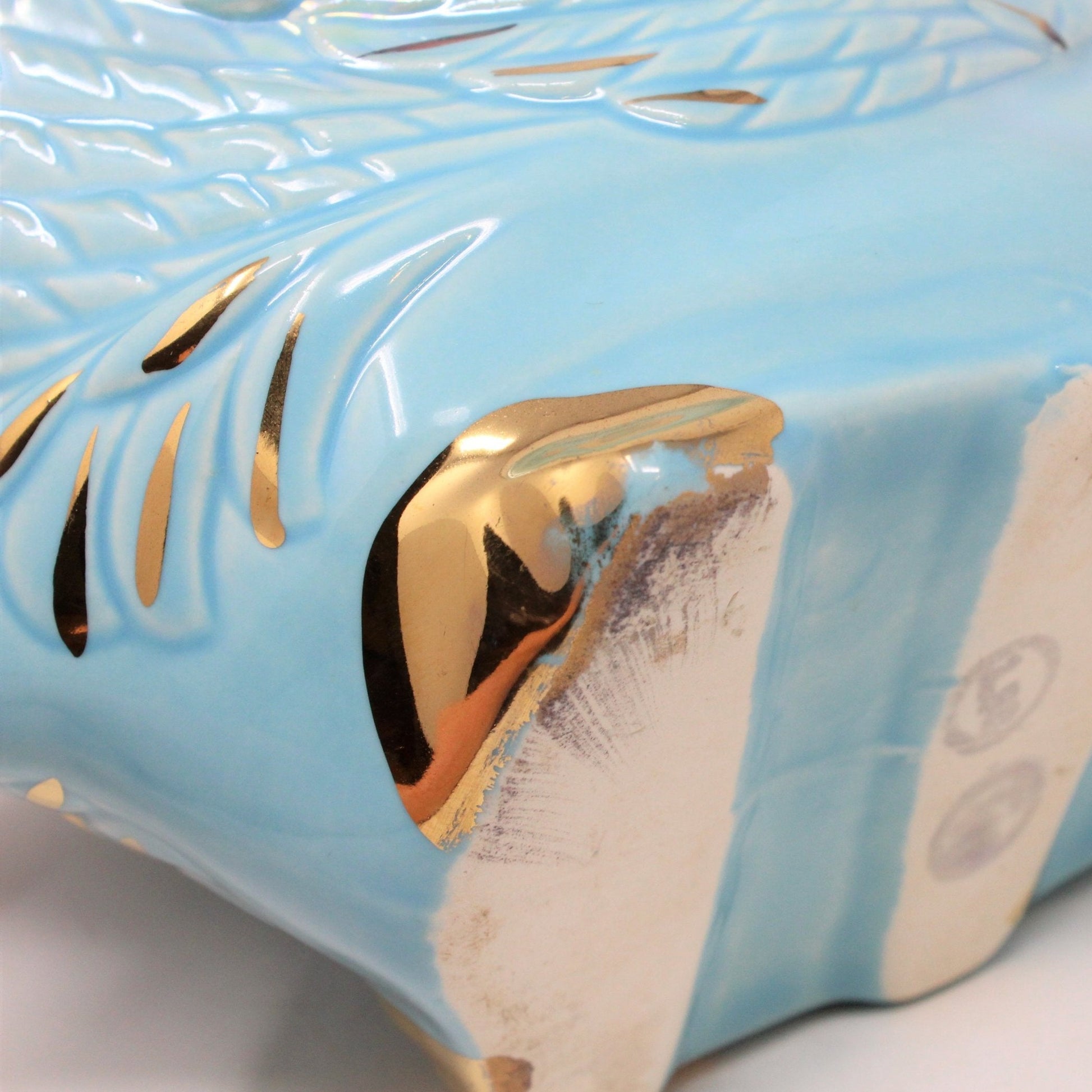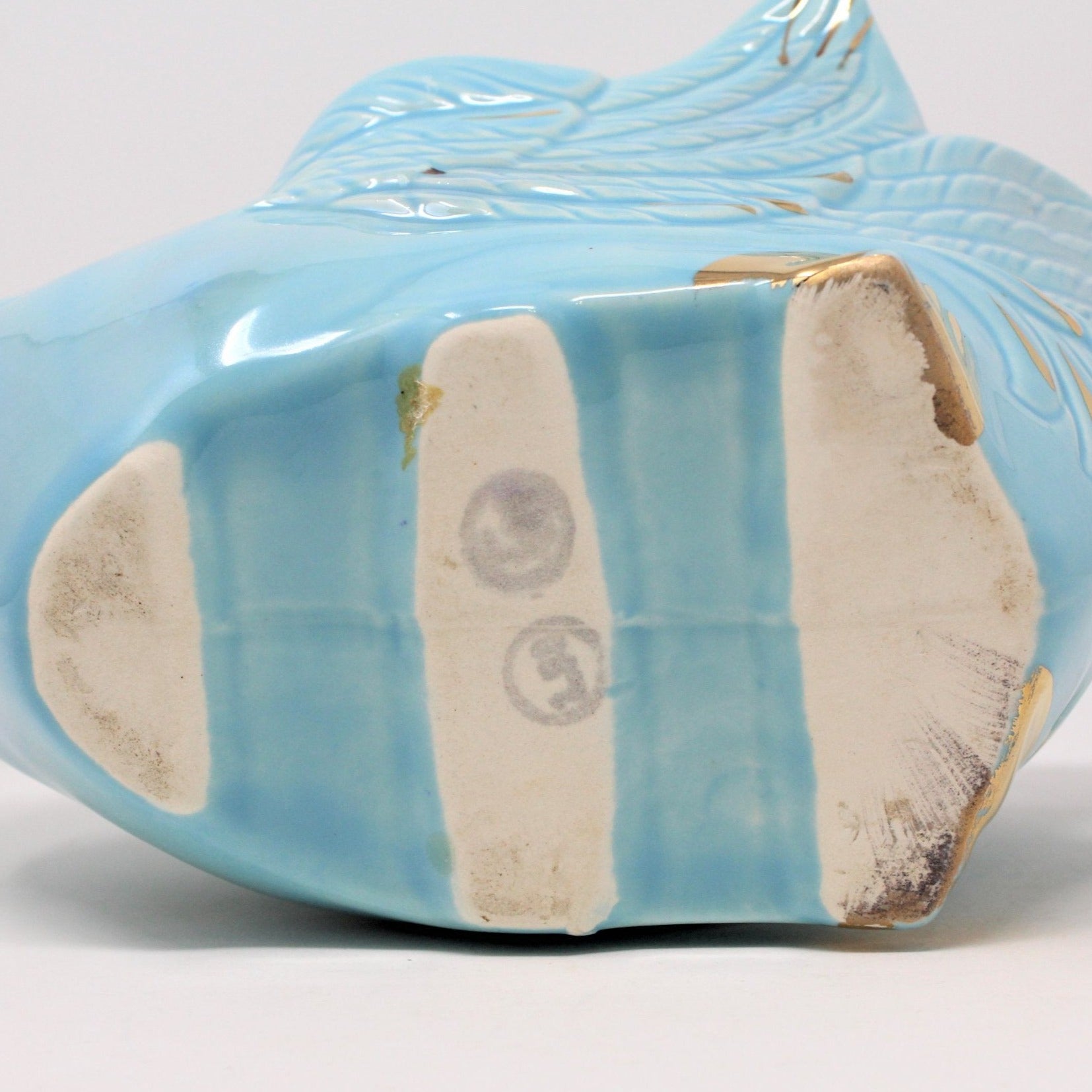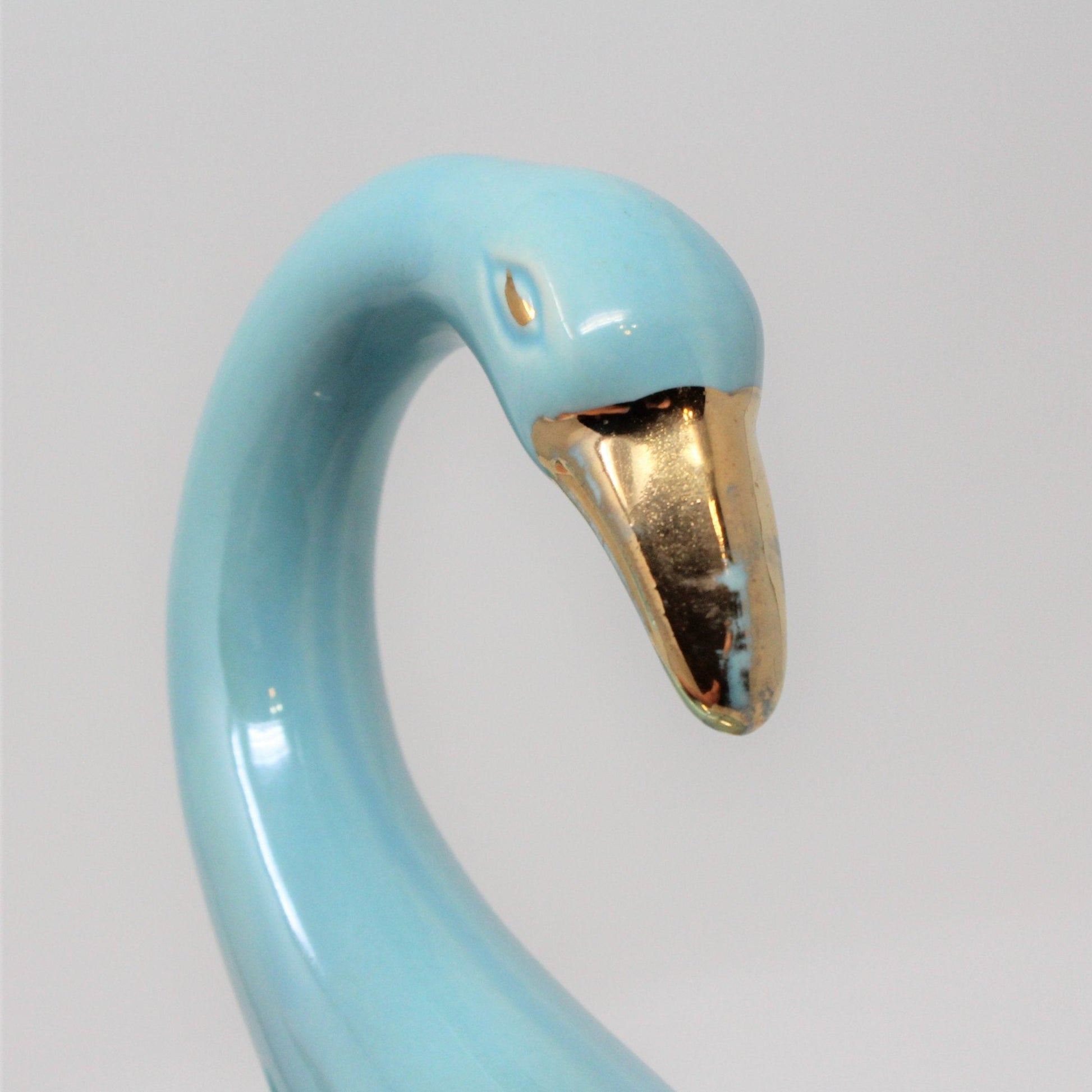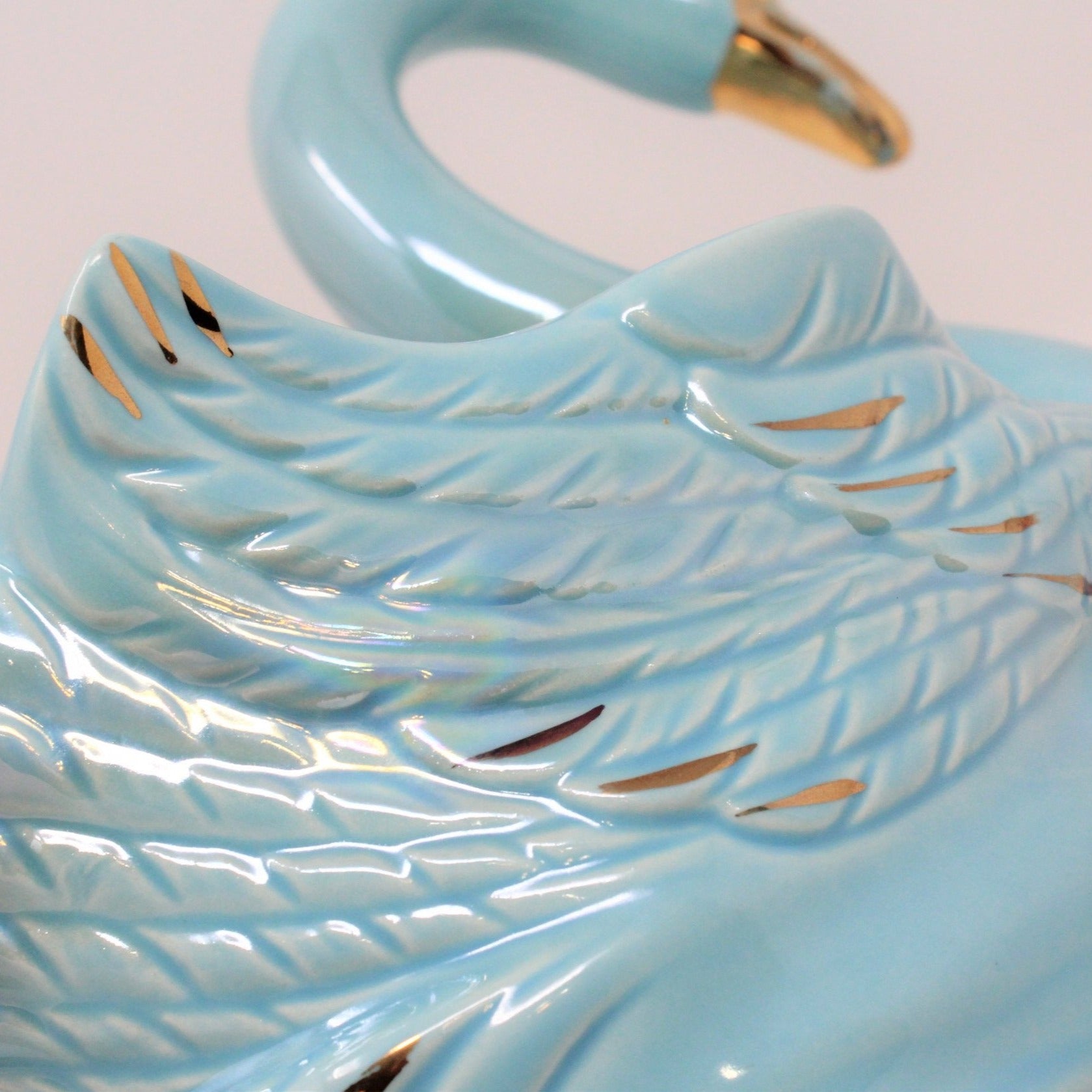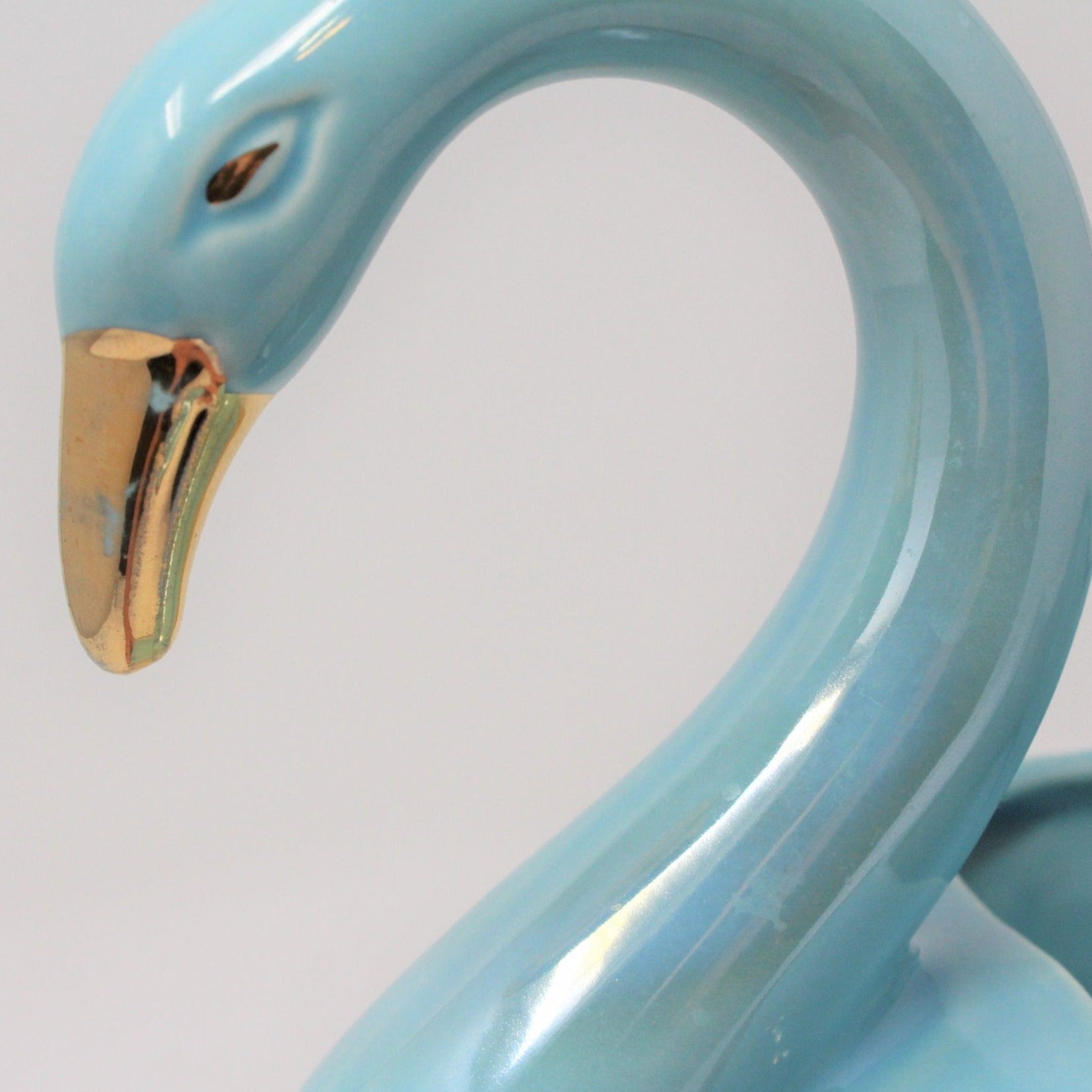 - Details: This is such a lovely planter and in absolutely wonderful vintage condition. This is the large swan, most likely by American Bisque Pottery. It is 8 inches tall, looks graceful and regal. It has a wonderful pastel blue, with an iridescent finish. There are lots of gold accents, wonderful detail, and finished with a high gloss glaze. There is no drainage hole so perfect used as a cachepot or vase. There are no makers marks but after some research we are pretty sure this is by American Bisque Pottery due to the mold wedges and other unique characteristics. American Bisque pieces are hard to find, many may sell them but rarely identify them as American Bisque. Great gift for a pottery collector or an American Bisque collector! Would look lovely as an accent / decor piece in the home.