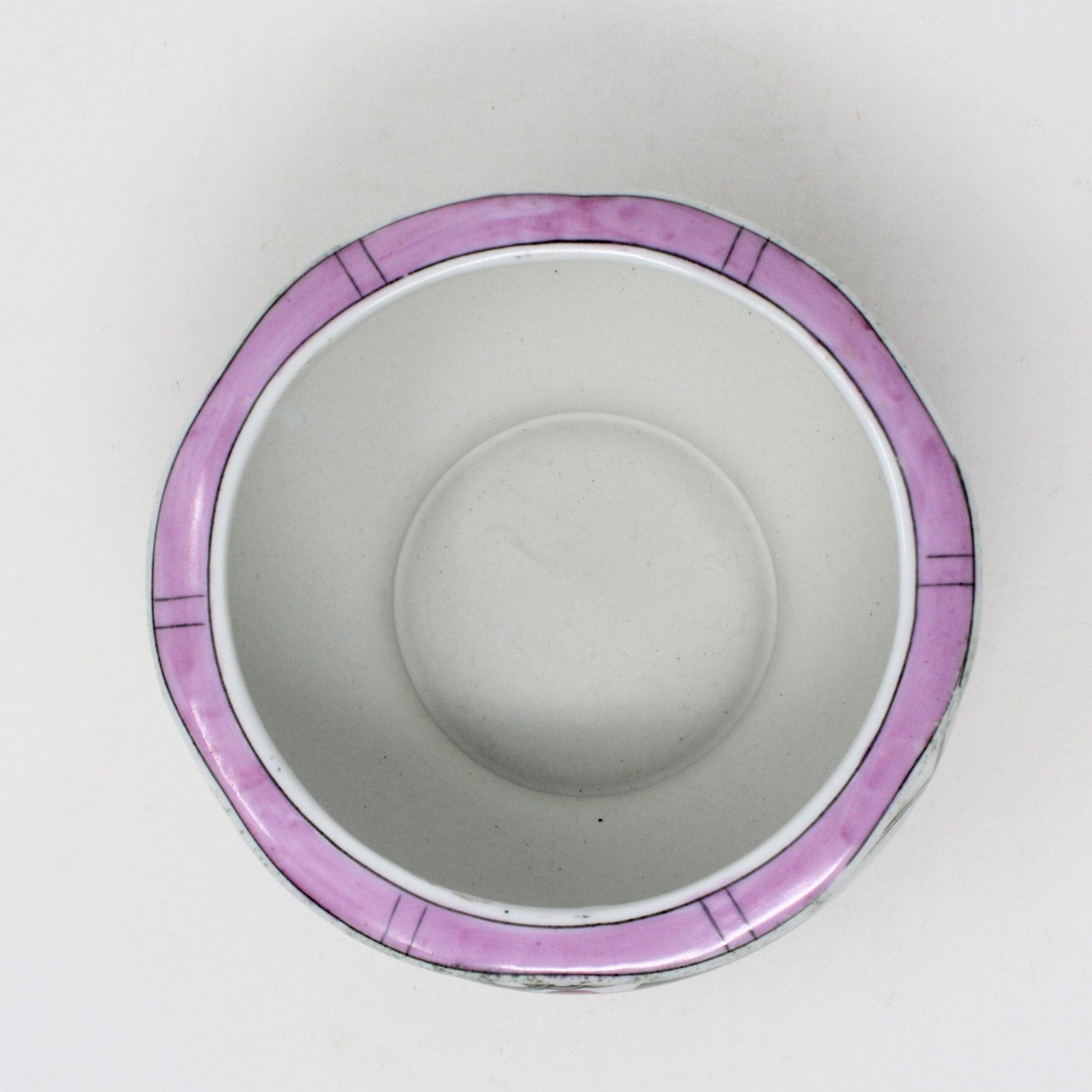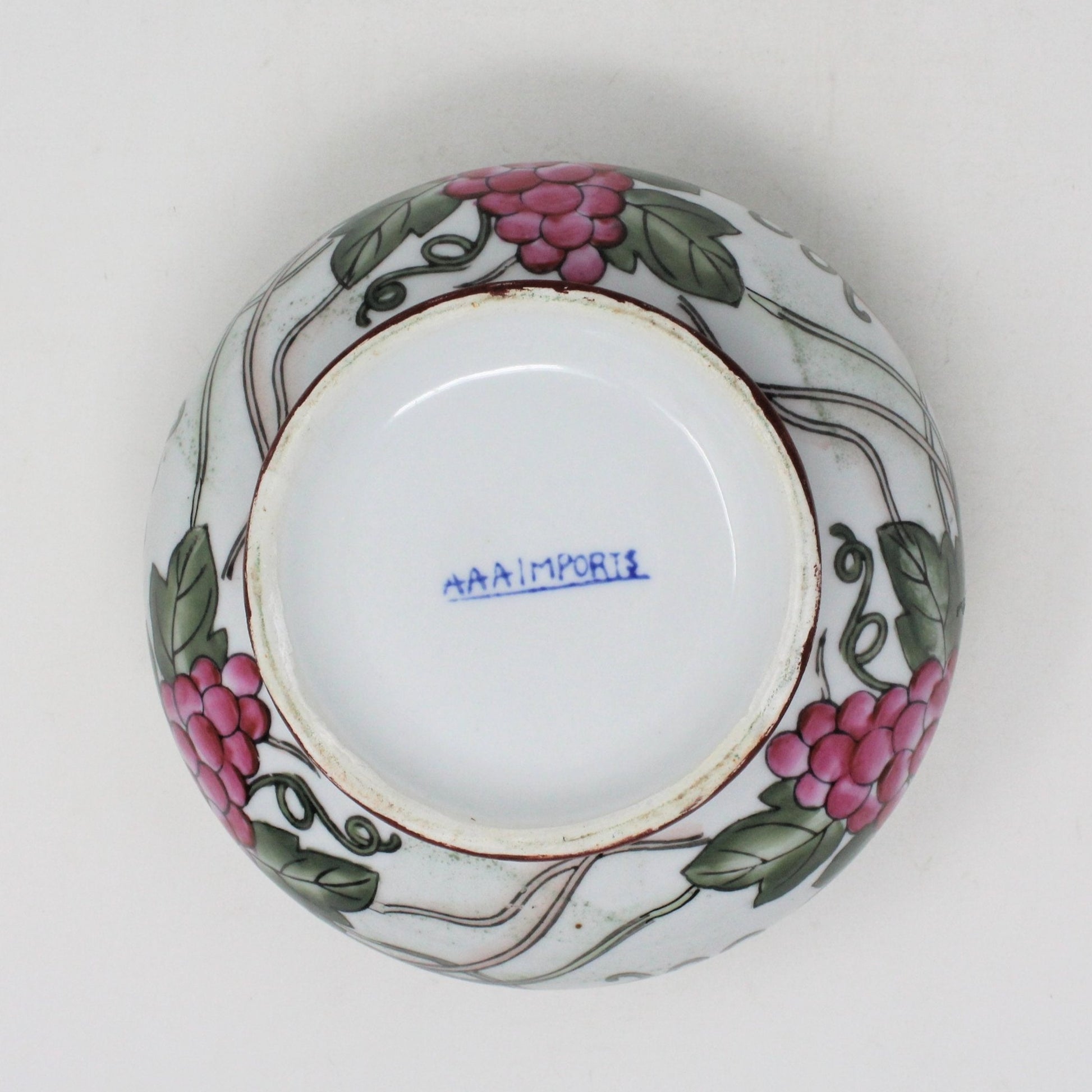 - Details: This is a very pretty planter / cache pot, with a brightly colored grapevine and grape clusters in deep pink and dark green. It is a footed pot, the foot has a thick wine-red colored band, the top rim has a pink swirled band. There is no drainage hole, so perfect used as a planter with stones on the bottom, a cachet pot or vase. The bottom is stamped: "AAA Imports", this is their older word-mark used prior to 2001. In February 2001 they submitted a new logo/trademark "Decoware Fine Pottery". Would make a pretty pot for orchids or a bonsai tree. Great addition to a sun-room, patio, garden or inside the house to hold flowers or greenery (faux or real). Lovely gift with an orchid for Mother's Day, or any other special occasion.