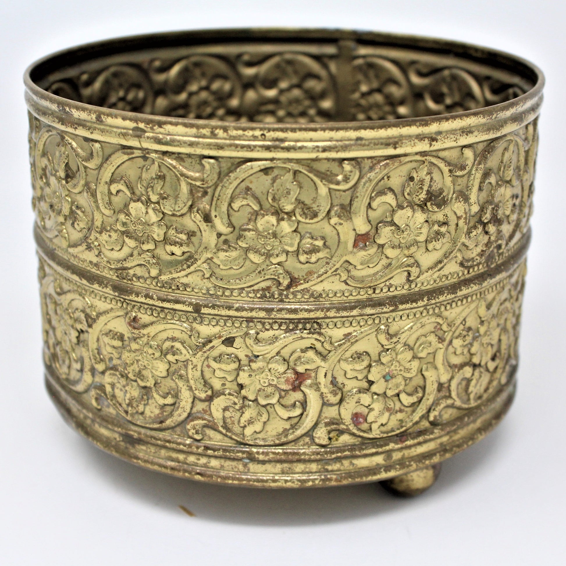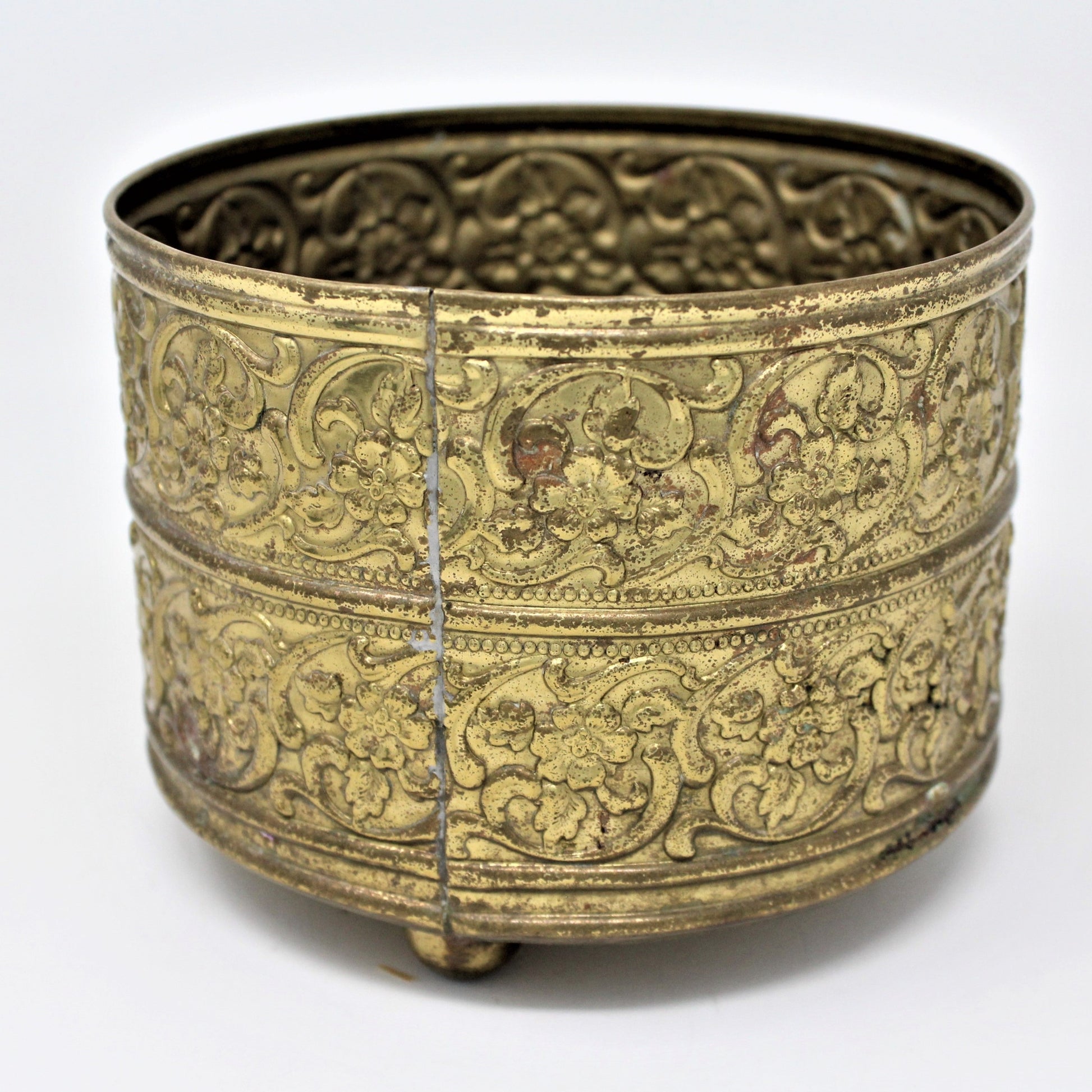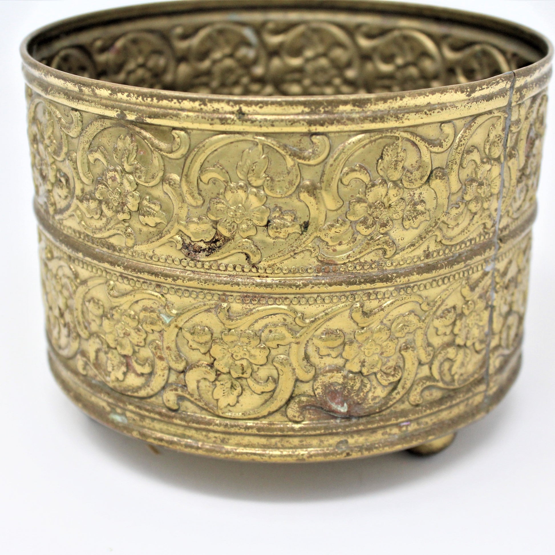 - Vintage Brass Planter / Cachet Pot, Footed, Embossed Blossoms, Round Pot, Oriental Asian Decor, Boho Decor, Vintage Collectibles, (Discontinued)
