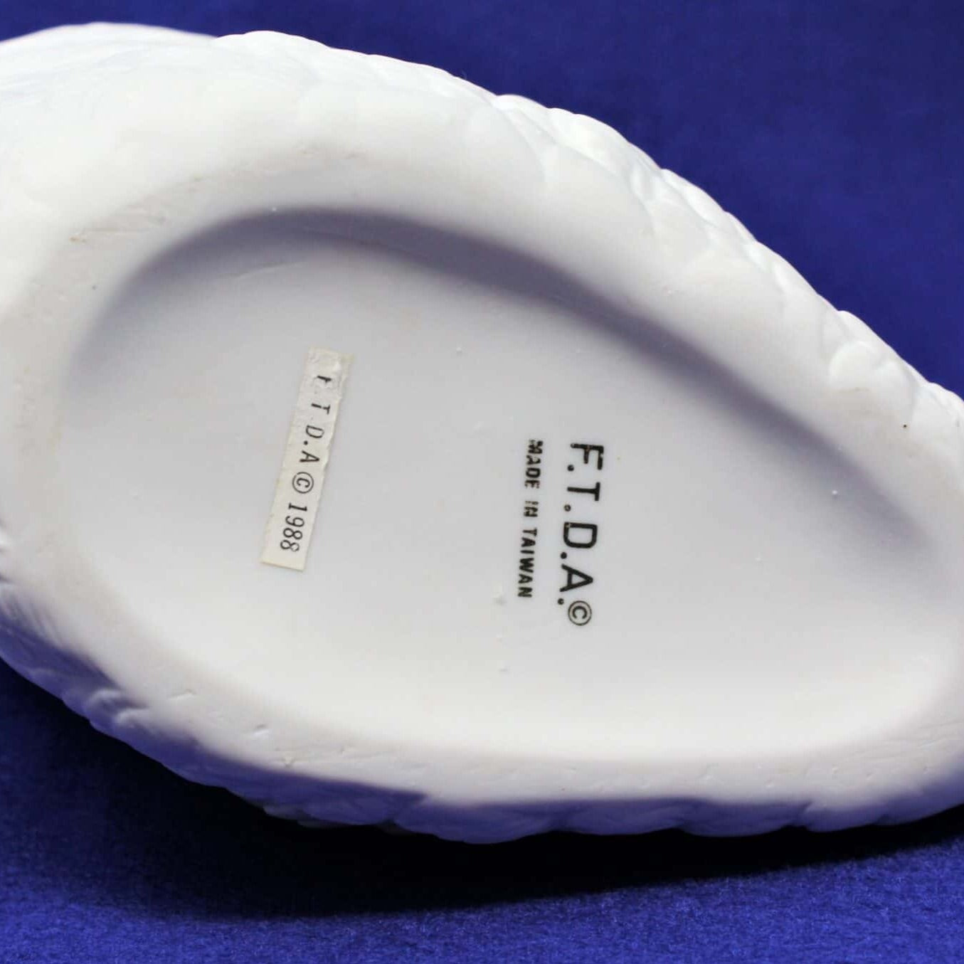 • Details: This is a beautiful porcelain Swan planter in a matte bisque finish that's sure to bring complements.  The detail on this piece is excellent with each feather very well defined.  The face on the swan is sweet, great detail, looks as graceful and regal as the real swans.  The bottom is stamped: "F.T.D.A., Made in Taiwan".  It retains its original paper sticker that reads: "FDTA 1988".  There are so many great uses for this planter, because it doesn't have a drainage hole it can also be used as a vase or cachepot, candy dish or to store small items.  It is an FTD collectible planter, beautiful addition for a sunroom or patio.  Perhaps in a guest bath with folded hand towels or anywhere with a real or faux plant inside.  Would make a great hostess or get-well gift with a pretty plant.  Great decor for wedding, bridal shower or baby shower!