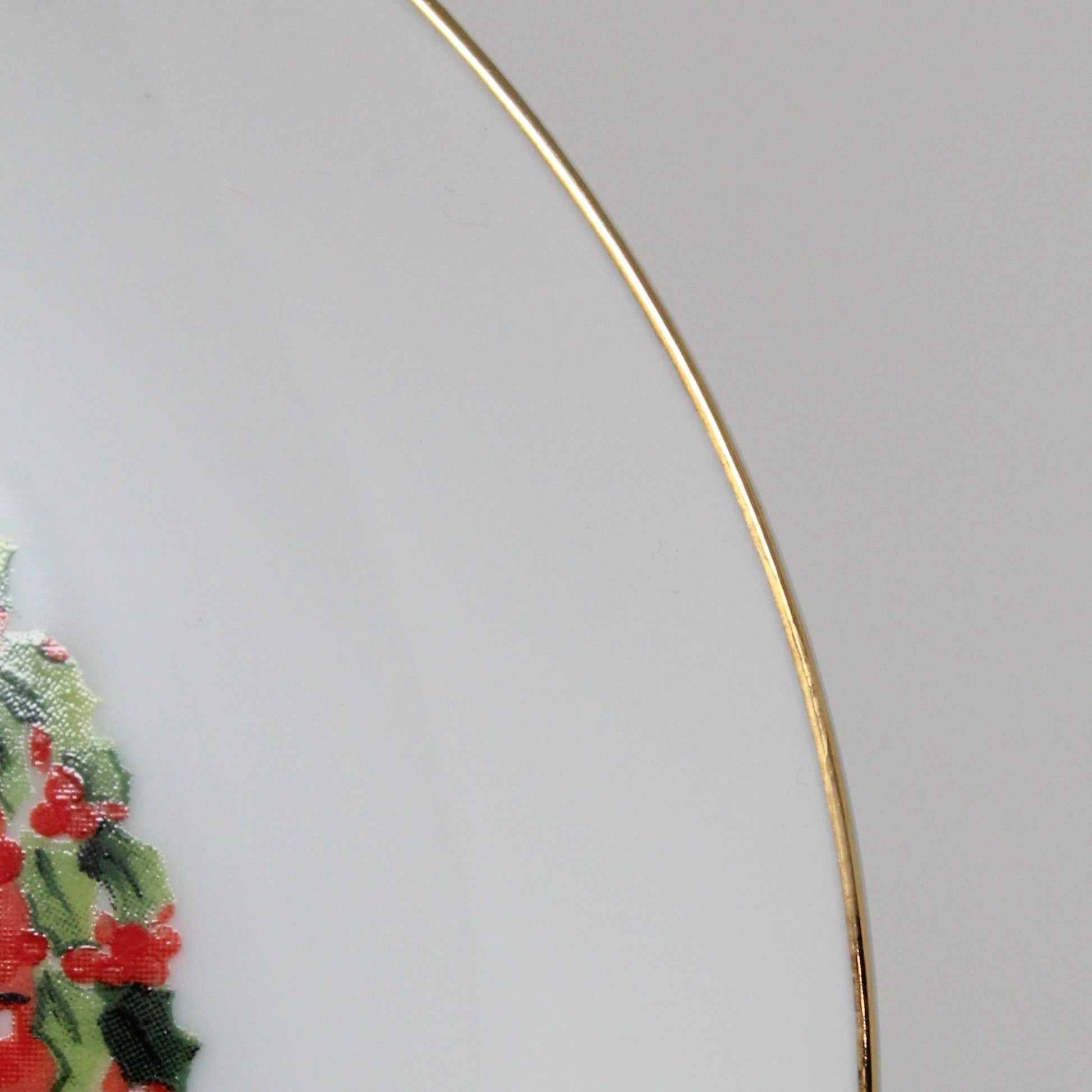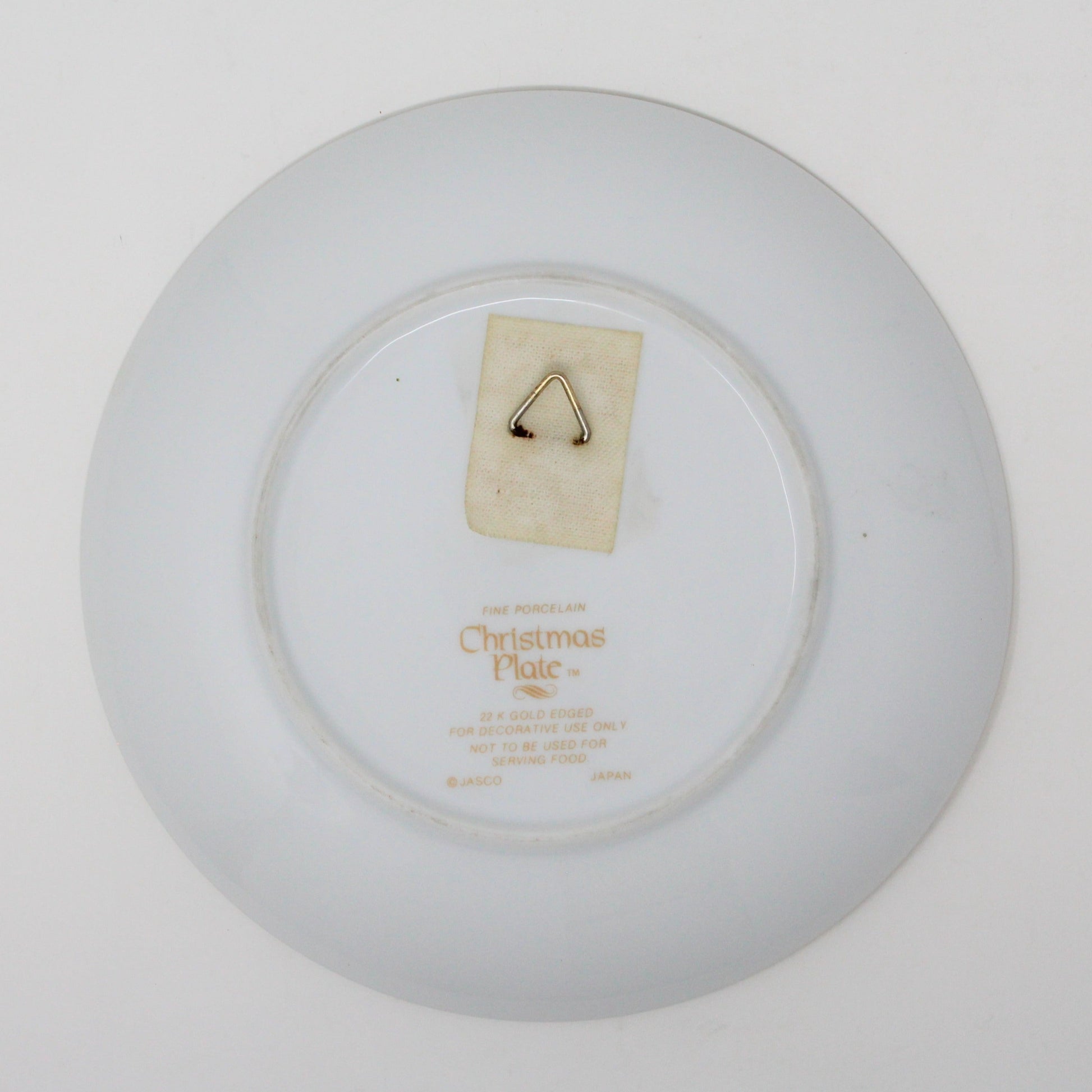 - Details: Such an adorable little plate! A little boy in blue pajamas waiting for Santa to come down the chimney and fill his stocking, hanging by the fireplace. It's a classic scene, we're sure repeated in many homes on Christmas Eve. The colors are bright cheery, perfect for the holidays! It is stamped on the back: "Fine Porcelain Christmas Plate, 22Kt Gold Rim, For Decorative Use Only Not to be Used for Serving Food, Jasco, Japan". Ready to hang with hook on back, or you can use a plate stand to display. This will fill any little nook and cranny where you need a pop of color and Christmas joy. Perfect for a little boy's room. We carry several other plates, if you would like 3 or more Decorative Plates (mix and match from our entire Decorative Plates section), please Contact Us for 20% off, don't forget to let us know which 3 plates you would like.