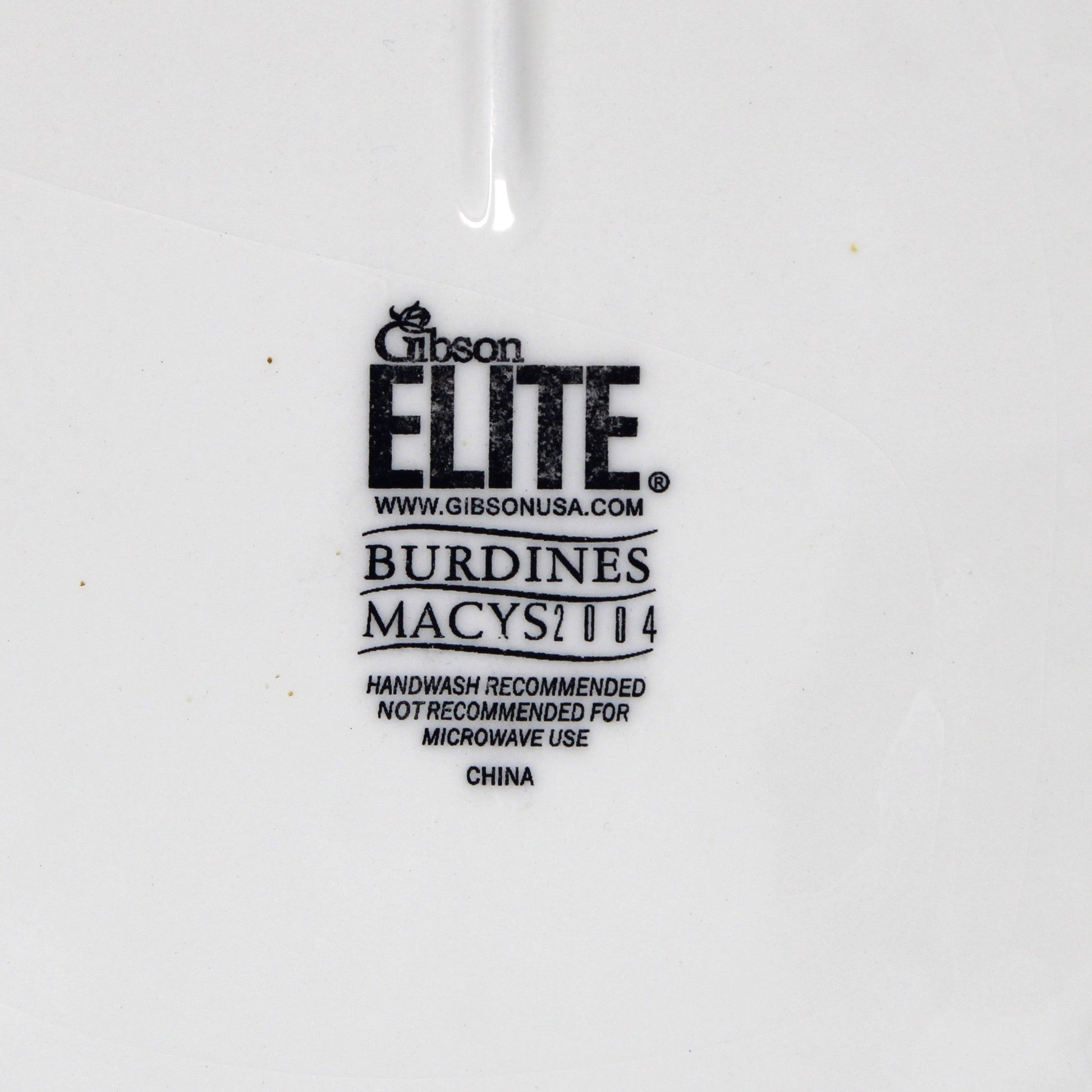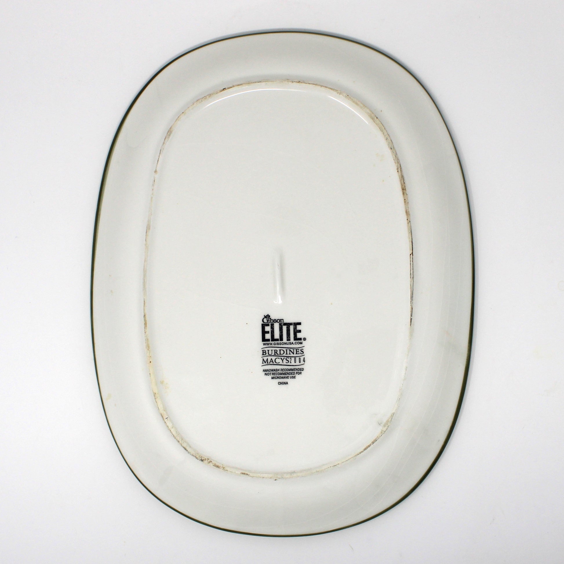 - Details: Fun platter to add to your Christmas holiday table! It definitely has a tropical look, perfect for turning all the holiday festivities into a breezy, tropical escape. This pattern is from Gibson Designs, called "Palm Court" and made exclusively for Burdines-Macy's Stores. Nice size for any holiday table setting or buffet. It is marked Gibson Elite, Made in China. Hand Wash ONLY and NOT for Microwave use. Perfect for serving appetizers, desserts, or holiday treats, it doubles as a conversation-starting décor piece. A delightful gift for anyone who loves mixing seasonal cheer with island-inspired style.