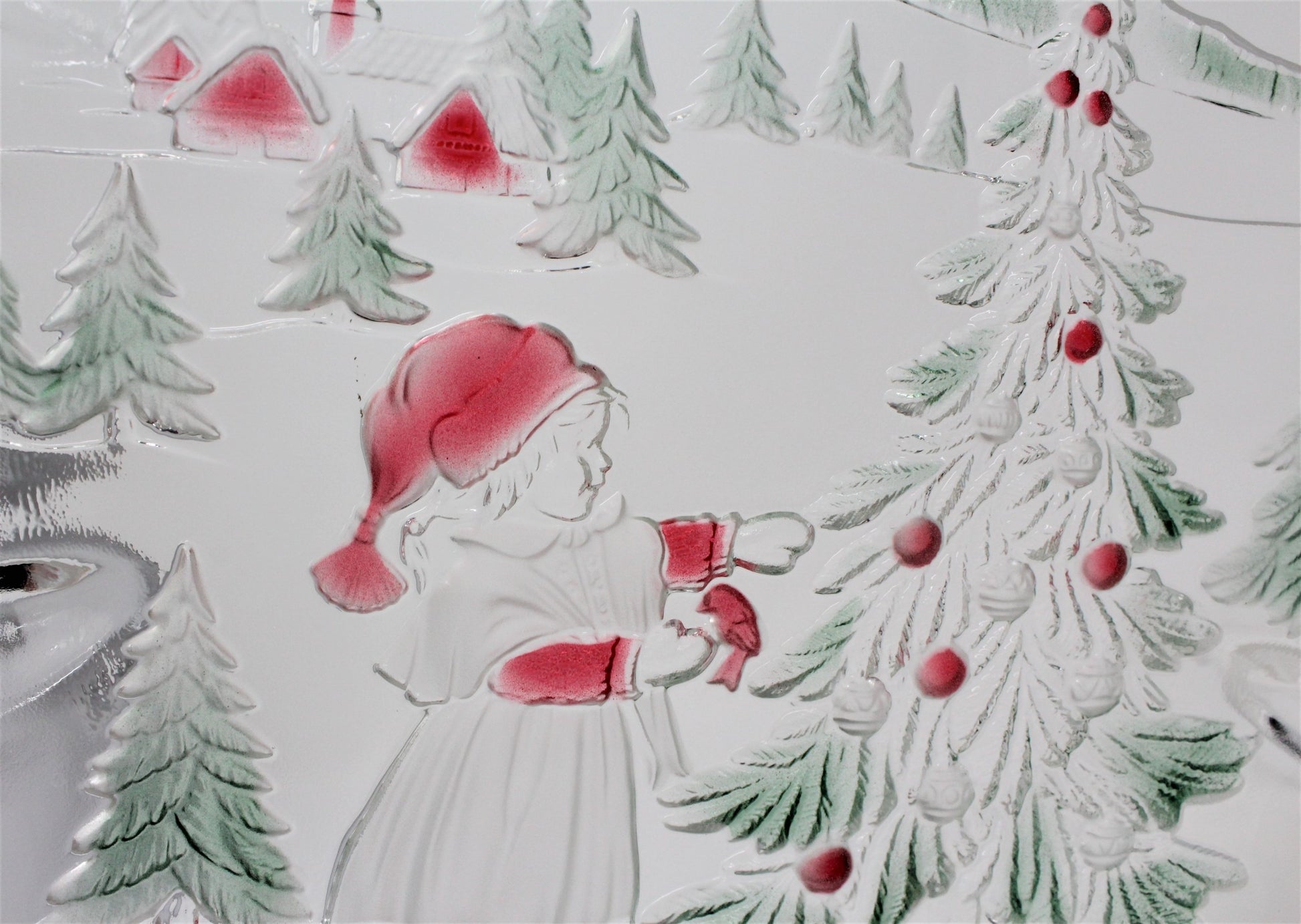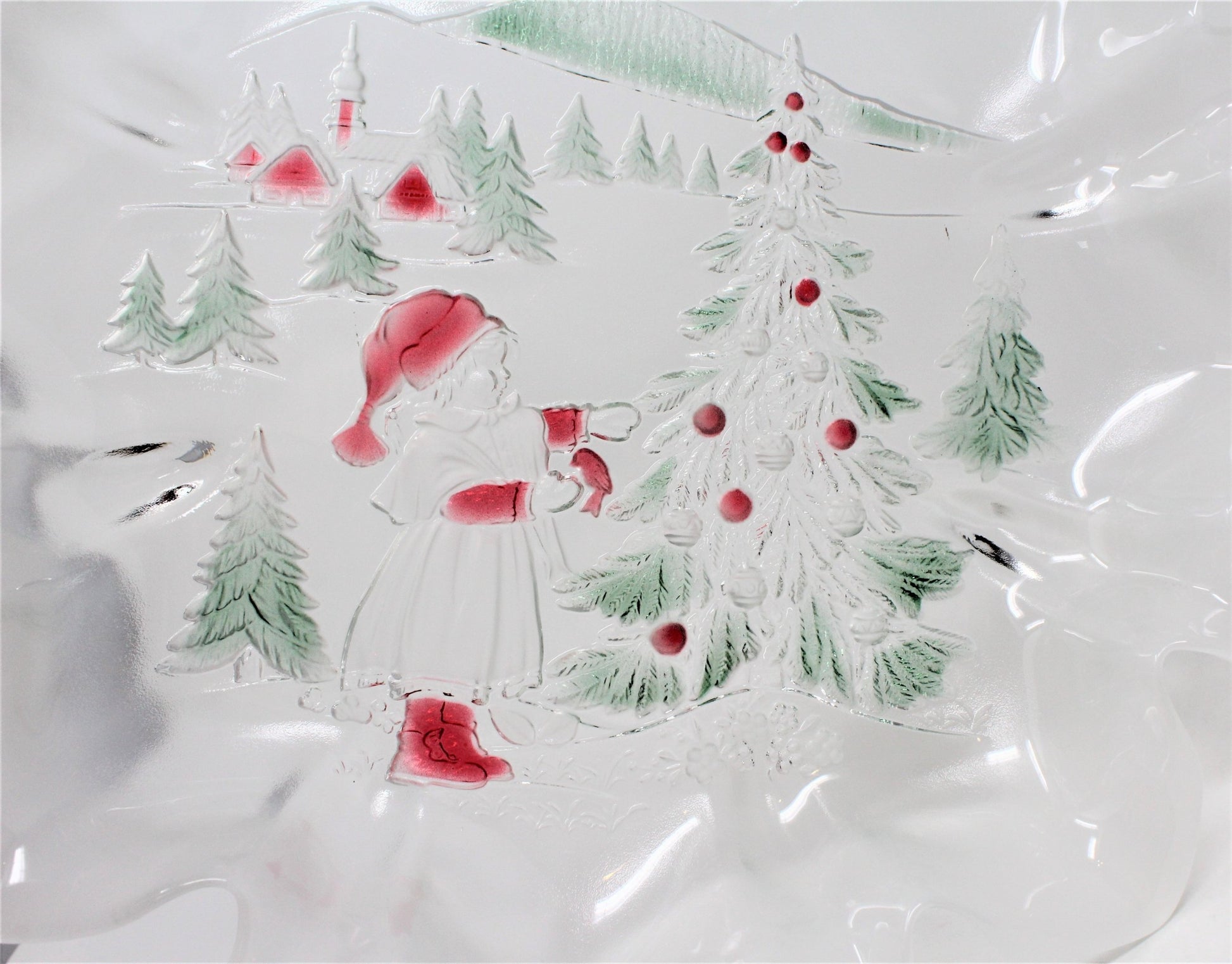 - Details: This is a very elegant serving platter, deep enough to be considered a shallow bowl. There's lots of detail on this winter scene. A girl standing in a green pine tree forest, she has decorated one tree with red and white ornaments. A village is visible in the background with mountains farther in the horizon. The dish has a beautiful scalloped frosted edge. It's from the Mikasa's Christmas Story collection, originally issued in clear glass, later in green & red like this one, and later on with a red or green border. All made by Walther Glass in Germany for Mikasa. This would make a great hostess gift with a home made dessert or cookies. A perfect addition to your Christmas table or Christmas decor.