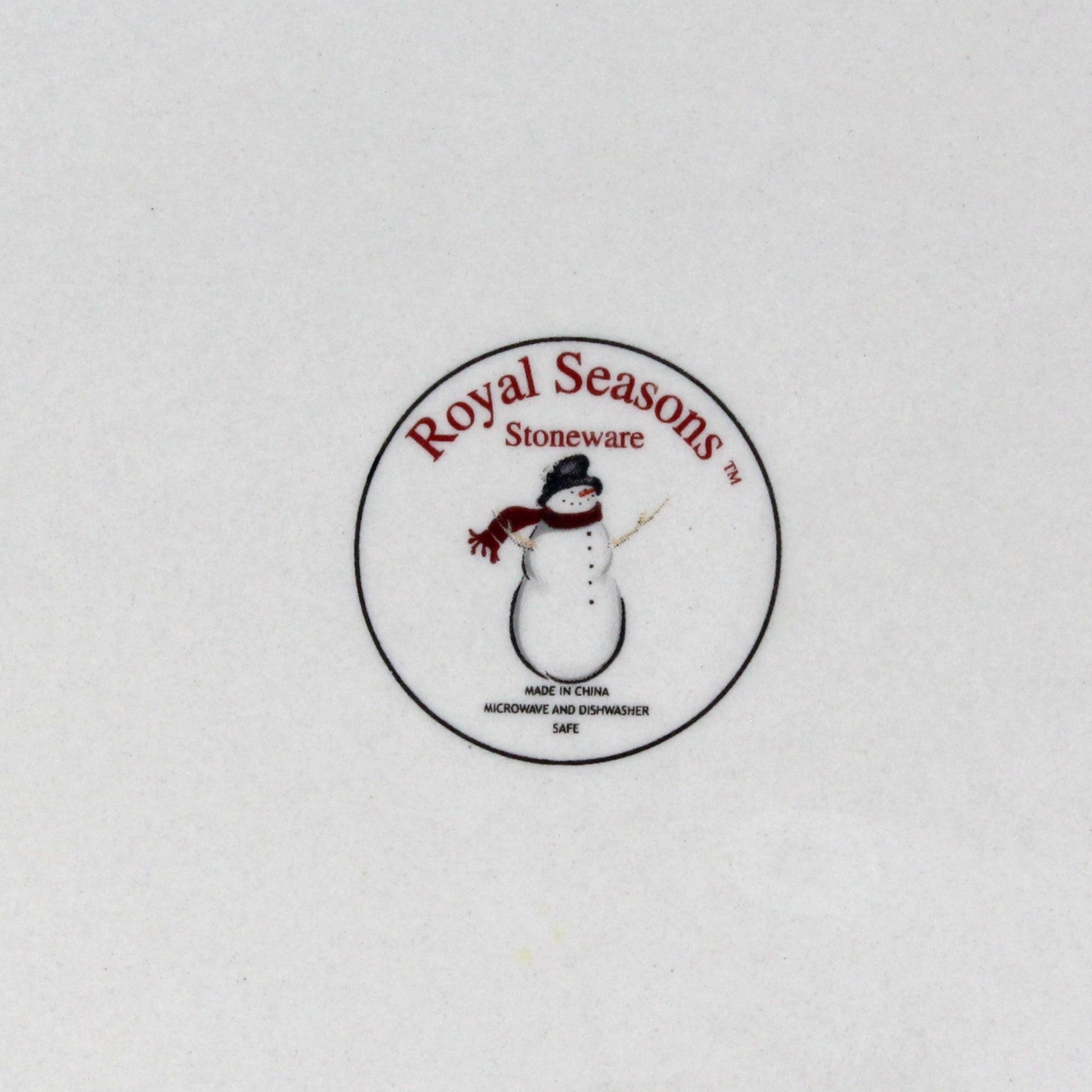 - Details: Fun platter to add to your wintertime table! The pattern has two snowmen wearing burgundy red scarves. The splatter-painted border is also burgundy red with lots of snowflakes all around. Nice size for any holiday table setting or buffet. It is marked Royal Seasons Stoneware, Made in China. It is microwave and dishwasher safe so easy to clean too!