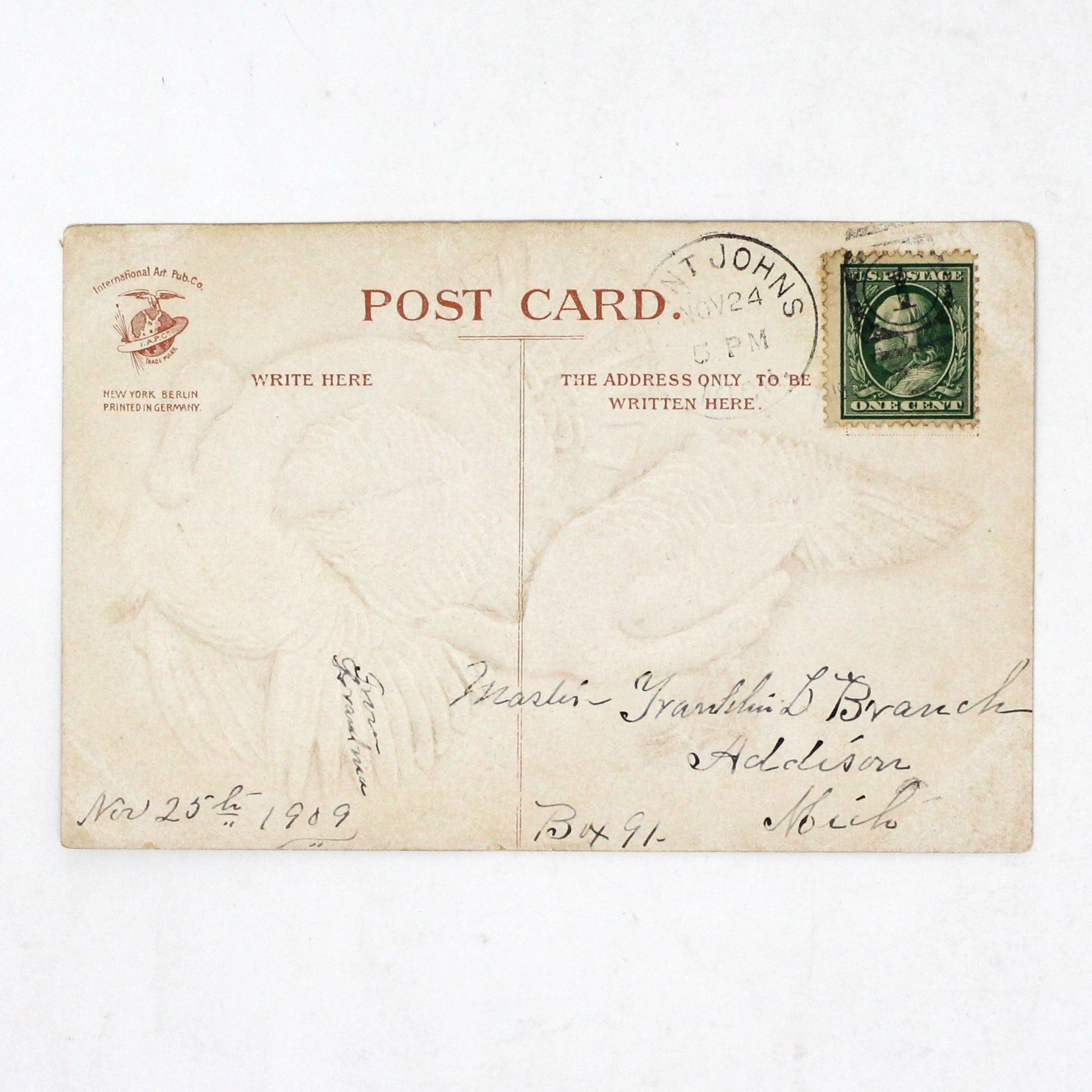 - Details: A highly prized, Original Thanksgiving Postcard. It has a gorgeous, embossed full color illustration of two turkeys, a male in full color plumage and the white female by his side. Wonderful detail and antique font. Printed in Germany, copyright by The International Art Publishing Company. This one is used, has writing on the back in ink, dated Nov 25th, 1909 (from grandma). It has a canceled one cent US Postage stamp. A most generous gift for a postcard collector or framed as part of your Fall / Thanksgiving decor. These look great framed and scattered around your Thanksgiving table or Buffet.
