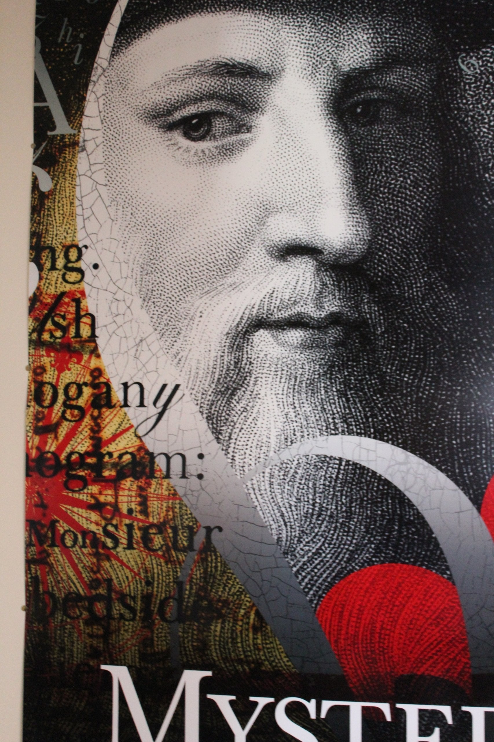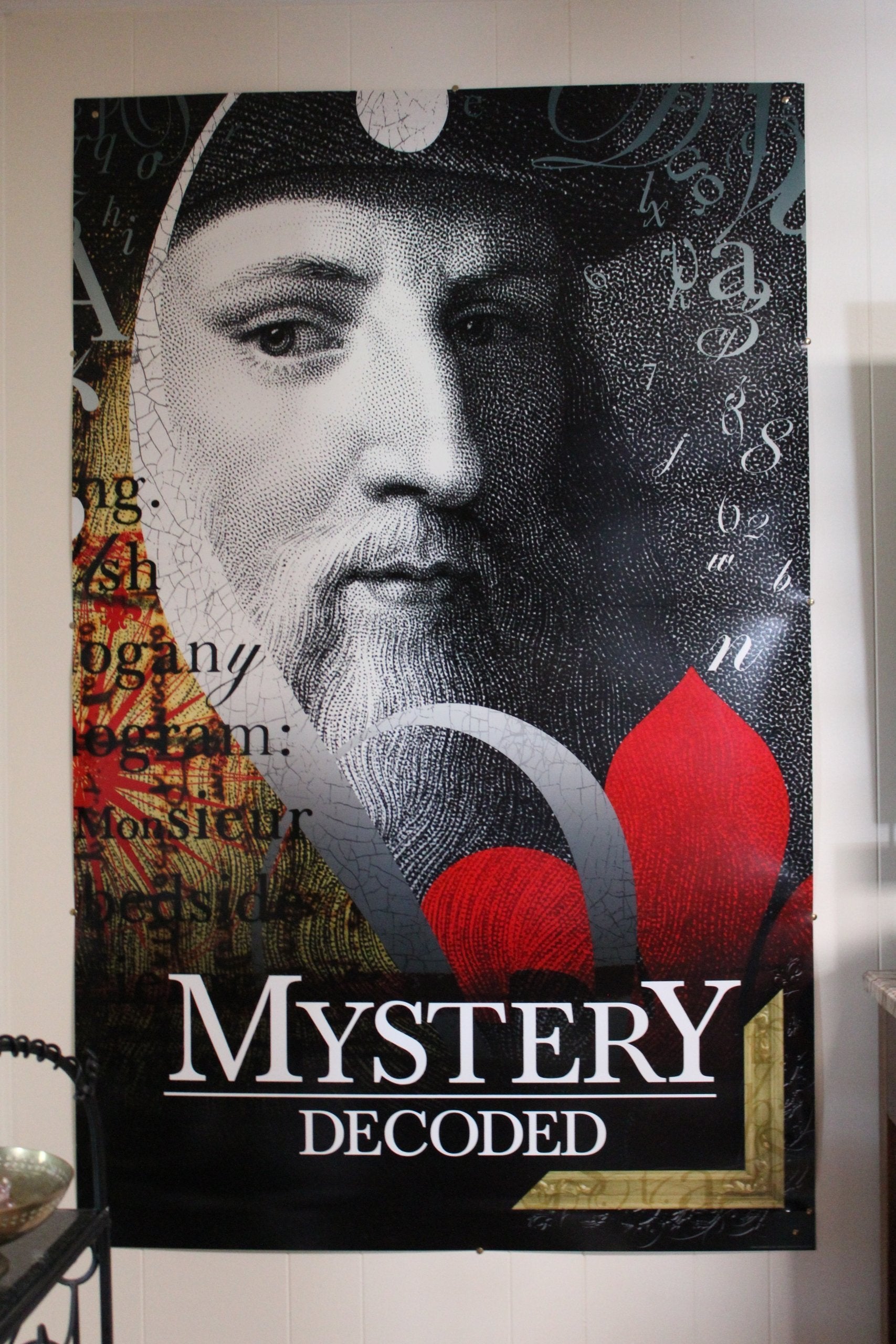 - Details: This store window panel was salvaged from a bookstore, used during a book promotion for The Da Vinci Code. It is very large measuring 63 x 40 inches. It reads: "Mystery Decoded". Made of a plastic laminate, it has a tendency to crack, but it's in good condition. The tacks used to display it were not inserted into the plastic, put rather pinned just outside the piece so only the tack-heads kept the panel in place, there are no tack holes visible. This is a subtle colored image, with lots of fonts and numbers, and of course the DaVinci face, it all exudes a mysterious aura, as intended. Excellent decor for a library, a family room or study. Great for a fan of The Da Vinci Code. If you're in the Northeast Florida, Southeast Georgia area, it may be best to meet and pick these up in person to avoid any damage in transit. If shipping, it will need lots of packaging and we cannot guarantee it will arrive without cracks.