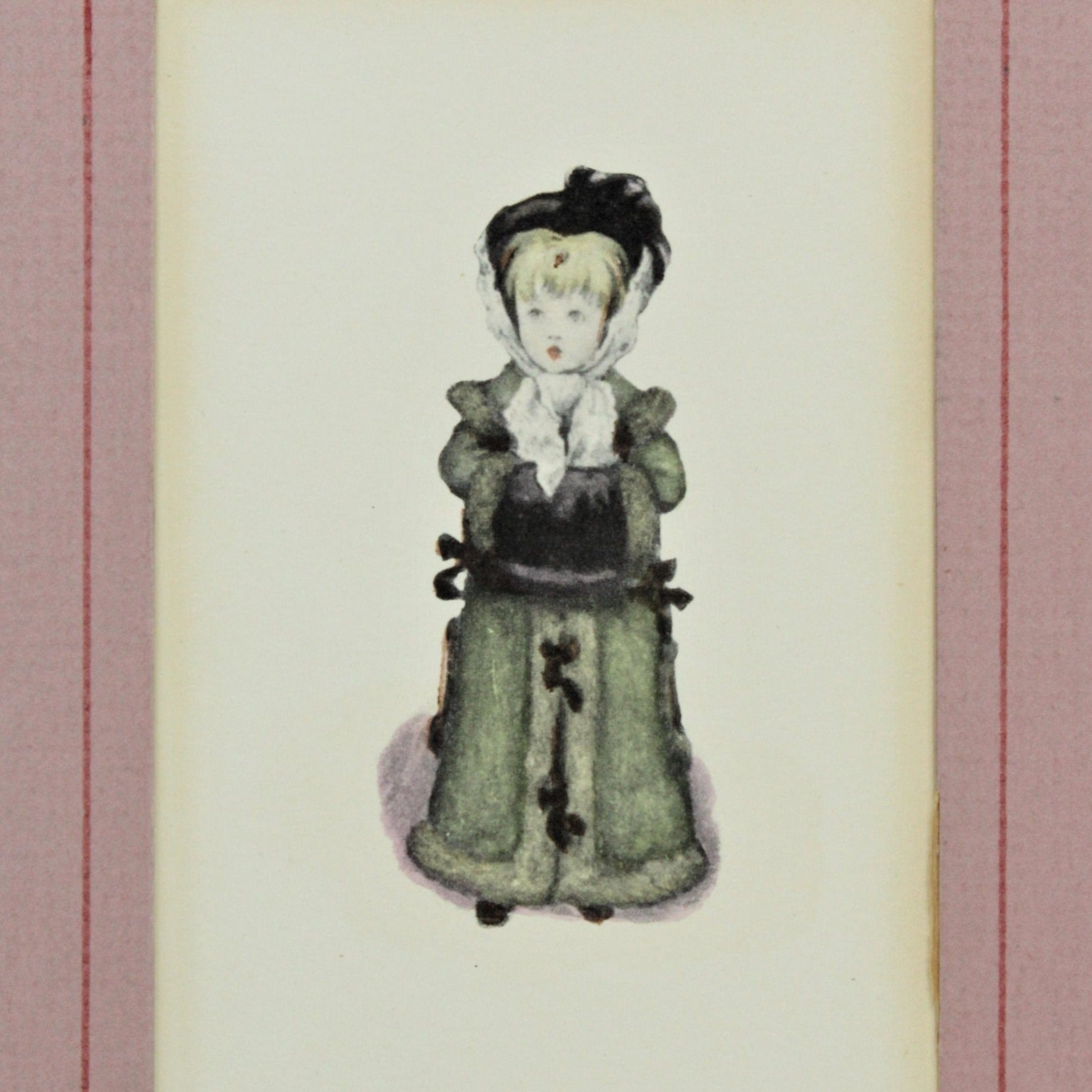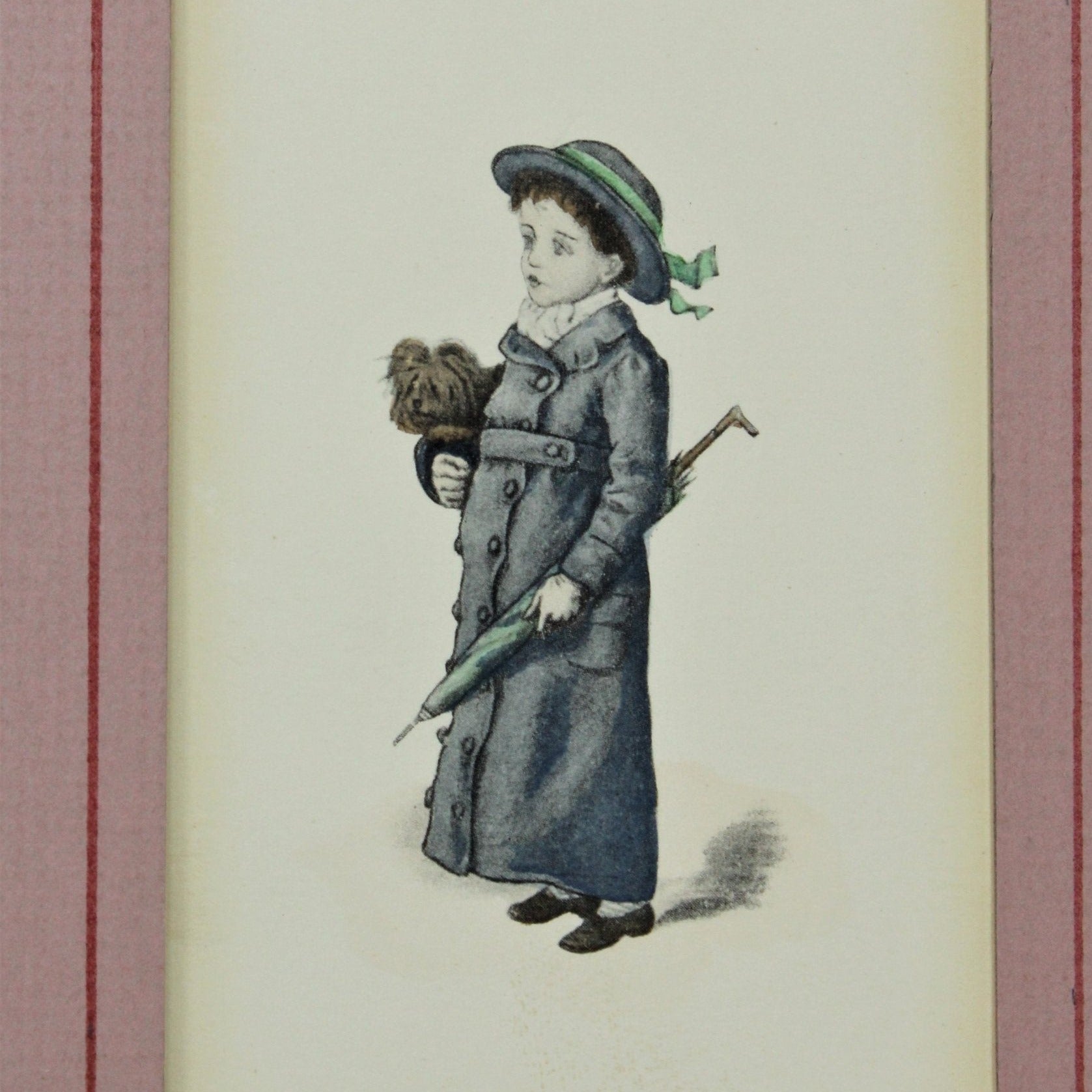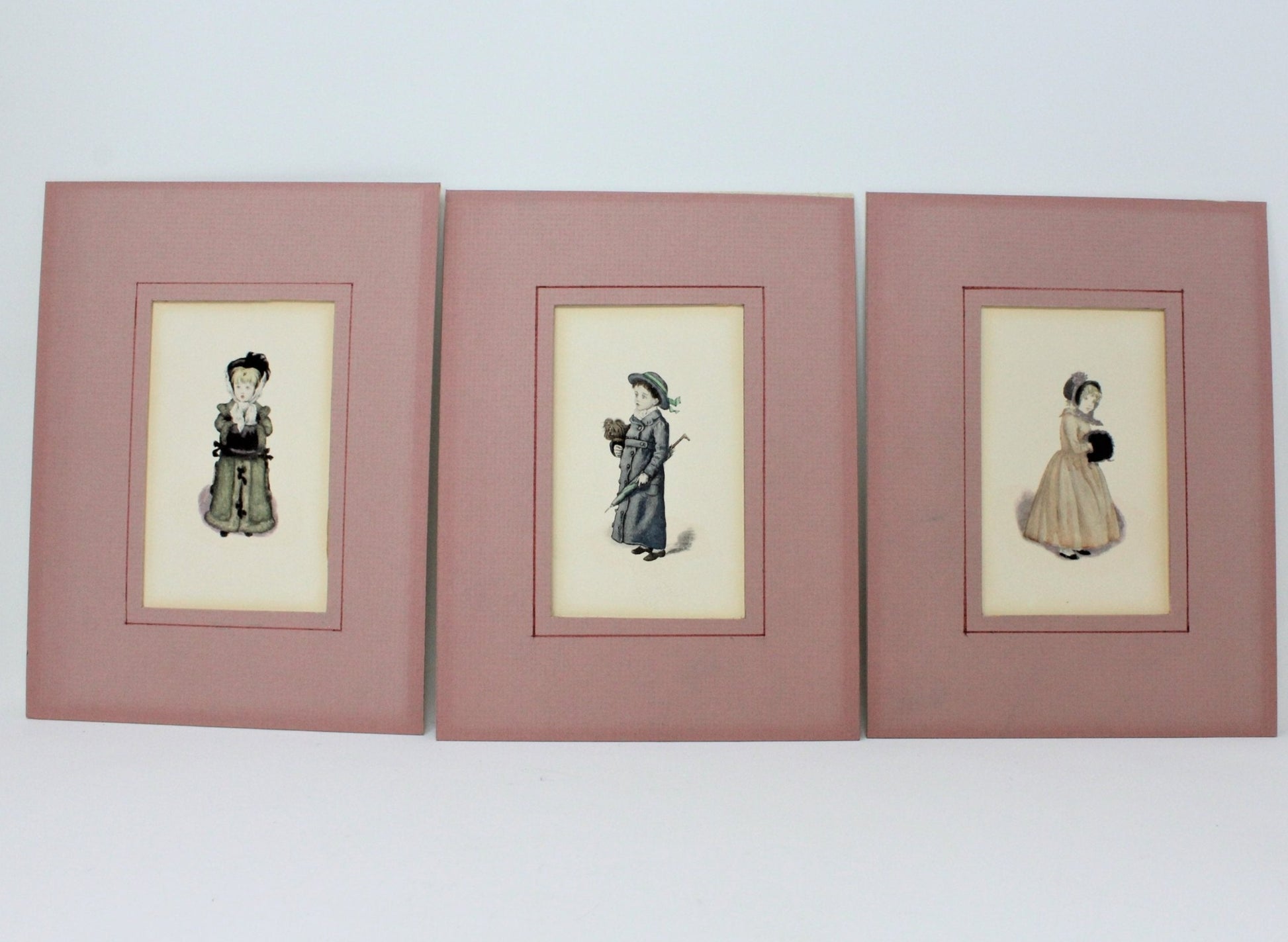 - Details: These three prints are adorable! Three little children dressed in their Victorian best outfits. These are unframed, matted in a rose/pink color matting. The colors on the children are soft and muted, really wonderfully done. We don't know anything about the artist, nor the age (we've estimated, 1970's, could be older), but we think you're going to fall in love with them just like we did. These would look very pretty in a child's room or powder room. The paper is yellowing a bit, best to frame them in order to maintain condition.