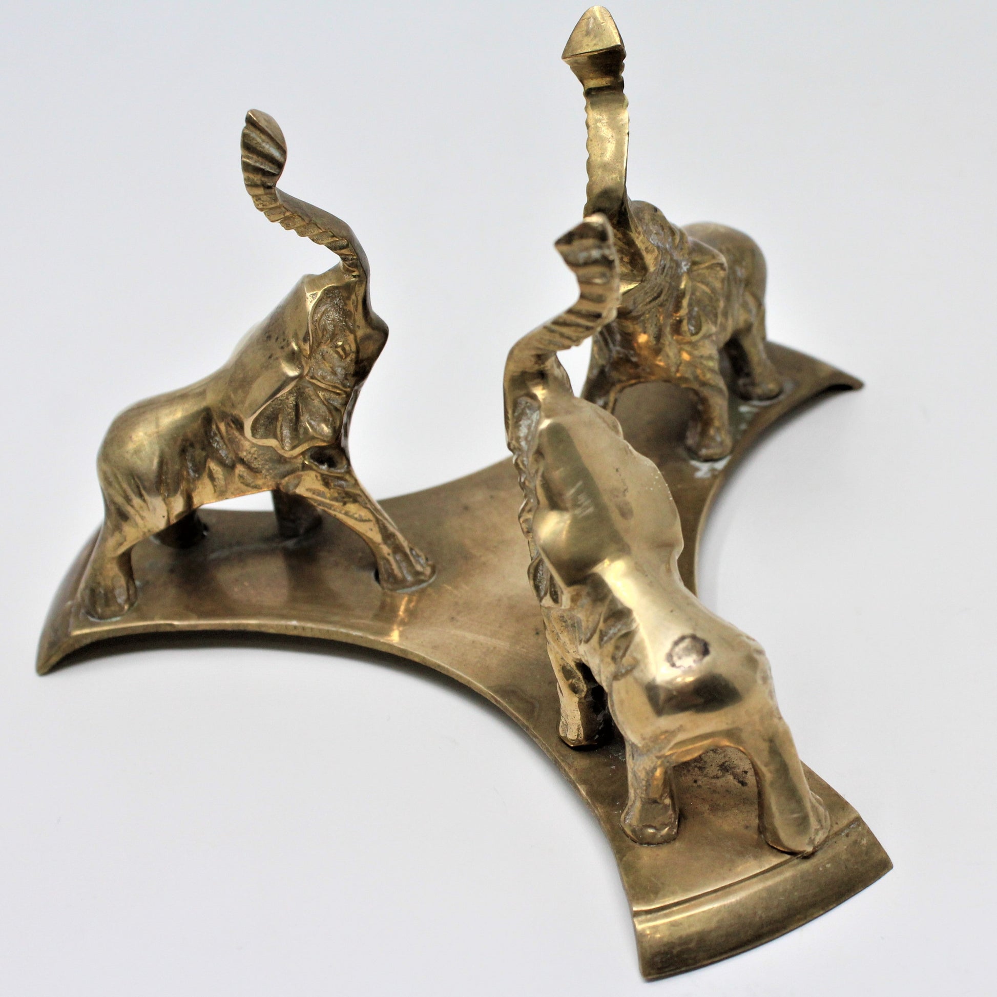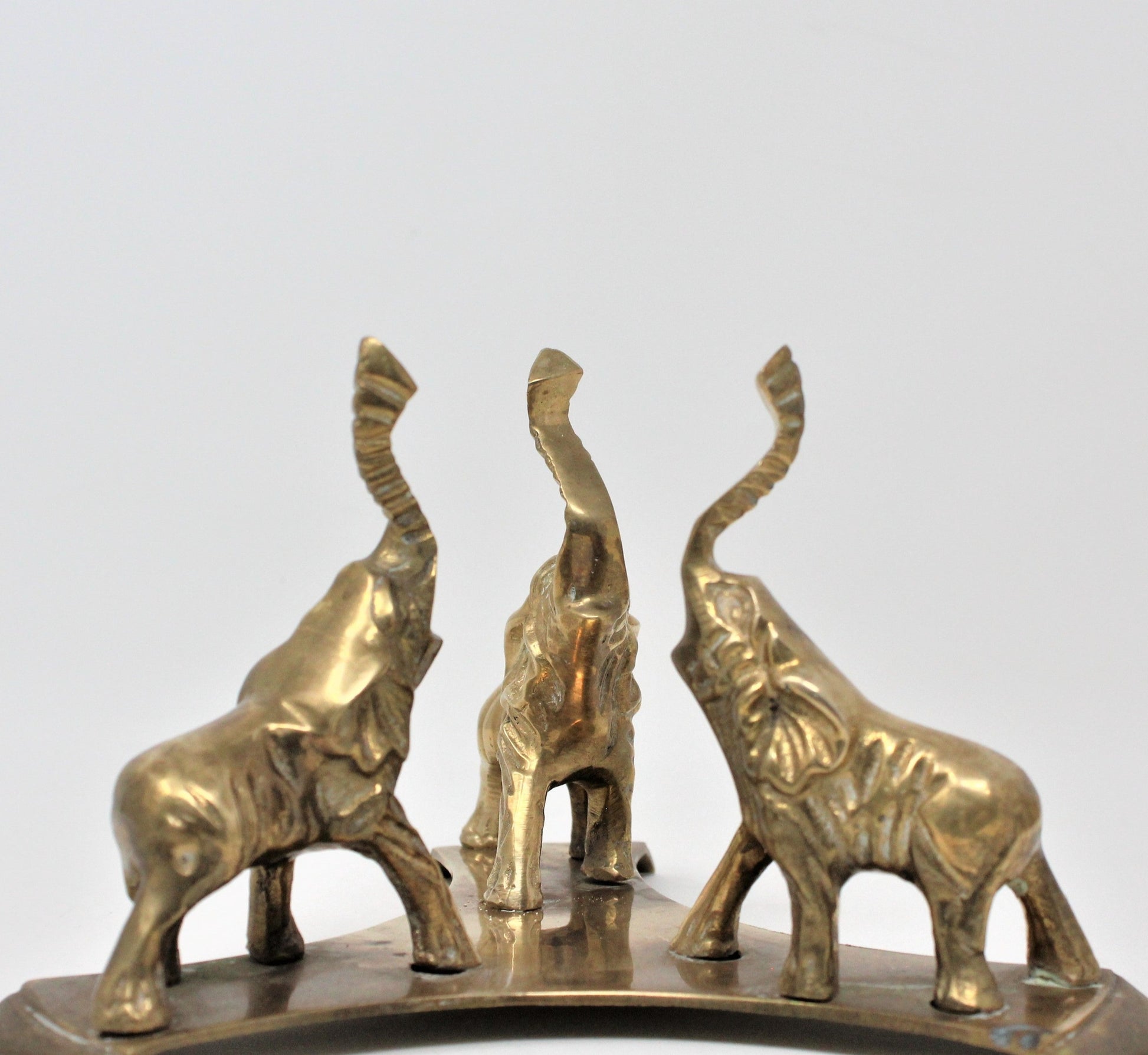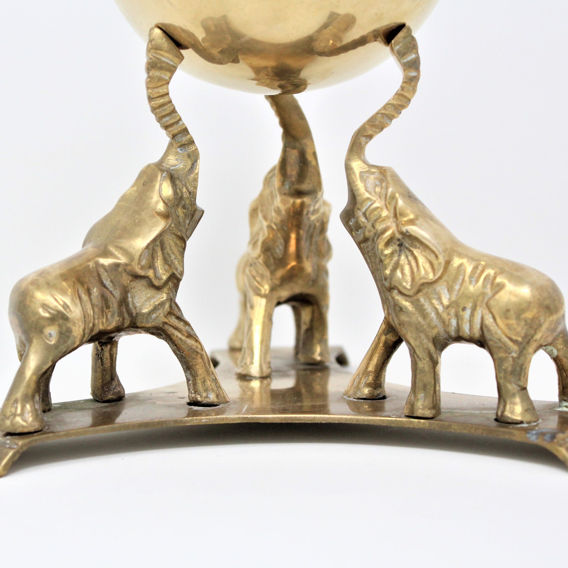 - Details: Adorn your home with this exquisite mid-century, vintage sculpture. Crafted from solid brass, this statement piece features three elephants holding up a brass ball / sphere. All three elephants have their trunks up, a symbol of good luck, good fortune, and prosperity in Feng Shui. An eye-catching centerpiece for any room, this sculpture is sure to leave a lasting impression. Also a nice gift for an office, a bar or study.