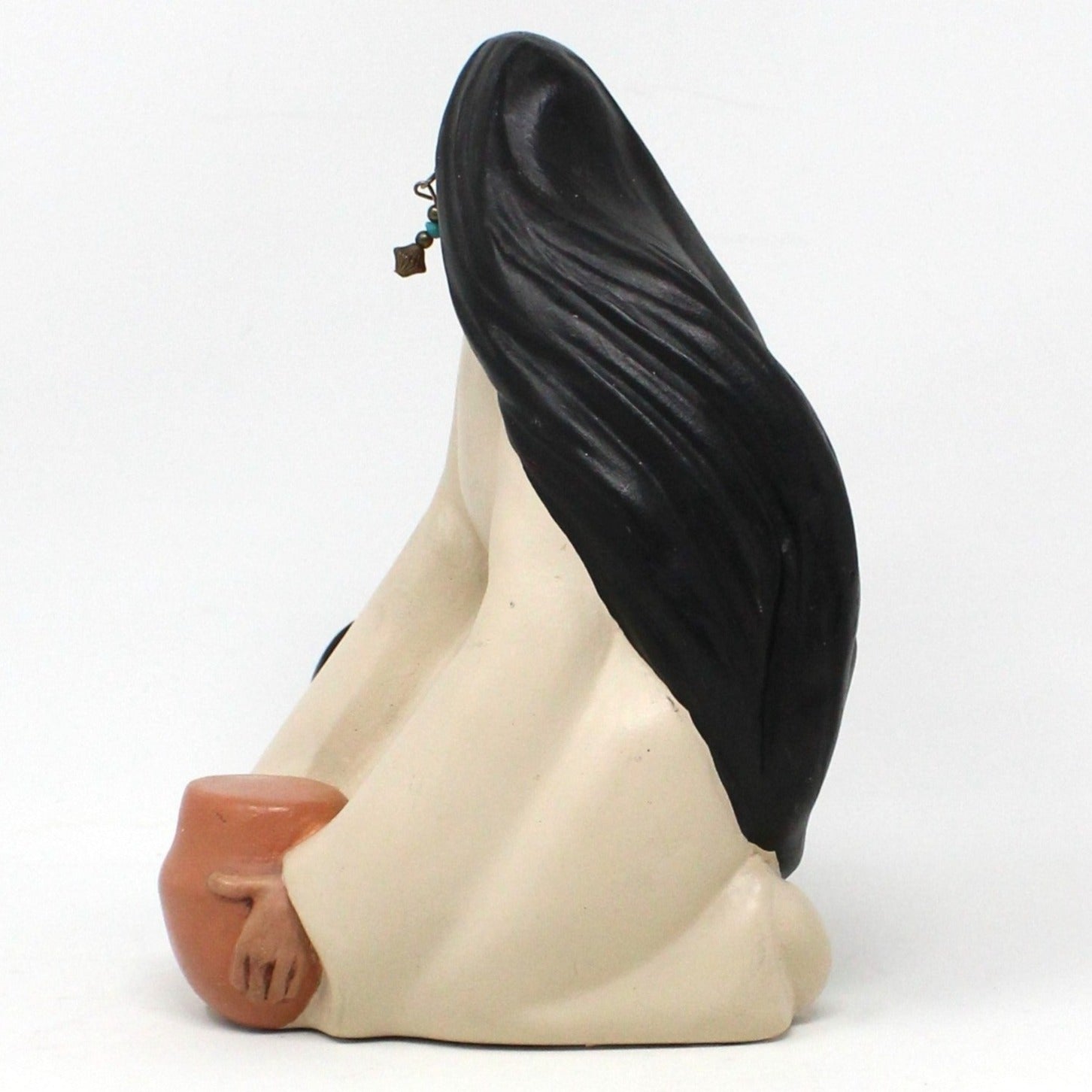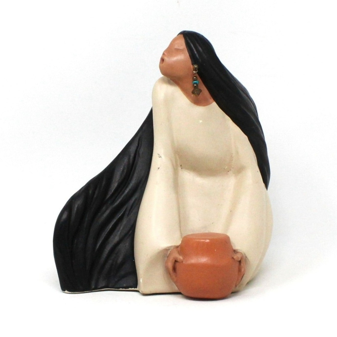 - Details: Beautiful hand cast sculpture of a Native American / American Indian woman holding a clay bowl. She has very long, jet black hair and a long beaded earring with a brass charm, 2 brass beads and a tiny turquoise bead. The molds for these castings were made by Nova-5 Inc. in Albuquerque, NM, we believe they are out of business. This piece is in the Southwest Style and has the artist initial and date: "K '90". It was presented as a gift, there's a message written in ink on the bottom and dated 1991. This is a very heavy piece, well over 2 1/2 lbs before packaging, please keep that in mind at check-out. Special addition to enhance any Southwest Styled home. There are a couple of minor issues, please see below for details.