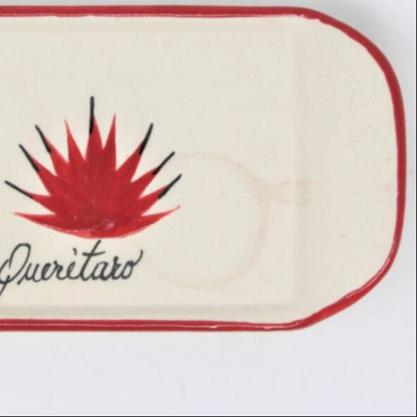 - Details: This is a great item for a Tequila lover! The set includes two shot glasses, a salt shaker and a small tray. It is made of ceramic with a hand painted agave plant in red. The ceramic has a really nice sandy finish/texture, unglazed, however, the inside of the cups are glazed and so is the hand painted red agave plant. The only colors are red and black on the sand colored ceramic, the tray has: "Queretaro" written in black cursive (yes that's an 'e' and not an 'i', it has the little accent mark over the second 'e' which makes it look like an 'i'). Queretaro is a state in Central Mexico that is known for different species of Agave plants. A nice, subdued change from all the very colorful ceramics typical of Mexican art. Great accent piece for your next Cinco de Mayo celebration or other event involving tequila.
