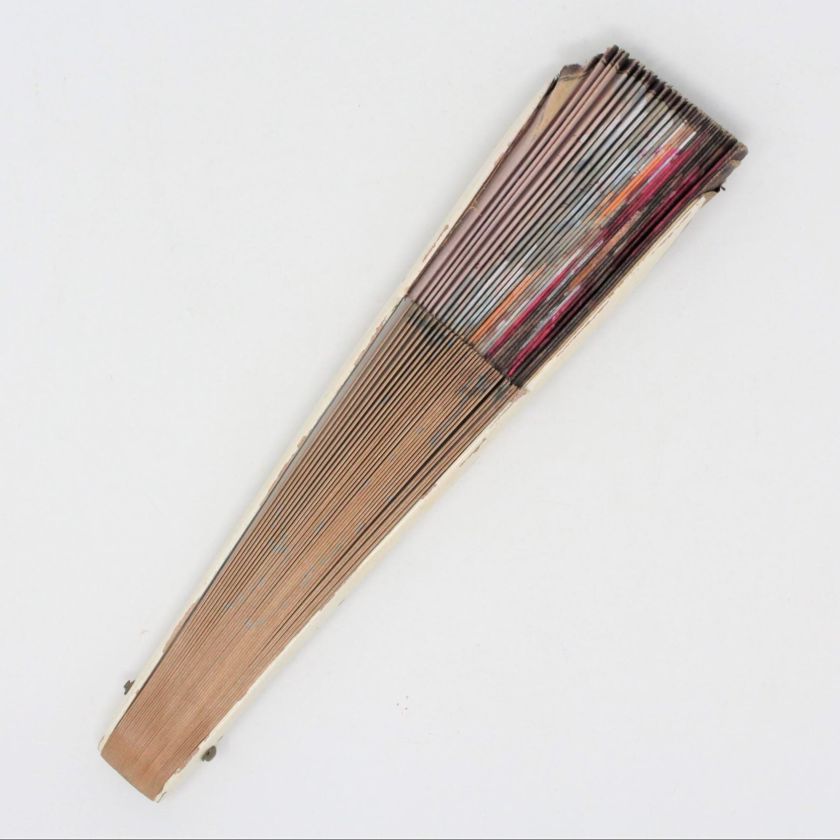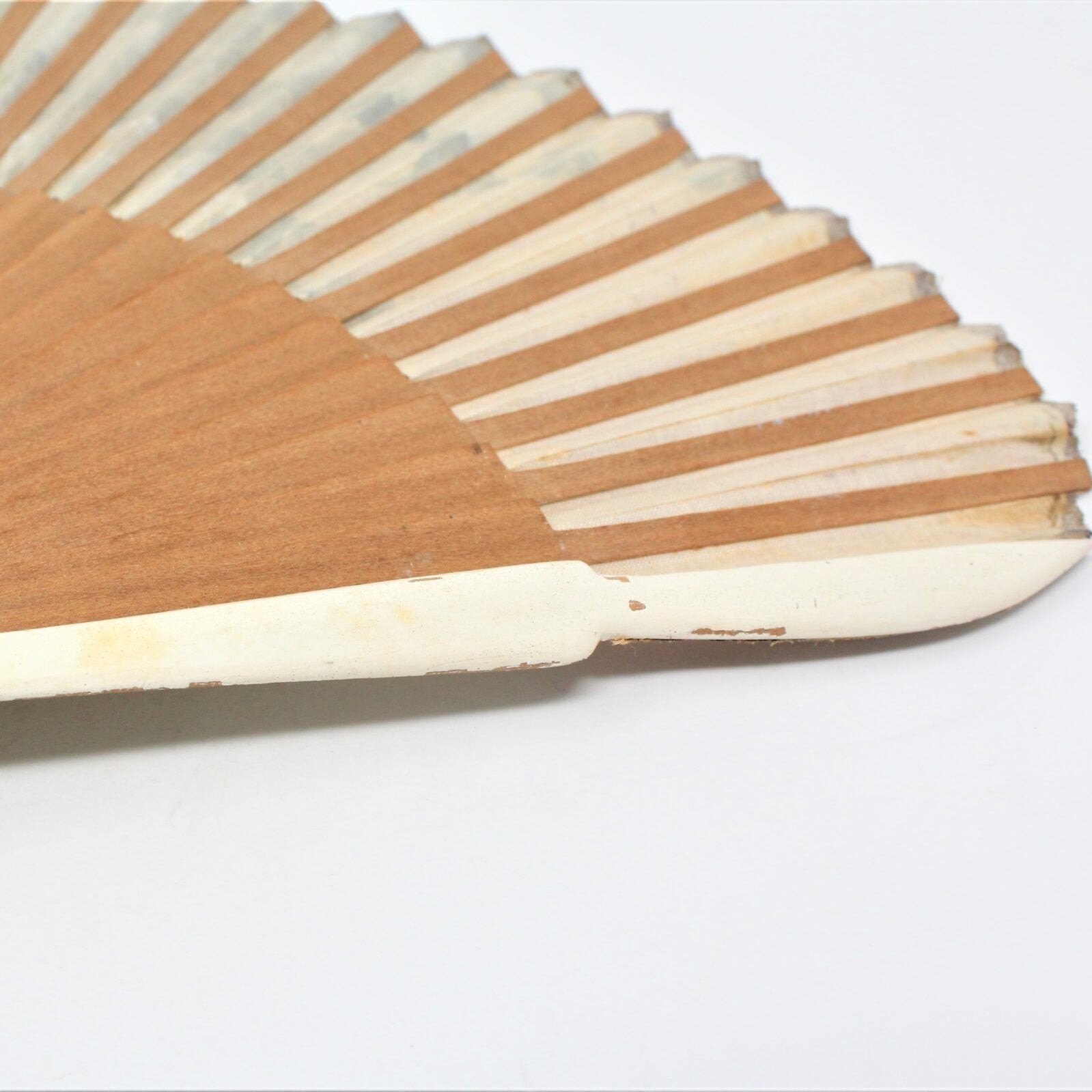 - Details: Fans have been around since Roman times but these hand held - folding fans were introduced in the West during the 17th Century, and quickly became popular. These were not only great for keeping cool, they also kept bugs and unworthy suitors away. They also became a fashion accessory, much like a brooch or bracelet, these were decorative pieces of art to be worn and shown. Today we love them as home decor; whether framed and hung on the wall, opened on a base/stand on a tabletop, used as a backdrop for figurines or other knick-knacks, or several displayed on a wall; fans can create an atmosphere of sophistication, romance, Bohemian, Victorian, fun, quirky or tropical, just depends on the fans and how you use them. This is a wood fan with a hand painted silk leaf. The wood has swirls in gray and brown, the leaf has red and peach roses with smaller white flowers in between. The fan has written on the back in pen: "Madrid 1971 Julio" (July), a reminder of where and when it was purchased. These make great gifts for Valentines Day, Mother's day and birthdays.