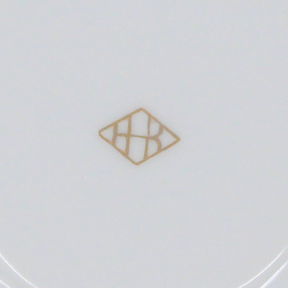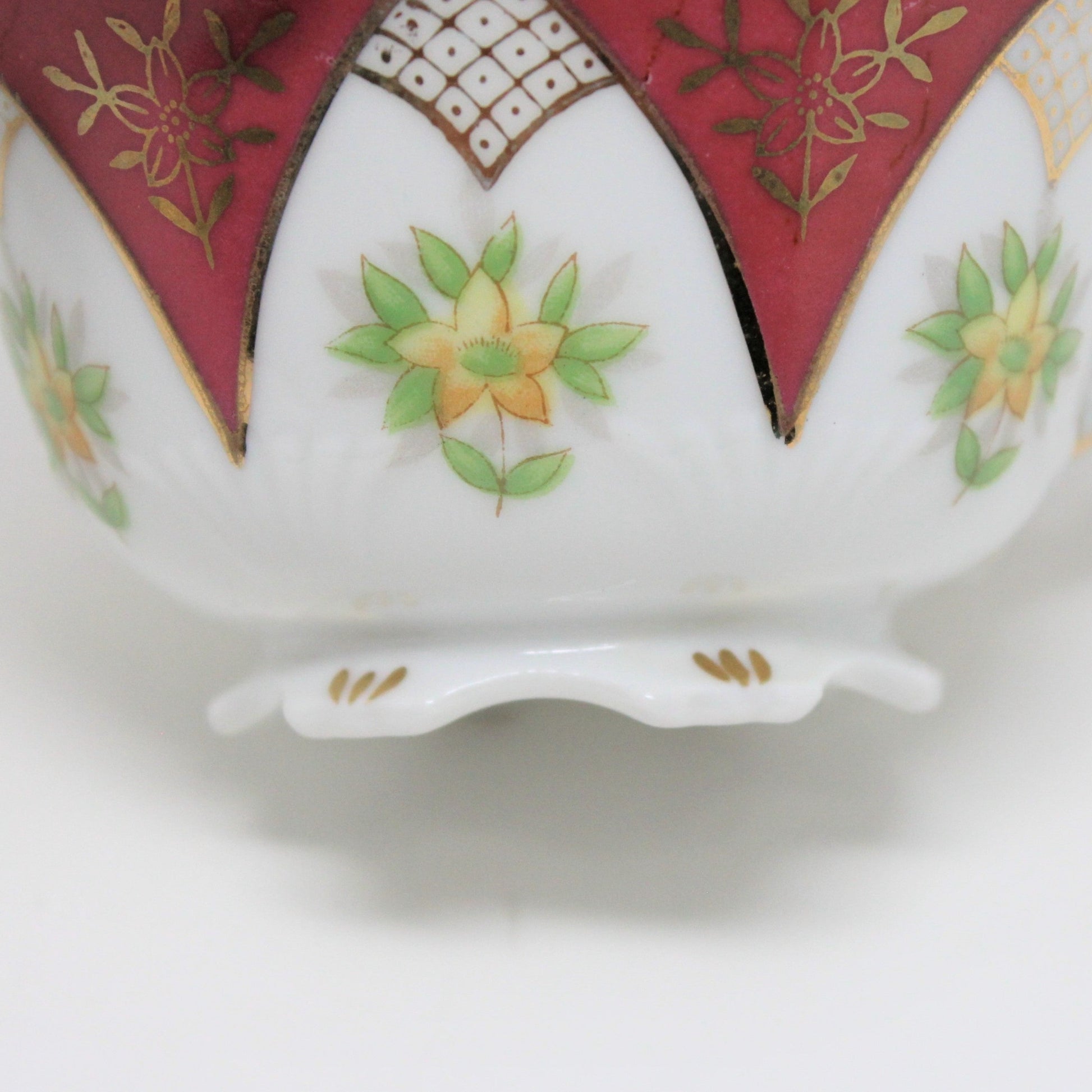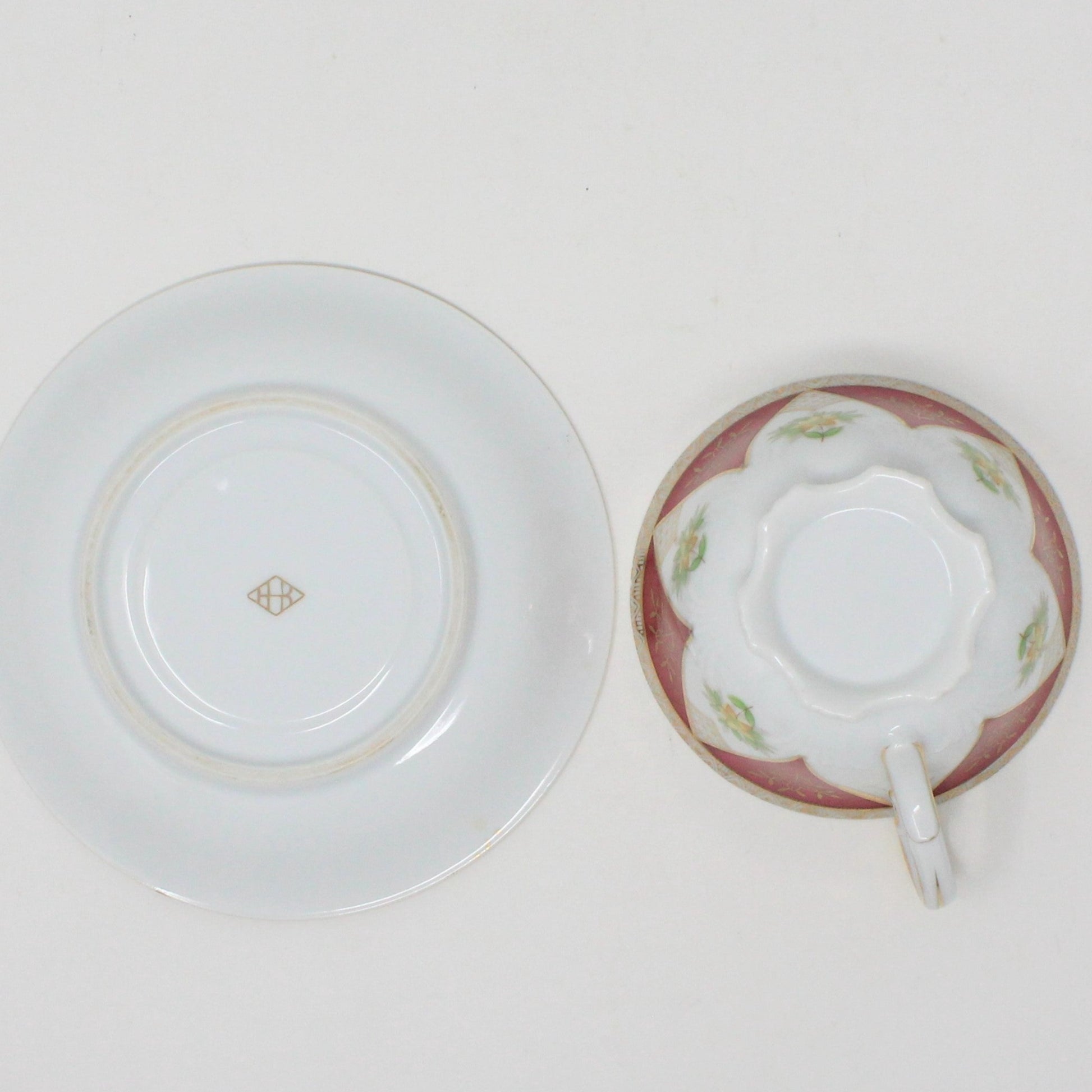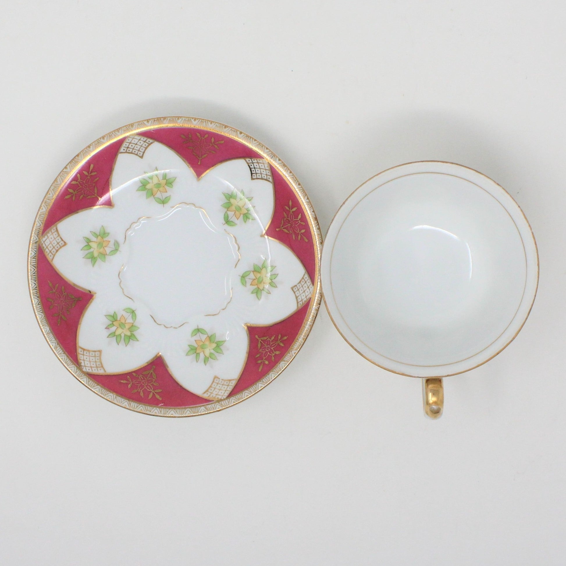 - Details: This is a lovely china cup with matching saucer. The pattern forms arches with hand painted flowers and gold accents within each arch. The outside of the arch is a pretty burgundy color, (almost a dark Fuchsia), with yellow flowers inside each section. The cup is embossed and footed. The saucer has the same pattern, the arches form "petals" all around the plate border. Both the cup and saucer have a very intricate gold rim. This is very fine porcelain, very translucent and delicate. We think it would be pure pleasure to drink coffee or tea from this fine cup. The saucer is stamped on the bottom in gold: "HB" within a gold diamond, (or is it HHB?), we were unable to find the maker for this mark. Excellent for a tea party, ladies luncheon or just to indulge yourself in something beautiful. If you're a teacup collector, this will be a great addition to your collection.