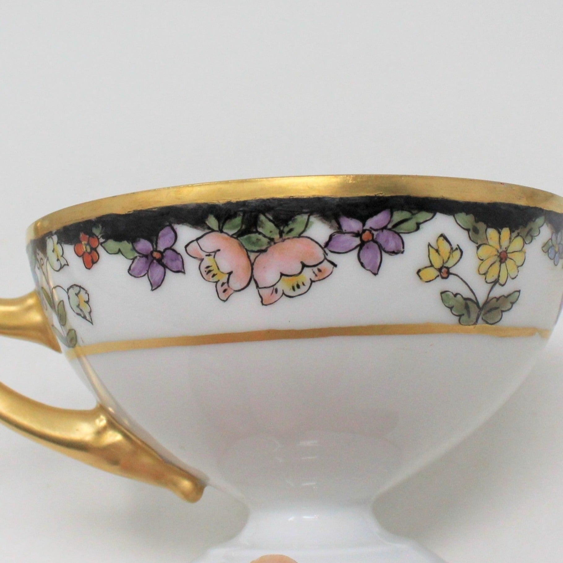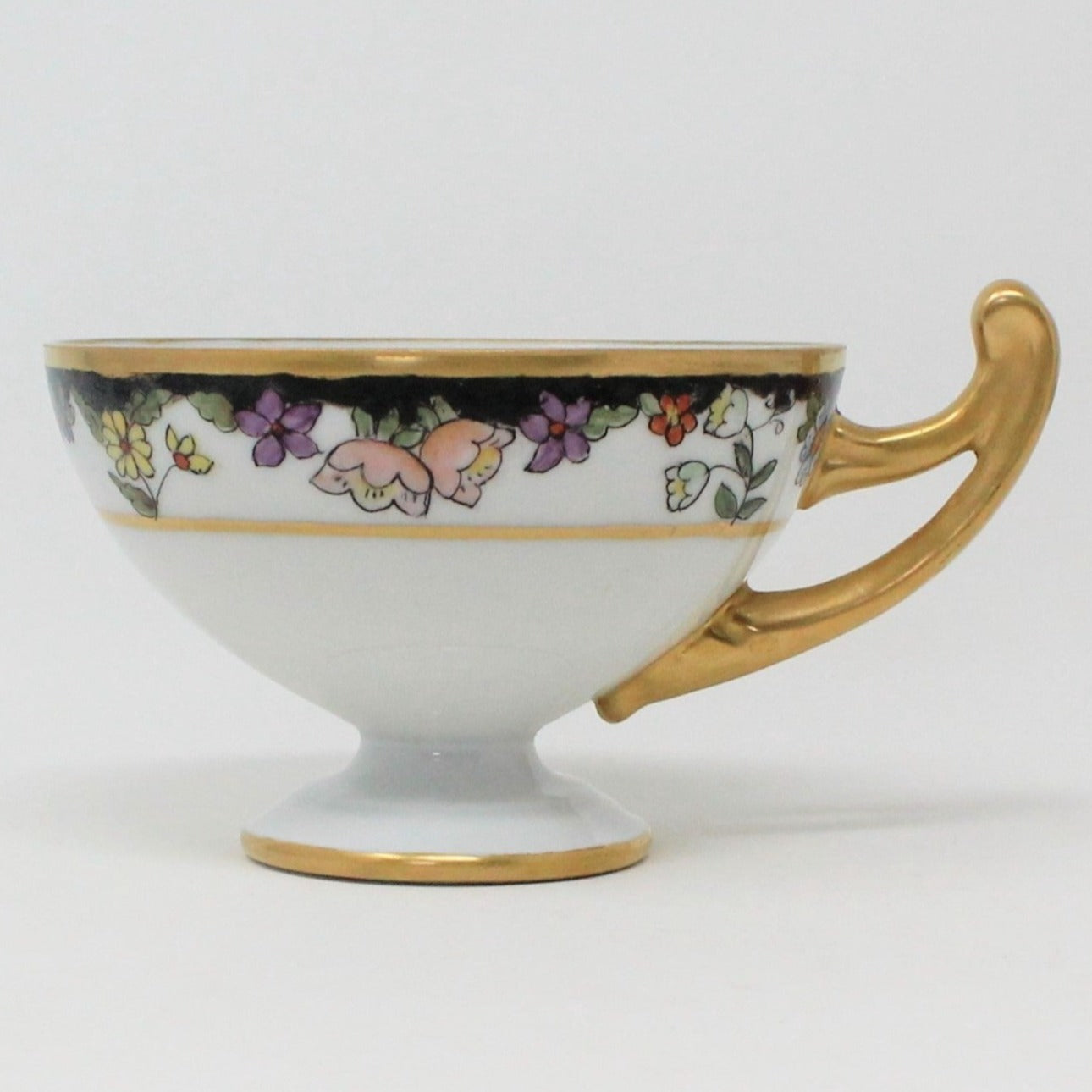 - Details: This is beautiful fine porcelain footed teacup (TEACUP ONLY). It is hand painted in a wonderful floral pattern against a very dark border. The cup is very old Czechoslovakian porcelain, however, we believe the hand painting was done in the USA. In the late 19th to early 20th century, high society women had painting clubs and use "porcelain blanks" and hand paint cups, vases, plates, etc. If you like this cup, we also carry a set of five footed cups, with the same hand painted border. Plus we have two footed cups, same hand painted border. They all go together beautifully, same floral border, only the handles are different. If you would like to purchase ALL 8 cups, (please see last picture for the different handle styles), please Contact Us for a 15% discount, while supplies last. (Cannot be combined with any other discount).