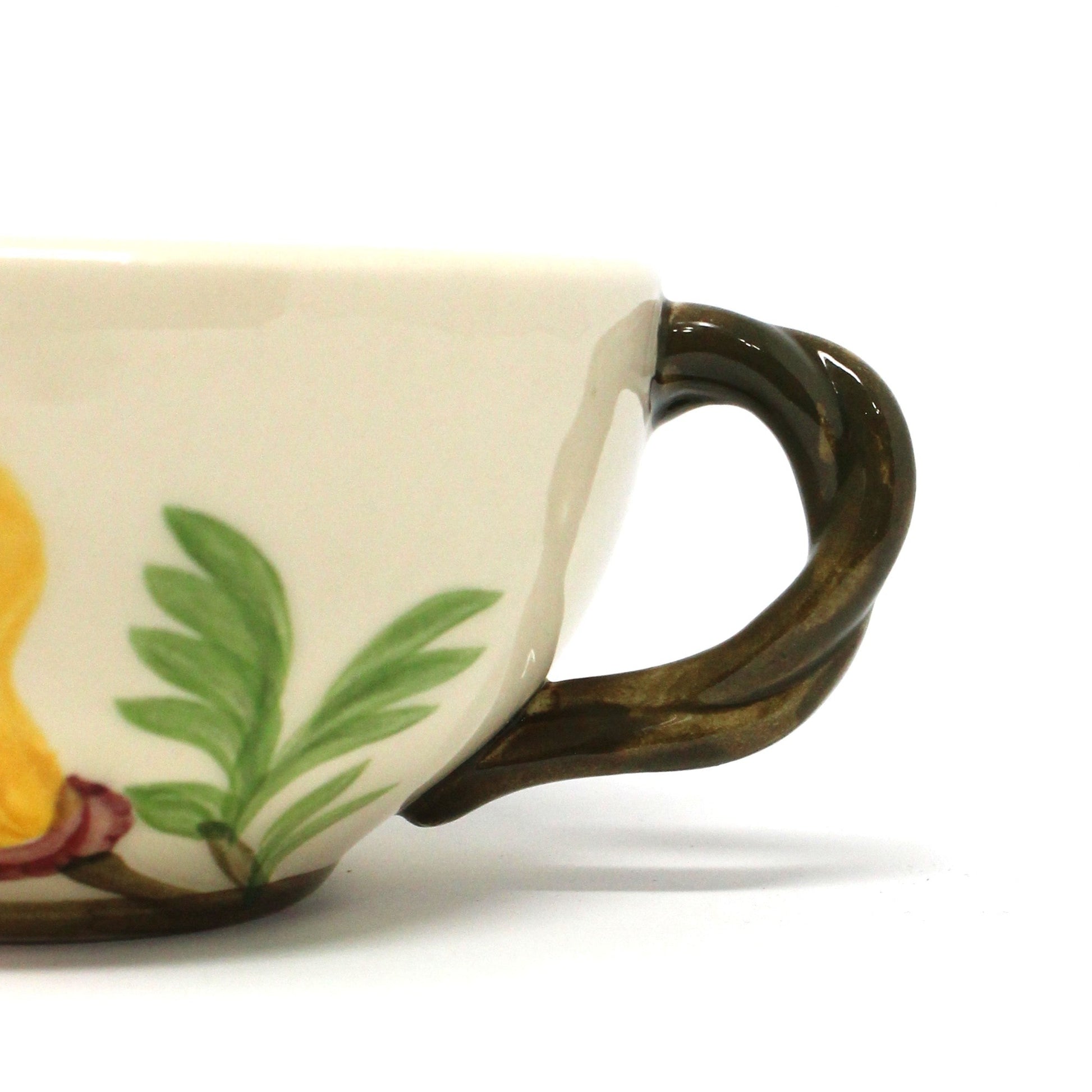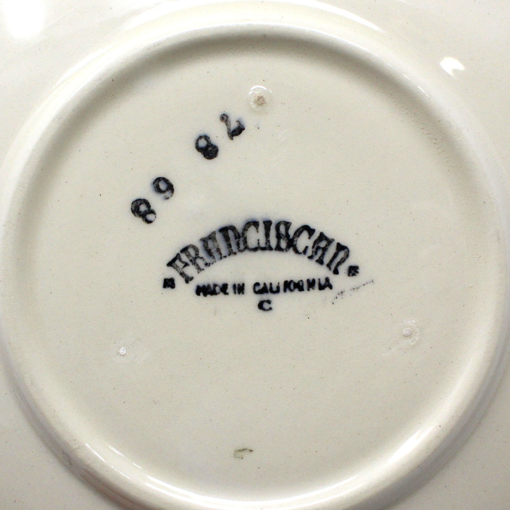 - Details: This is a sweet cup and saucer set from Franciscan Pottery in California, very collectible! It's in the Poppy pattern, an embossed floral in yellow and purple, with a textured handle made to look like a wooden branch. This piece is the original Franciscan, half moon mark used between 1949 and 1953, marked: Made in California. Hand washing in recommended since it is old, it is not dishwasher safe. This ceramic is not bright white, it's more of a beige / off-white color. We carry several other items and patterns from Franciscan, if you're a collector, please take a look at our pottery offerings.