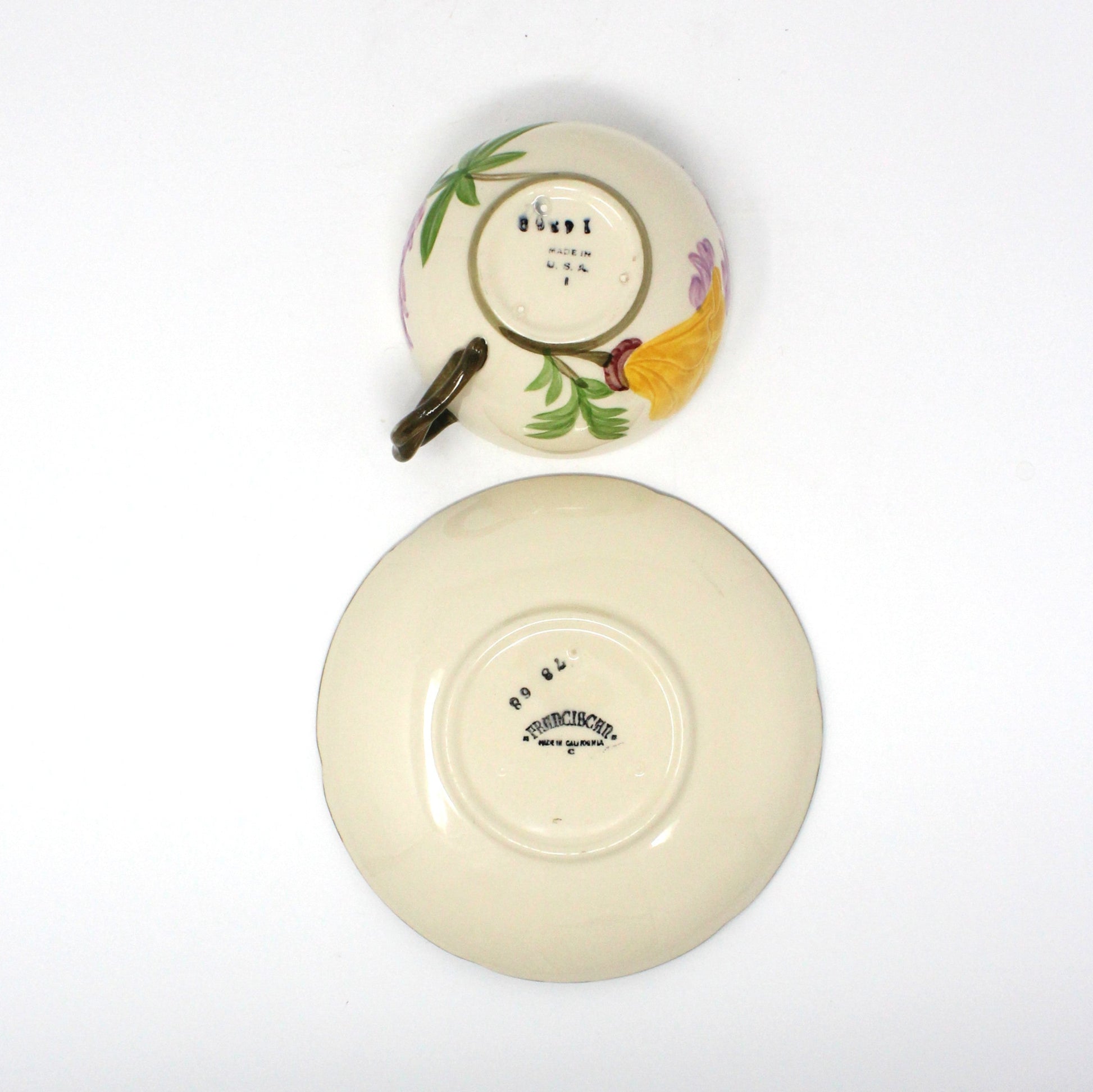 - Vintage Teacup and Saucer, Franciscan, Poppy, Hand Painted Yellow & Purple Embossed Flowers, Classic Tableware, Teawares, Tea Party Cups, Mid Century, American Made Pottery, Half Moon Mark, California USA, Vintage Collectibles, (Discontinued)