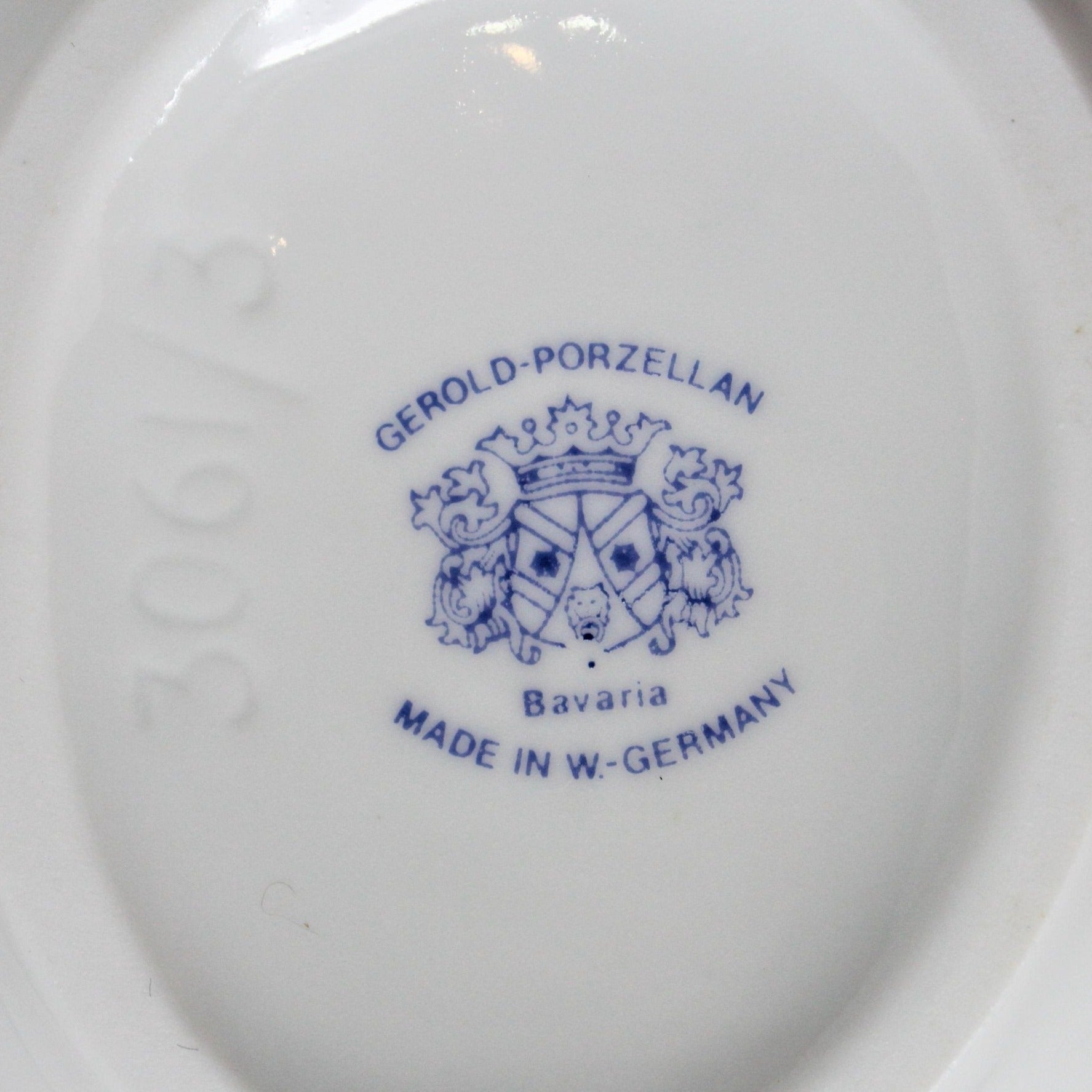 - Details: This is such a beautiful porcelain egg! It is from the Bavaria Germany porcelain house, "Gerold Porzellan". The design on the lid consists of pink wild roses and their leaves. It has beautiful tones of dark and light pink plus yellow, red and white, with green and gray leaves. Both the top and bottom have a thick 22 carat gold rim. It is stamped on the bottom: "Gerold - Porzellan, Bavaria, Made in W-Germany". It is also embossed with the model #3061/3. This pattern has been made since 1949 and the use of "West Germany" ended in 1989 so this piece is from between those years, we think it's more likely from 1970's. Excellent on a dressing table for jewelry, for the powder room, girl's room to corral small items, even in a sun room or covered patio. Of course, it's ideal for Easter!