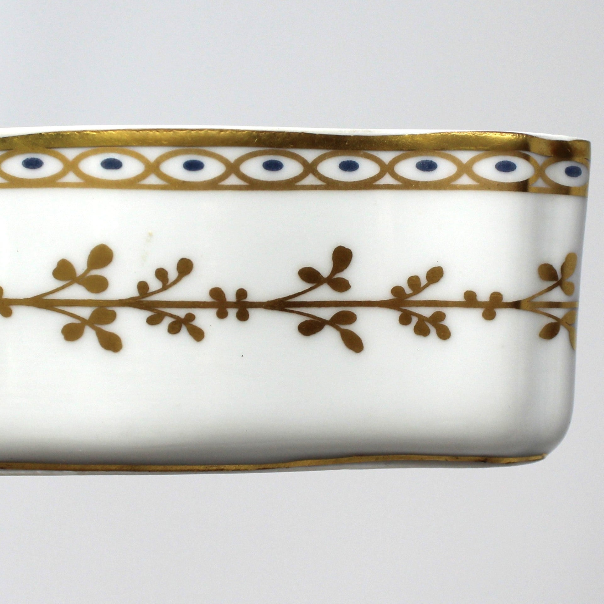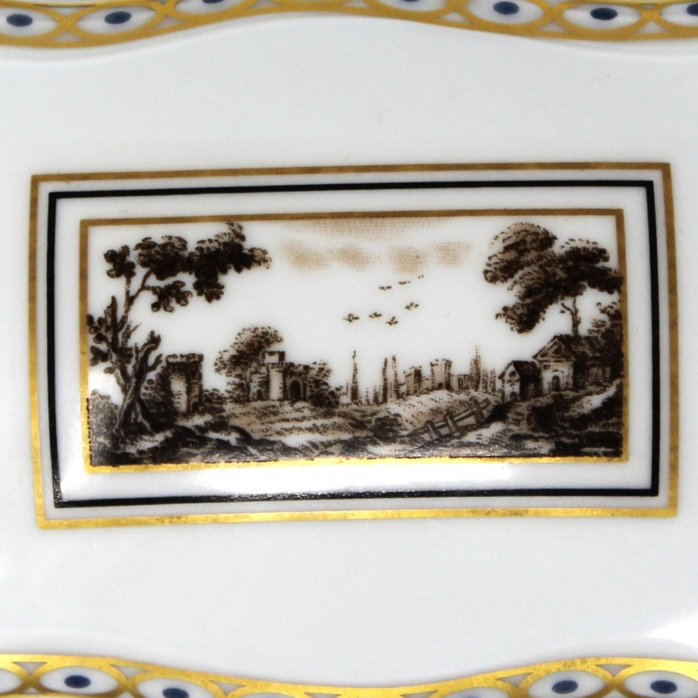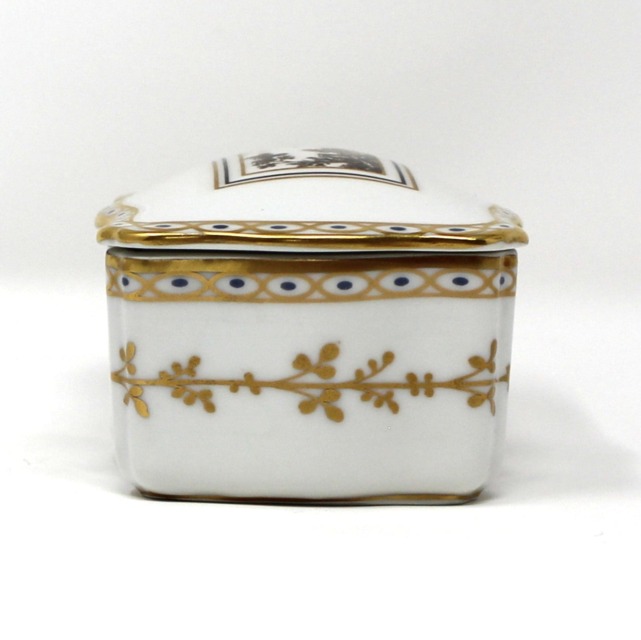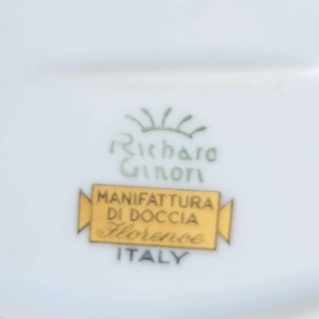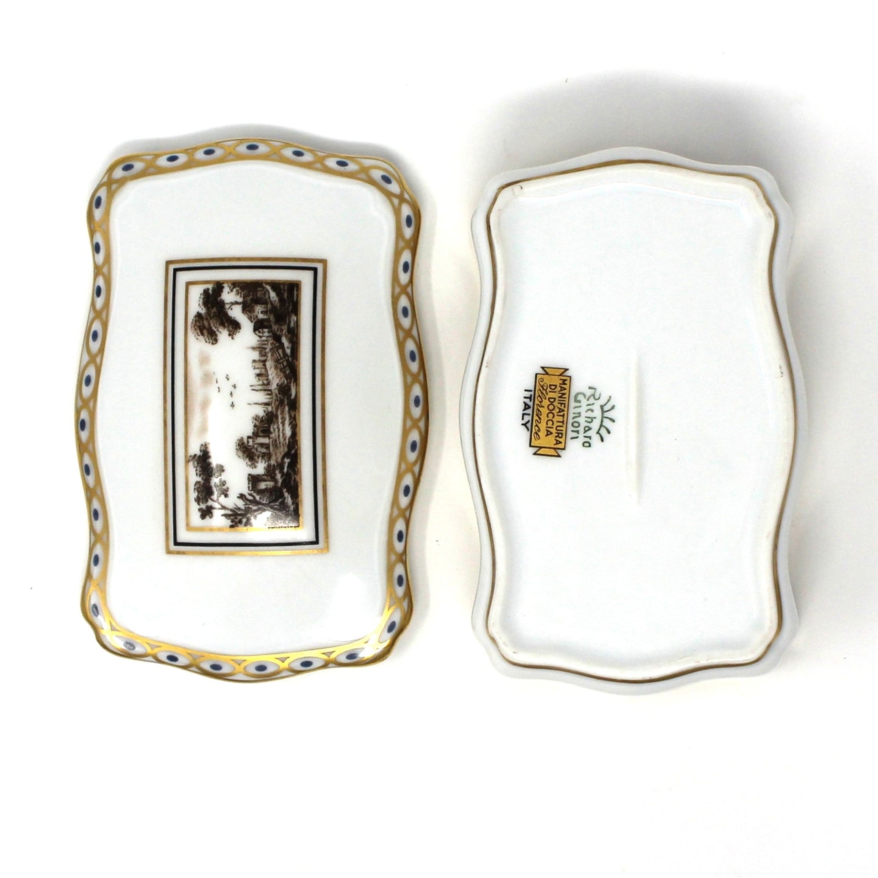 - Details: This exquisite vintage trinket box features the elegant "Fiesole" pattern from Richard Ginori. It is crafted in porcelain with a sepia toned, Italian village scene on the lid, depicting scenes from the Tuscan town of Fiesole. The borders are accented with a gorgeous ribbon of gold and blue on both the box and the lid. Plus a gilded vine of leaves all around the box. First introduced in the 1770's, "Fiesole" was reintroduced in the 1990's. This one still retains the original sticker that reads: "Manifattura Di Doccia, Florence". The Richard Ginori backstamp is also visible. Perfect as a sophisticated home decor piece, it also offers a refined storage solution for jewelry, rings, or small keepsakes, blending timeless artistry with practical elegance, it will certainly make it a piece to treasure.