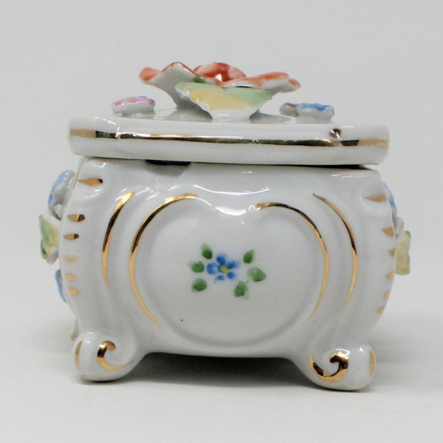 - Vintage Trinket Box, Porcelain Floral, Hand Applied Flowers, Orange Rose, Footed, Jewelry Storage, Vanity Box, Ring Box, Elegant, Japan Imports, (Discontinued)