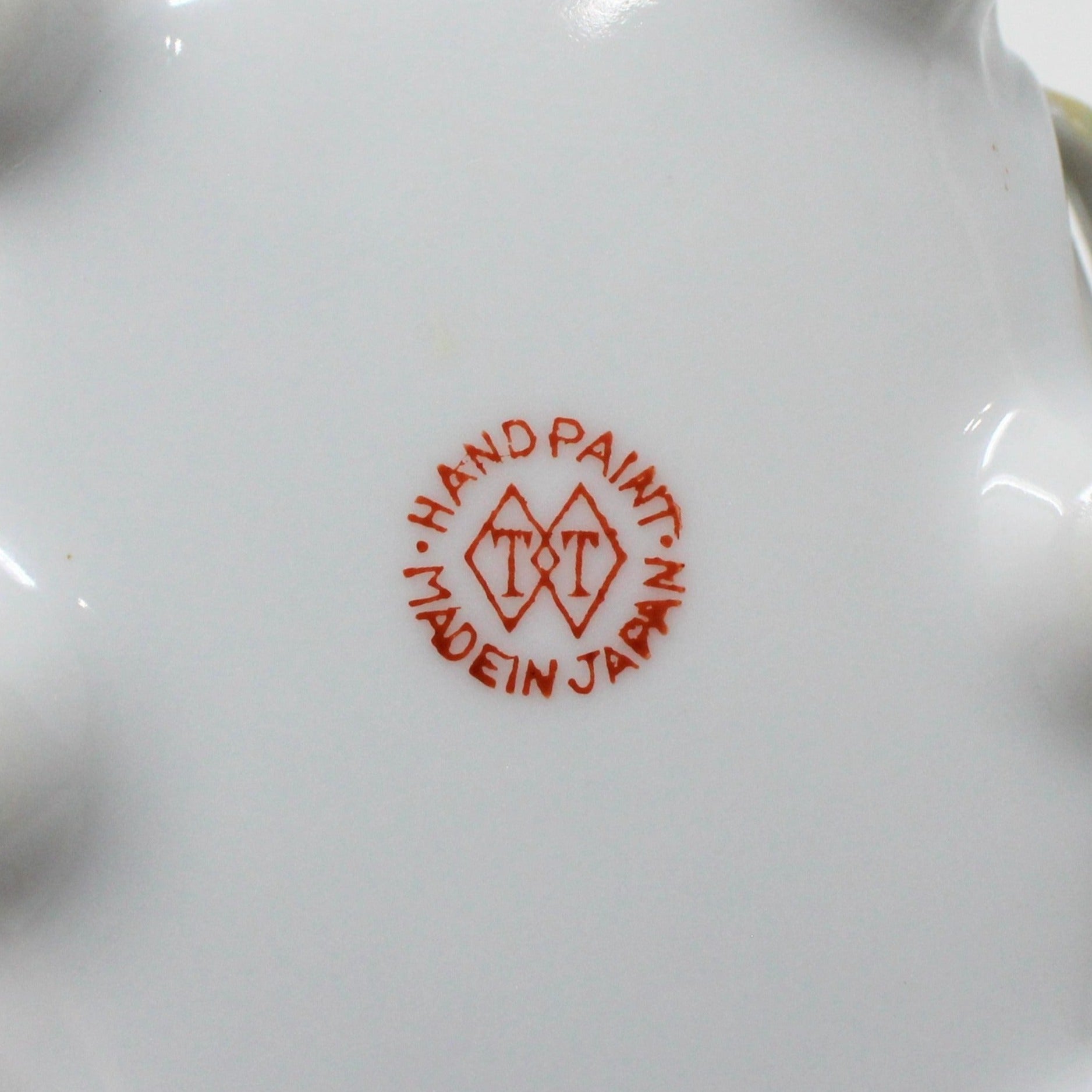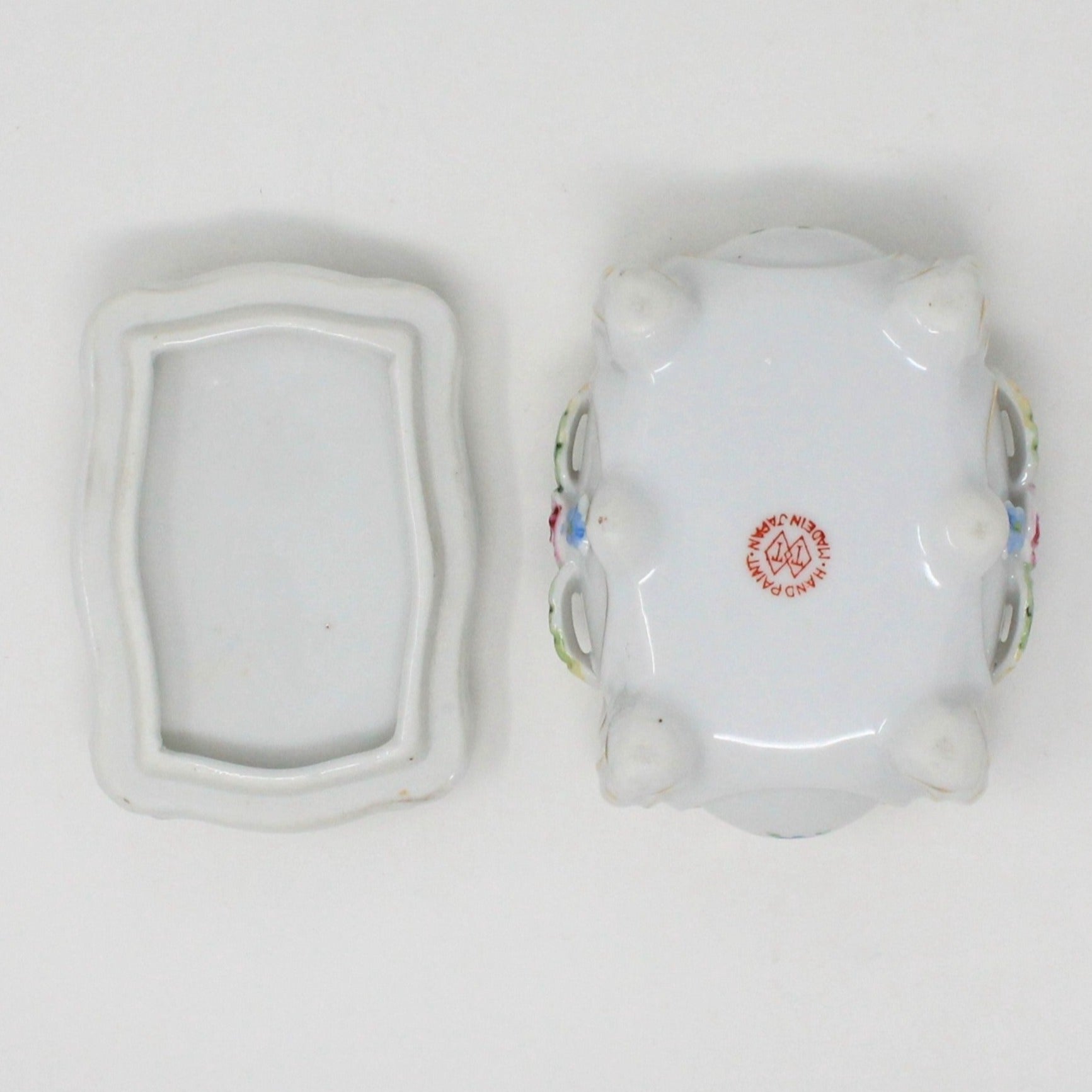 - Details: This is such a pretty trinket box!! It is very old, hand painted porcelain with hand applied flowers on almost every side. This lovely box has a hand applied, large orange rose in the center lid with smaller flowers around it. Not only is the lid pretty, the entire box is embossed with swirls, outlined in gold, and the two longer sides have more hand applied flowers and leaves, just beautiful! It is stamped on the bottom: "TT Takito (logo), Hand Painted, Made in Japan". Based on research of the logo, we are able to date it to between 1922 and 1944. There is a condition issue, please see below. Lovely as decor but useful for jewelry, and on the vanity too.