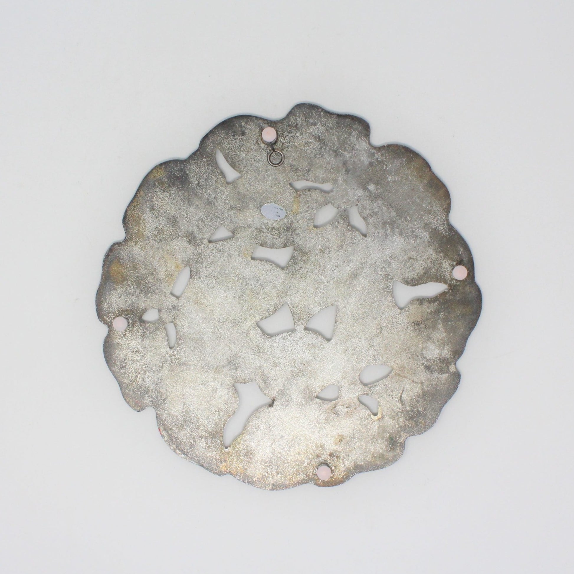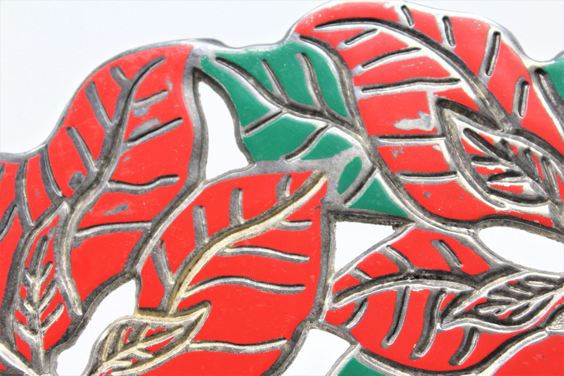 - Details: Beautiful silver-plated trivet from Oneida with beautiful enamel work on red and green poinsettias. The trivet has four cushioned feet to protect your table, and comes with a small hook if you'd like to hang it as decor. Trivets are always a nice addition to your table or buffet and this one fits right in with all the holiday decor.
