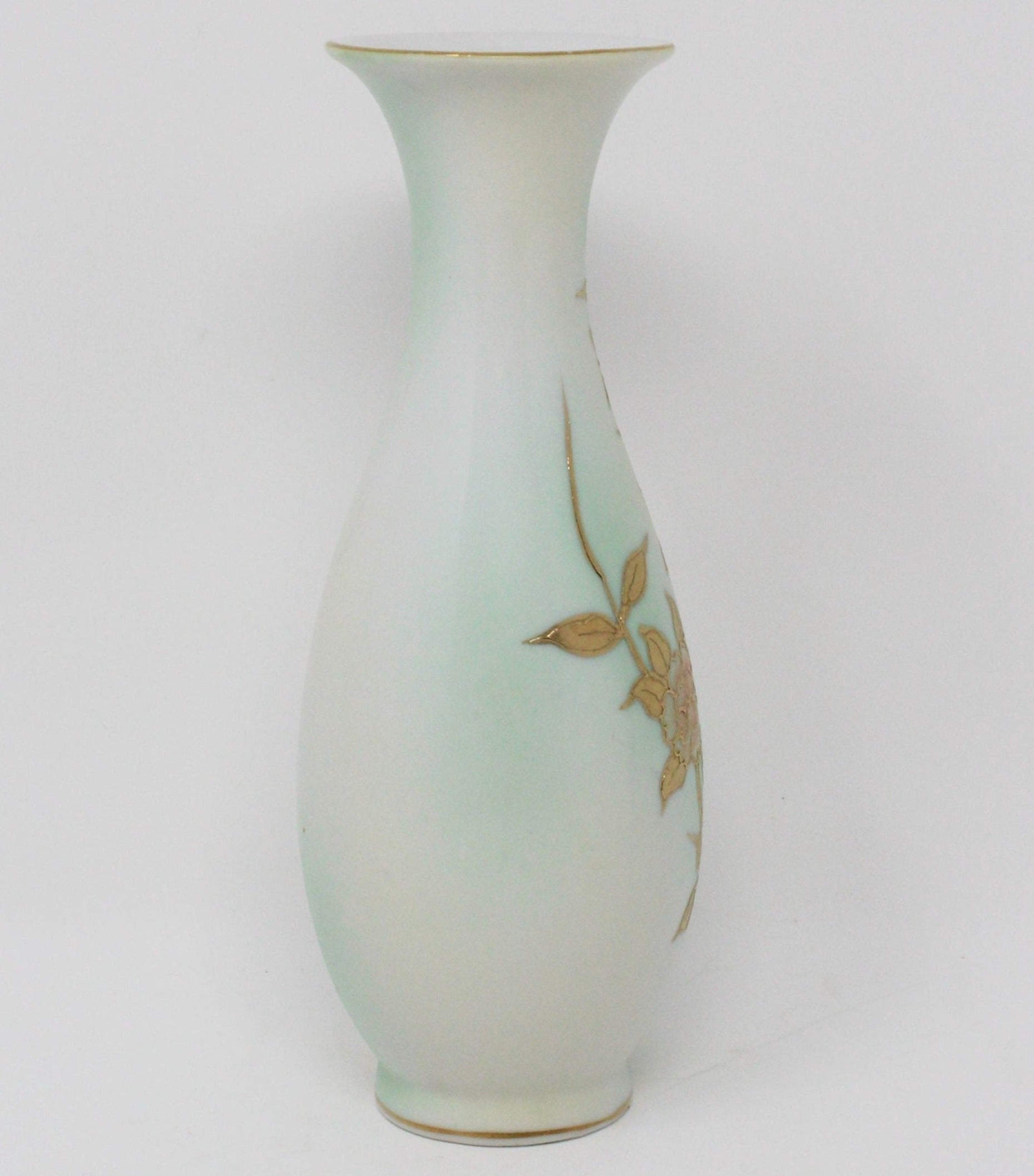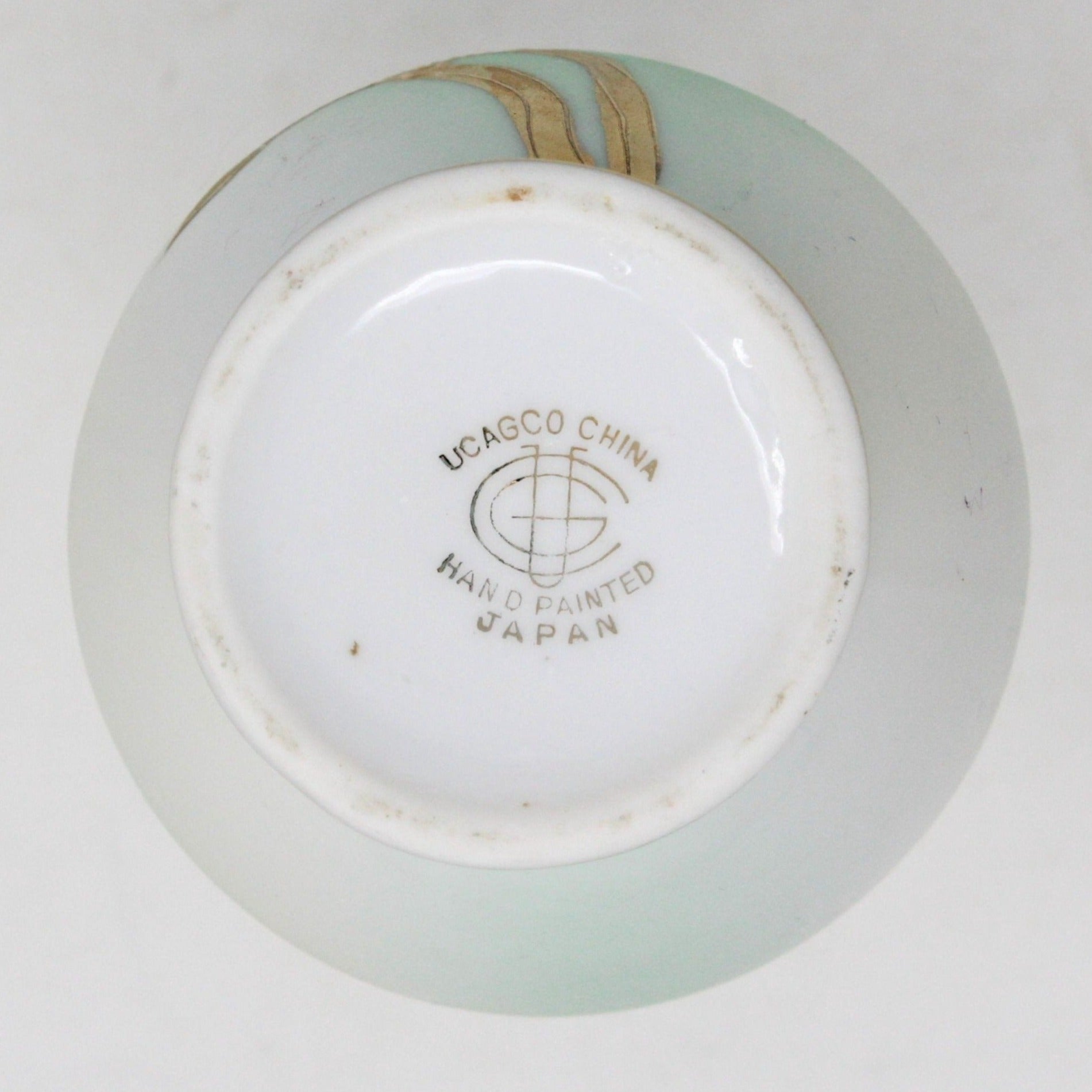- Details: This is a really beautiful bud vase. It has a soft green, matte background, accented with gold leaves and stems and bright pink carnations, all outlined in gold moriage. Looks like chinoiserie style to us. The vase is stamped on the bottom: "UCAGCO China, Hand Painted, Japan". If you're a Ucagco collector, we hope this piece adds to your collection. Did you know that Carnations are a symbol of love across the globe? They are often given and received as caring gifts to close family members and significant others. If you're looking for a gift for a special someone this fits the bill beautifully. Great as Oriental decor.