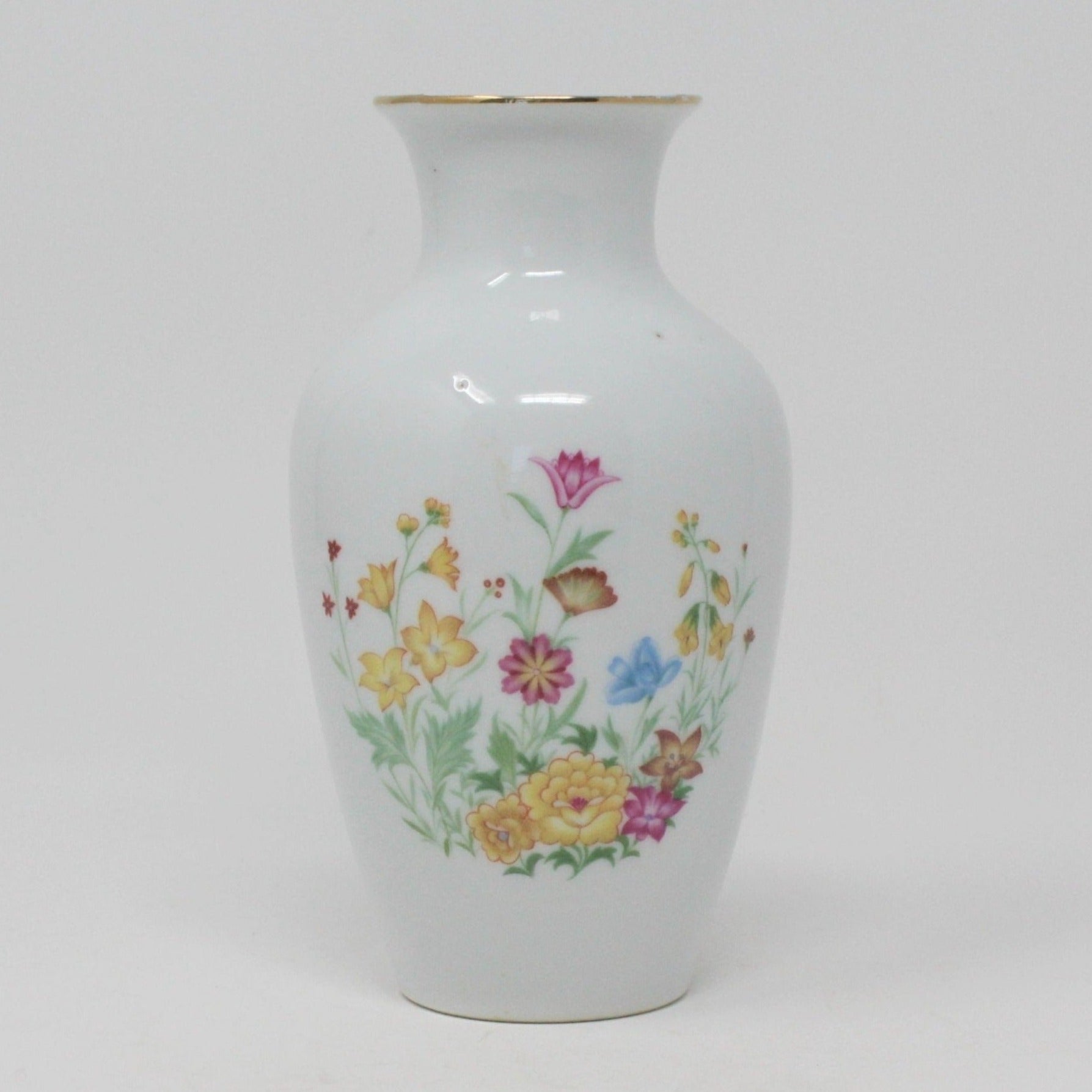 - Details: Very sweet oriental vase with a very lively design. With lots of colorful flowers and green leaves on a pure white background and a gold rim, this one will pack a big decorating punch. The colors on the flowers are bright, like hot pink, yellow, mustard yellow, blue, red and brown. The leaves are in varying shades of green. This vase has a very traditional oriental shape which narrows at the neck and then curves open at top. The bottom is stamped with a Chinese Chop mark and marked "Made in China". This chop mark is contemporary Zhongguo Zhi Zao. Great home decor for either Asian / Oriental decor or for a splash of color in any decor style. This size is perfect for a bookshelf. Perfect in an Asian decorated powder room, bathroom, or use as intended, for flowers (fresh or faux).