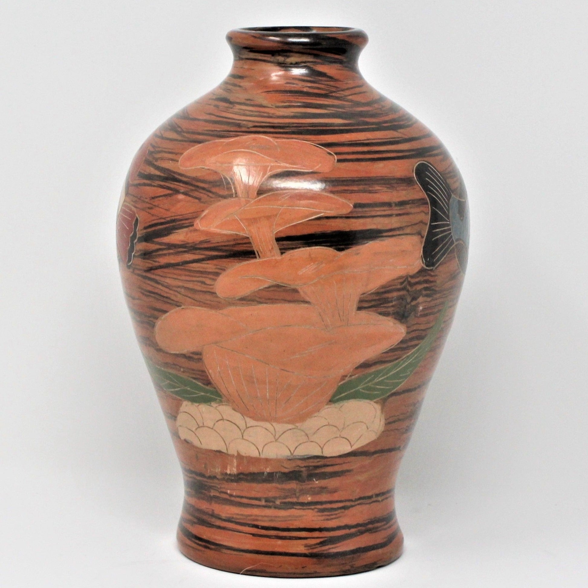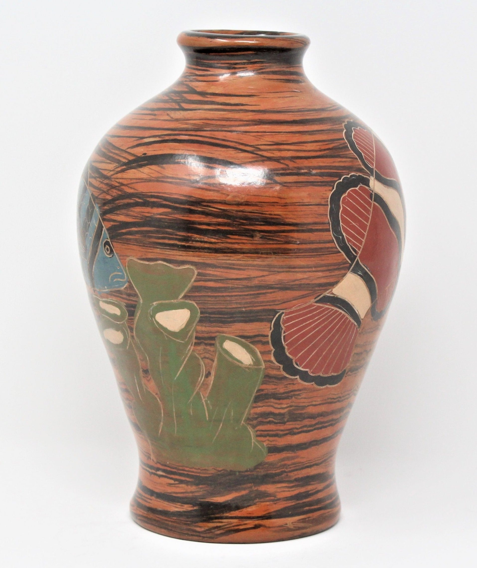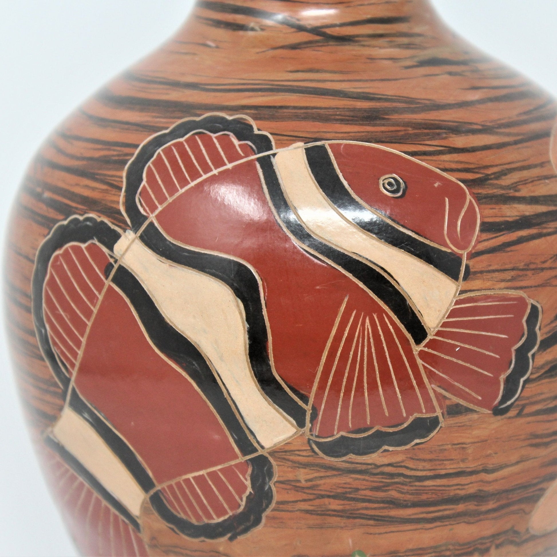 - Details: This is such a pretty and unique vase, we just had to bring it to you. It looks handmade and has an "under the sea" design that includes corals, a clownfish and a large Grouper painted in blue, and seagrass. A lot of detail went into this vase, you'll notice each scale and fin are hand-carved individually, really wonderful work by an amateur artist or hobbyist. Would make a great addition to a sun-room, patio, pool house or coastal home. There are many who collect clownfish items, if someone loved the movie Finding Nemo, they will love this vase, very unique!