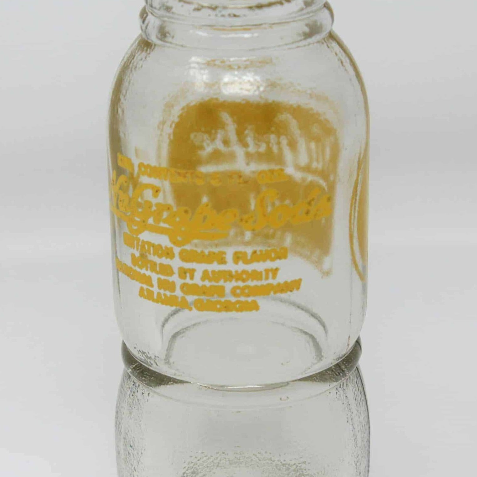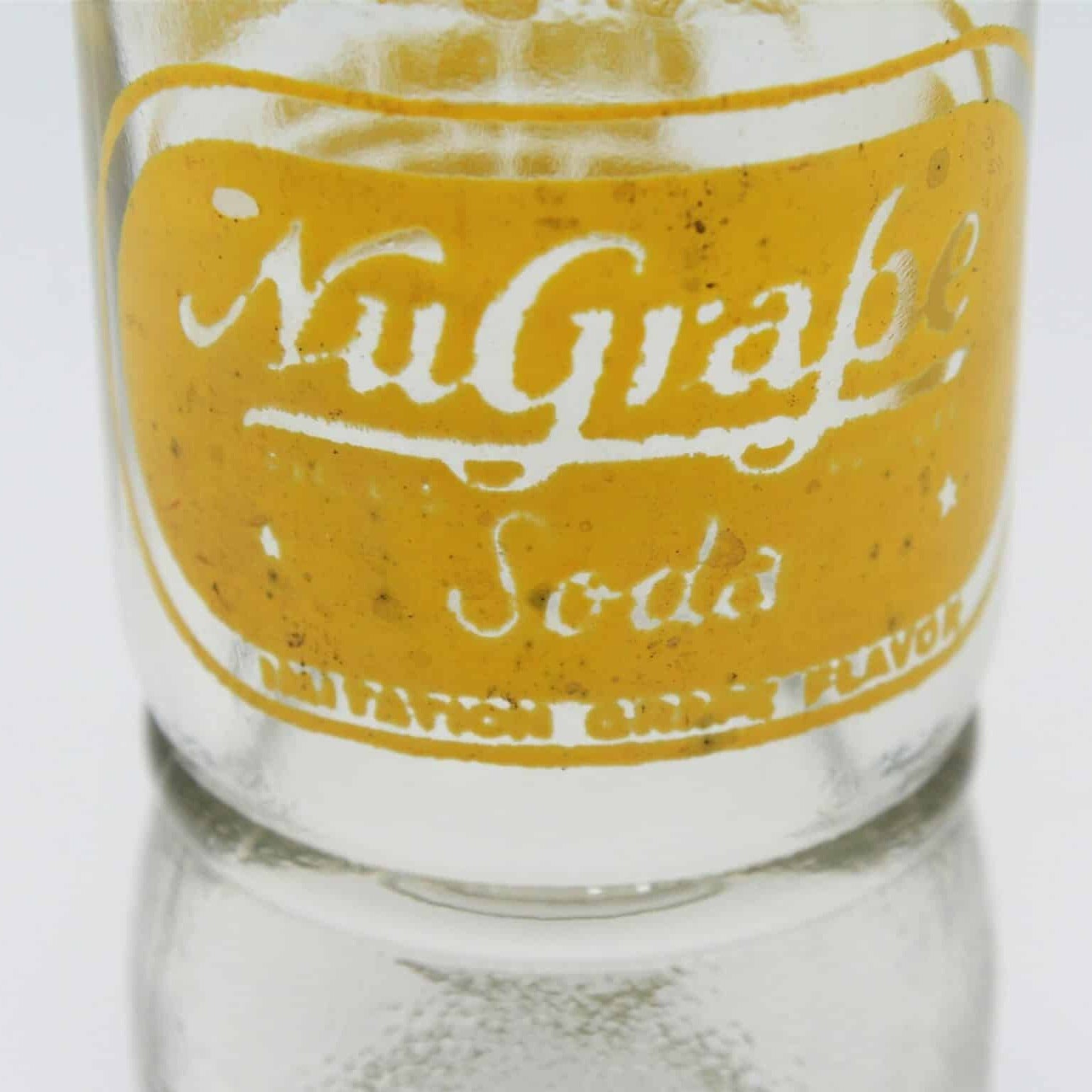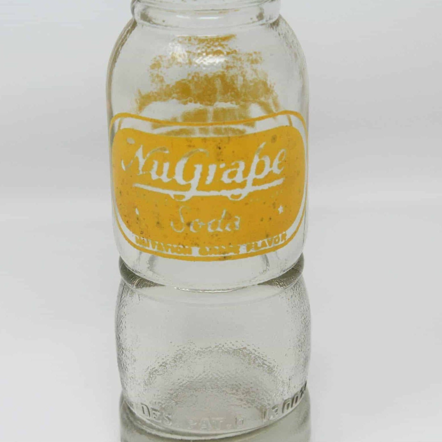 - Details: This is a vintage glass soda bottle from NuGrape Soda, the word "soda" is in cursive on this bottle. It has the original yellow logo pyroglaze. Also in yellow pyro is the information on back that reads: "Contents 6 FL oz, NuGrape Soda, Imitation Grape Flavor, Bottled by National Nu Grape Company, Atlanta, GA." The bottom is embossed with the following information: "National Nu Grape Soda Company, 161-P-6 2 B 51". It is also embossed on the heel (bottom front) with: " DES PAT. D 130075". It is a heavy bottle for its size, pricing includes shipping fees we will incur. A great gift for a bottle collector.