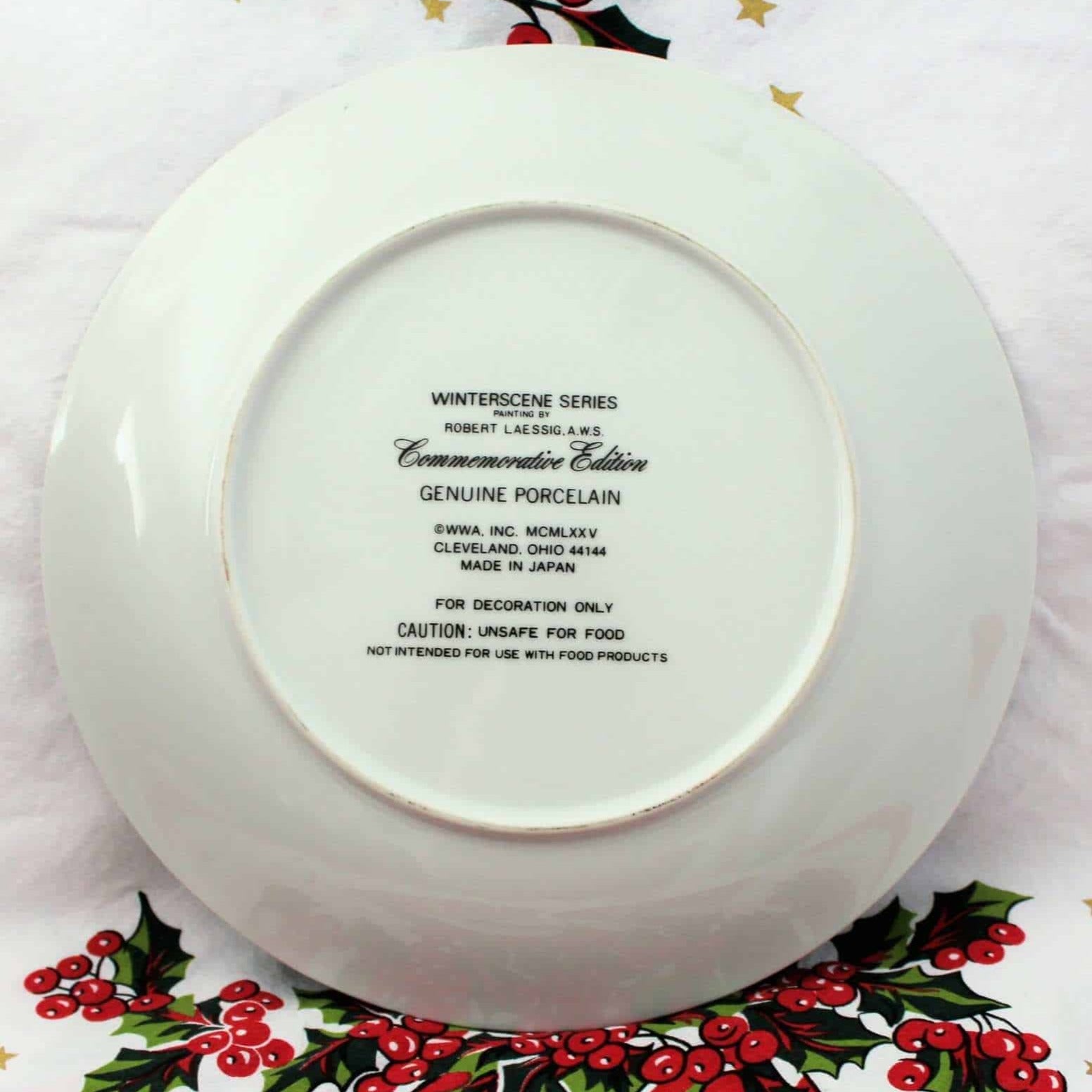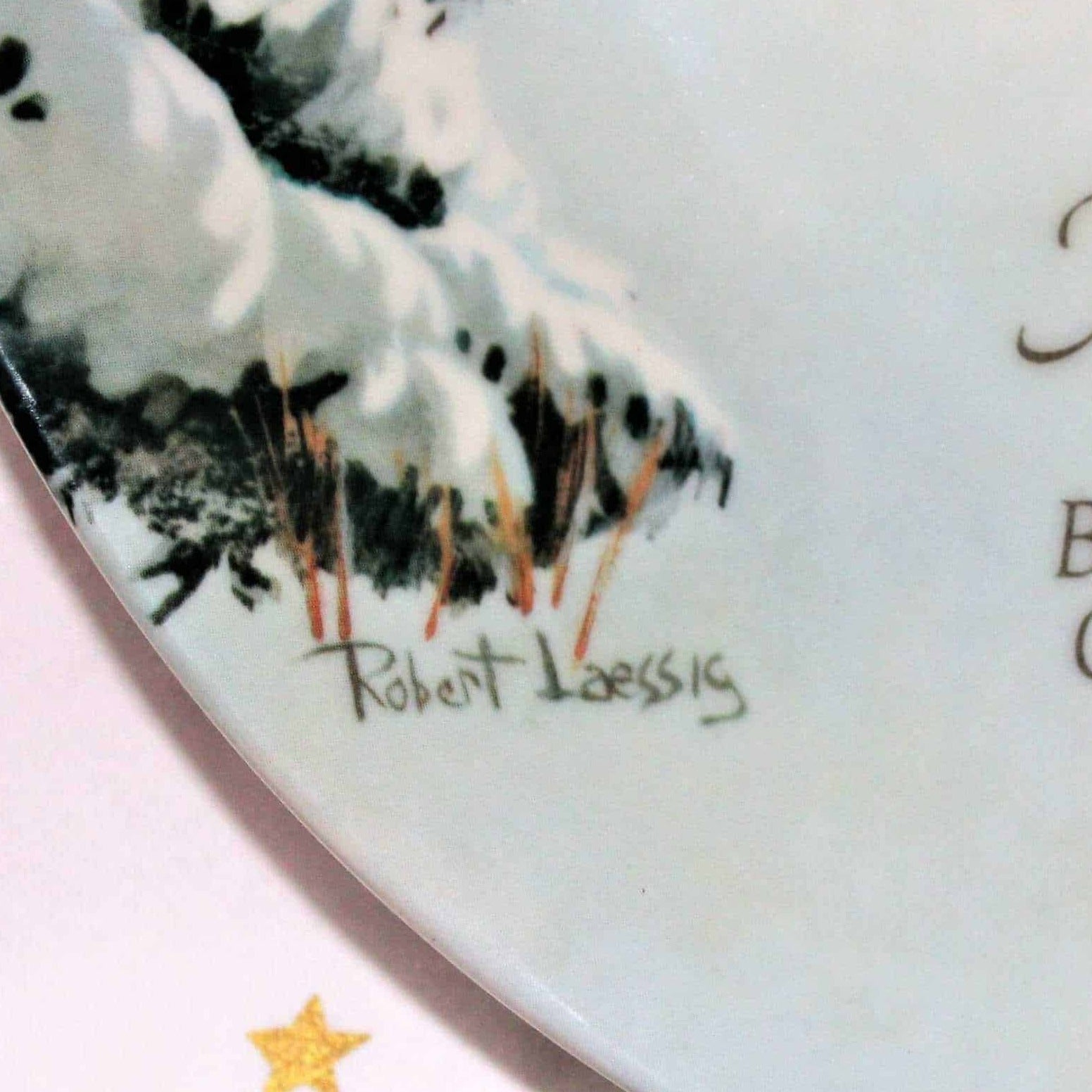 - Details: This is a fine porcelain collector's plate in a series called "Winter Scene" exclusively created by artist Robert Laessig, it is signed by the artist on the bottom left. This is the third issue of this collection by Laessig, other plates in the series range from 1973 to 1977. This plate depicts a wintery, snowy scene, with two people holding hands in the distance, walking towards a log cabin, a warm fire is waiting for them, smoke flowing from the chimney. The plate radiates warmth in the cold days of winter. It is not pre-drilled for hanging, you'll need a plate hanger, or stand to display it. Not food safe. The plate reads:
