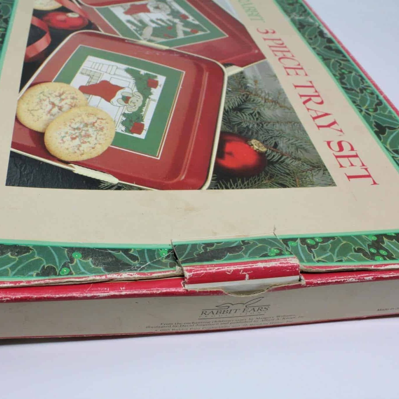 - Details: This is a 3 piece set of trays in varying sizes, all featuring the forever popular Velveteen Rabbit. This tray set is clearly for the holidays as the Velveteen Rabbit is waiting inside a stocking for a lucky little boy or girl to come and play. Rabbit Ears Productions in cooperation with Random House (the publisher of the book "The Velveteen Rabbit") designed this set exclusively for Target Stores. The illustration for these trays was originally done by David Jorgensen. The book starts as a stuffed rabbit, sewn from velveteen, is given as a Christmas present to a small boy, this tray set is ideal to continue the story. The two smaller trays conveniently nest inside the larger tray. The larger tray still retains its original label from Rabbit Ears Productions. We still have the box, however, it is not in great condition, we suggest it for storage of the trays and not for gift giving. Also, there are a couple of minor condition issues, please see "Condition" below. These are ideal not only for serving children (or fun adults), but also corralling games, movies, remotes, or books and keeping things tidy during the hectic holidays.