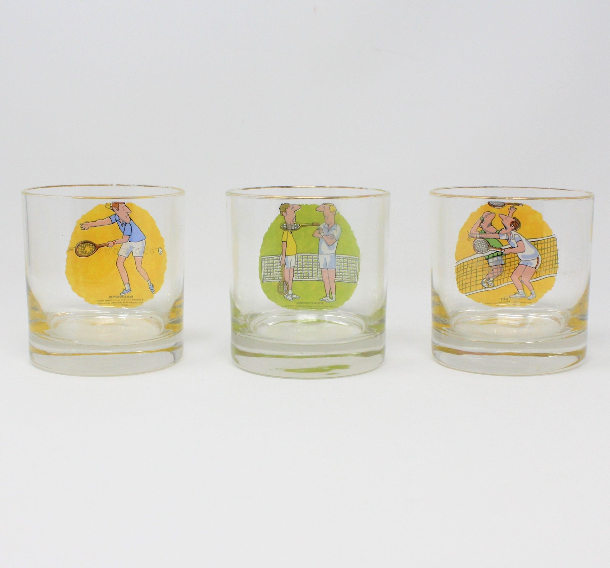 - Details: These are funny glasses, especially made for those who love tennis, they'll get a kick out of the tennis game terminology and corresponding illustration. These are part of a set, but extremely rare, we believe there are 8 glasses in the set. We have 3: "Poaching", "Backspin" and "Let", priced individually ($17 each glass), so you can complete your collection or replace a broken one. However, if you're interested in all three, we offer a 10% discount. Please use the Contact Us, here or email us at support@antigotrunk.com for discount code. These are large whiskey glasses, more than enough room for a double or on the rocks serving. They are blown glass, with weighted bottoms and gold rims. Great addition to any bar, perfect bar decor for Summer. Great gift for your favorite tennis teacher, or tennis player, or is involved in the sport, at any level.