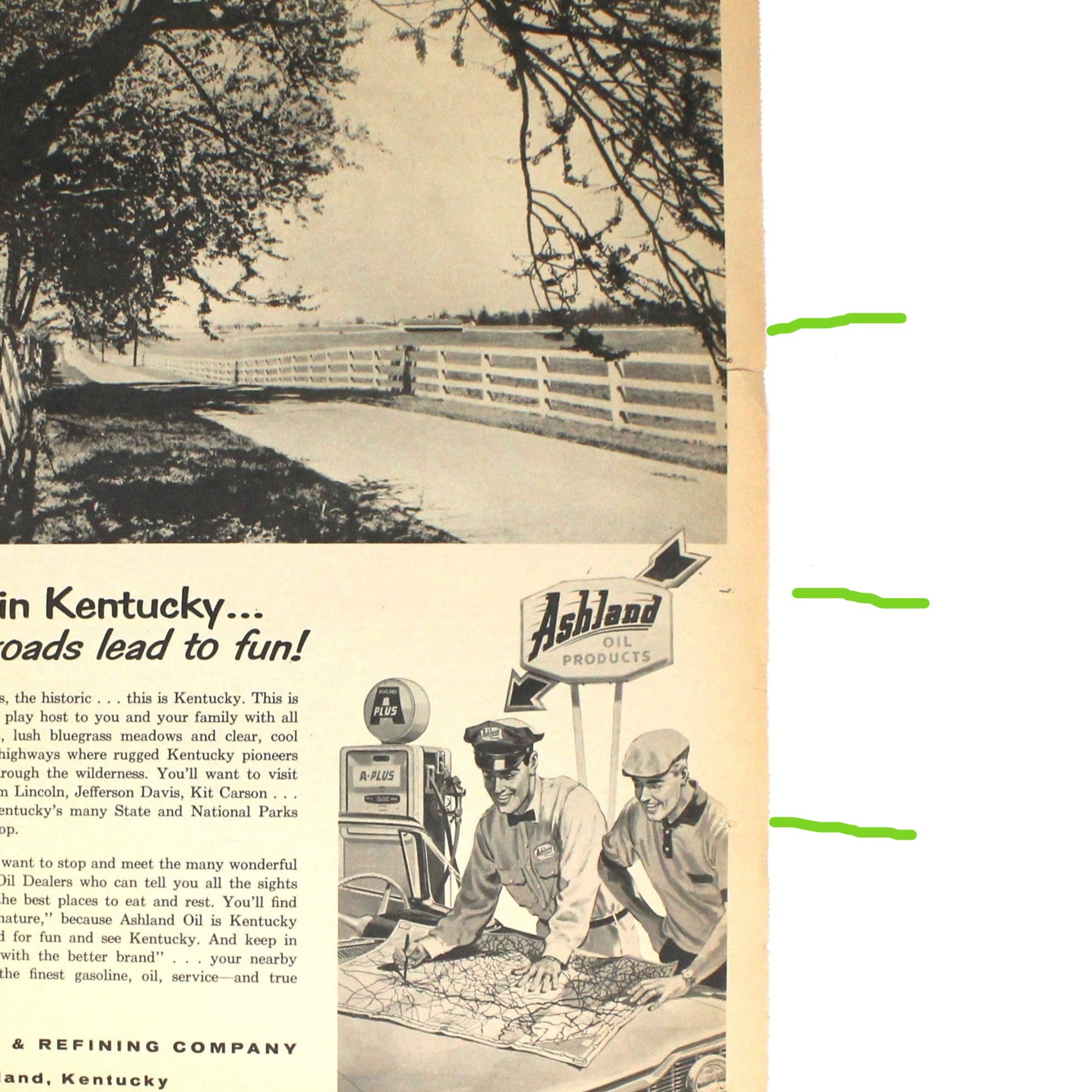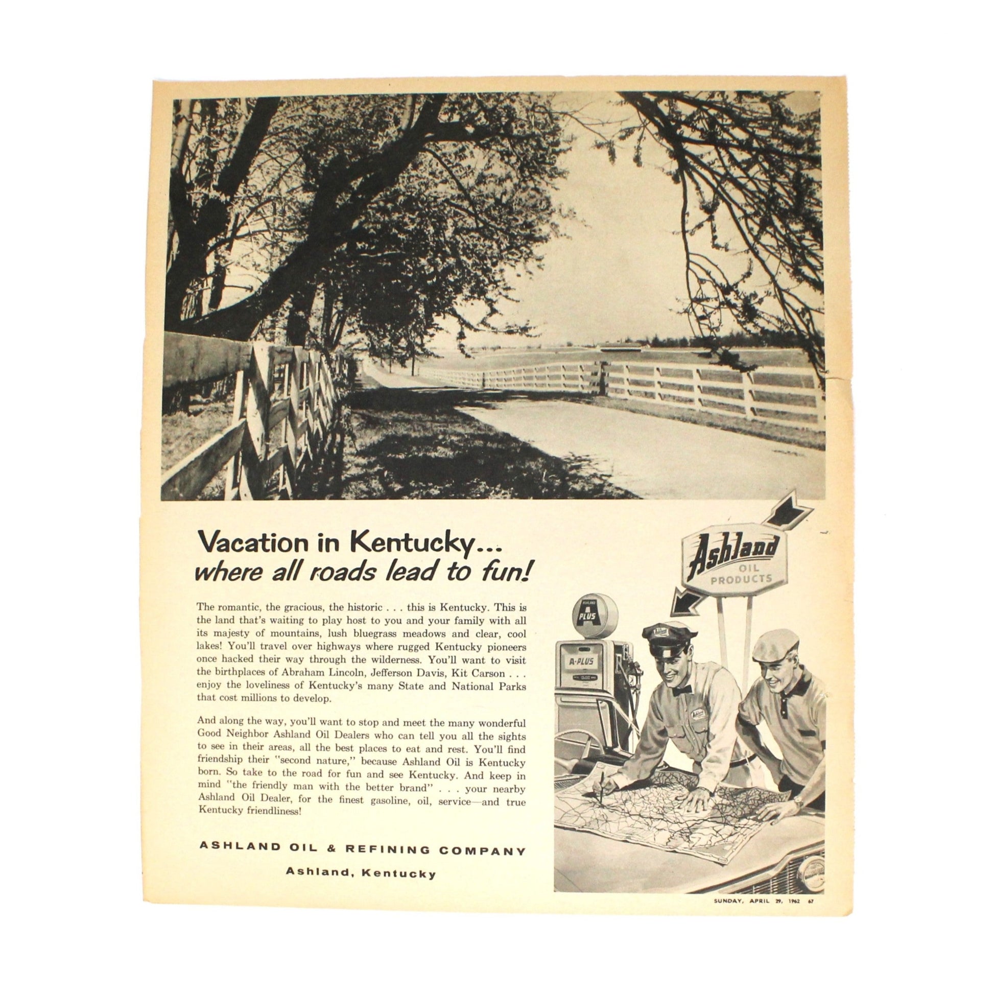 - Details: This is a very old advertisement for Ashland Oil & Refining Company of Ashland, Kentucky. Gas station attendant assisting a driver with directions and promoting vacationing in Kentucky, very hard to find. The other side has an advertisement for the Chrysler 300 Convertible car. This is a 1962, full page, black and white ad. These are larger pages than typical magazine ads, an original page from the magazine, not a print or reproduction, the paper has age toning (yellowed with time).
