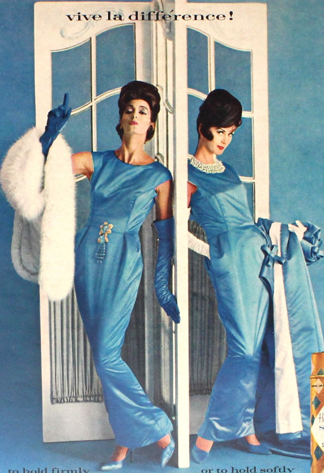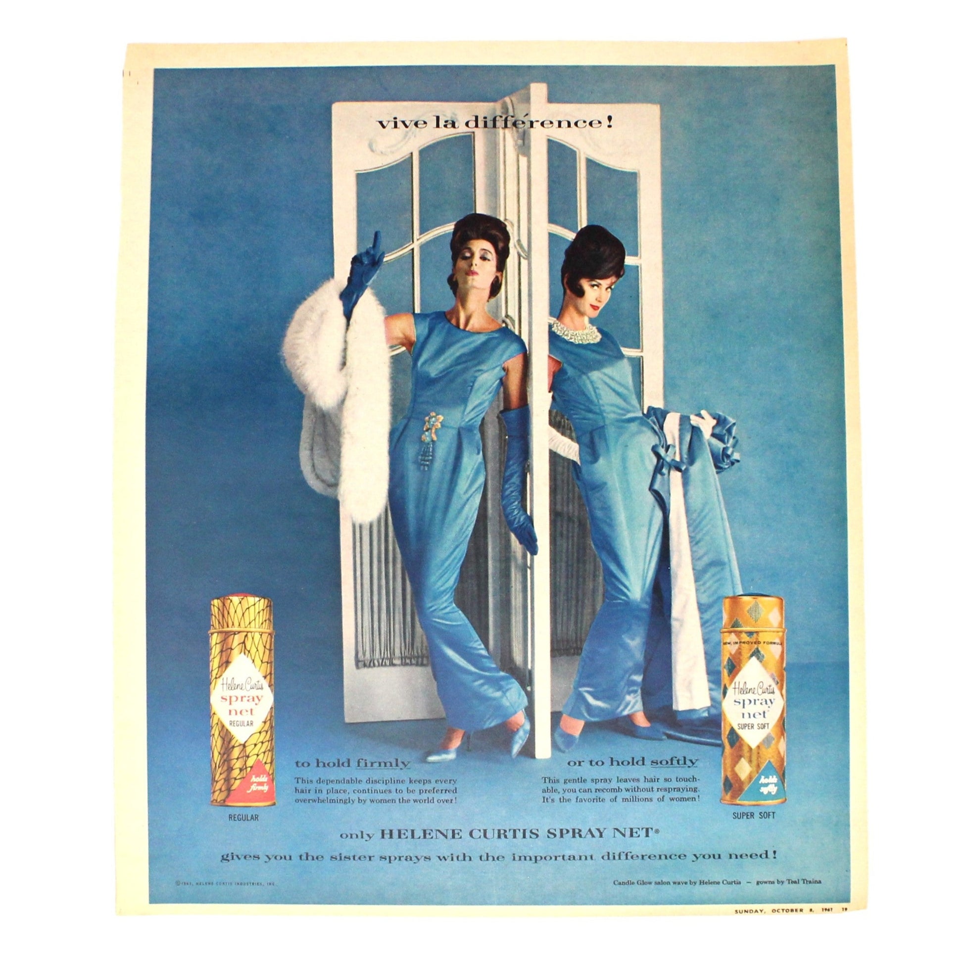 - Details: This is a very old advertisement for a woman's hairspray from Helene Curtis. It is a full page, full color ad from 1961. These are larger pages than typical magazine ads, an original page from the magazine, not a print or reproduction, the paper has age toning (yellowed with time), but the colors remain bright.