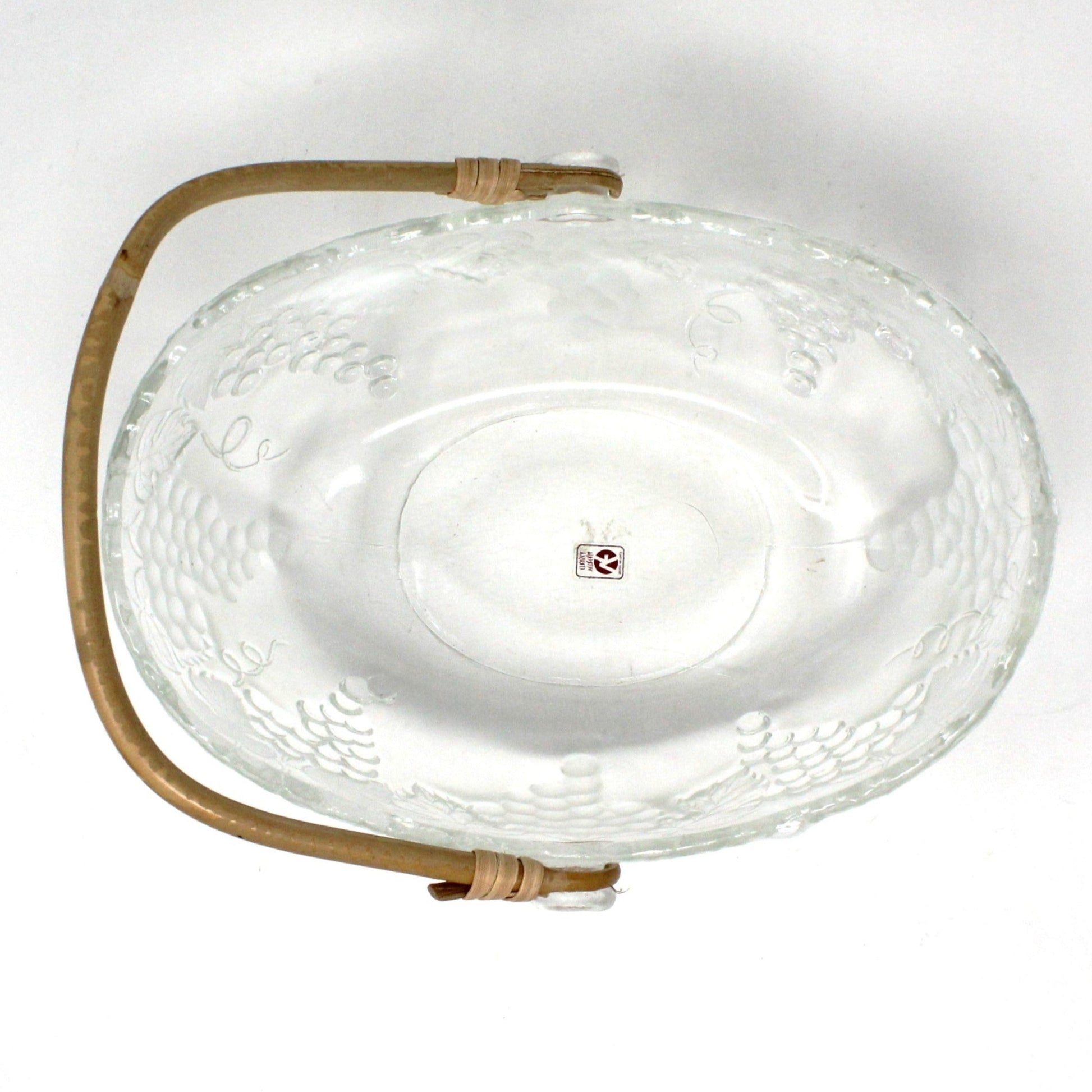 Basket, Vetreria Etrusca, Glass Basket with Bamboo Handle, Embossed Grapes, Vintage Italy