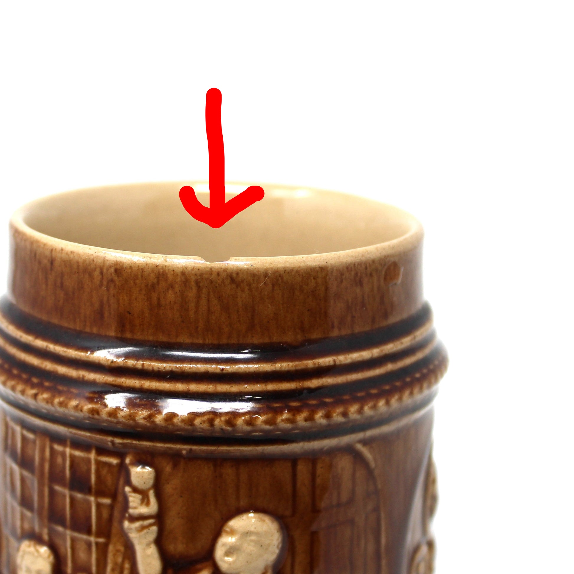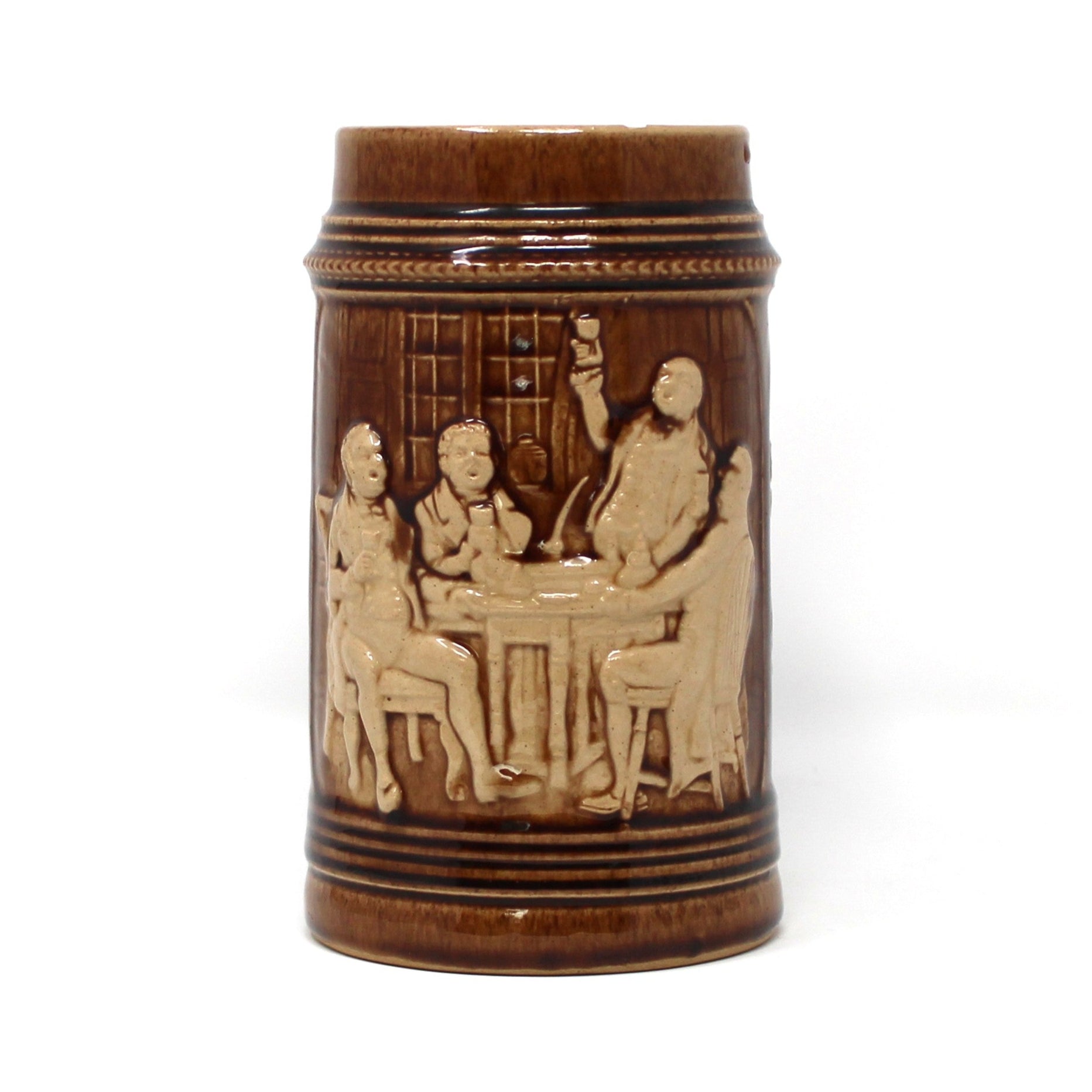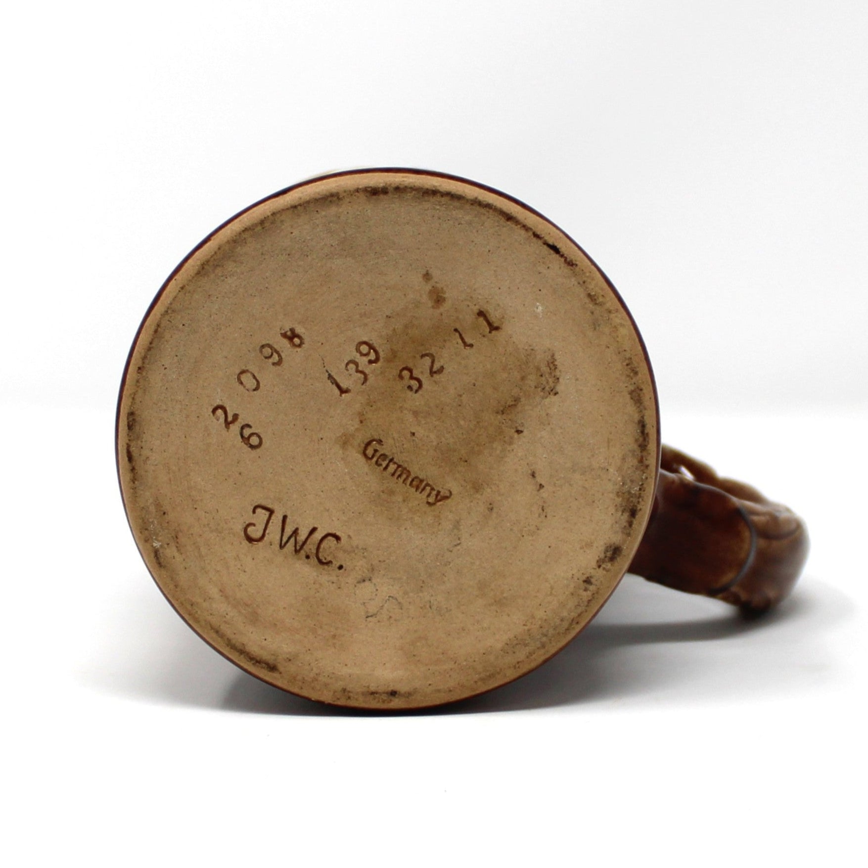 - Details: This vintage beer mug features a Colonia German Pub Scene in a brown and beige glaze. It has several impressed marks, looks to be from a pottery studio: "JWC, Germany, 2098 26 I39 32 11". There is a condition issues, see below for details. Fun mug for Fall and bar displays. Perfect size to store bar spoons and other tools. This is a heavy mug, please keep that in mind at check-out.