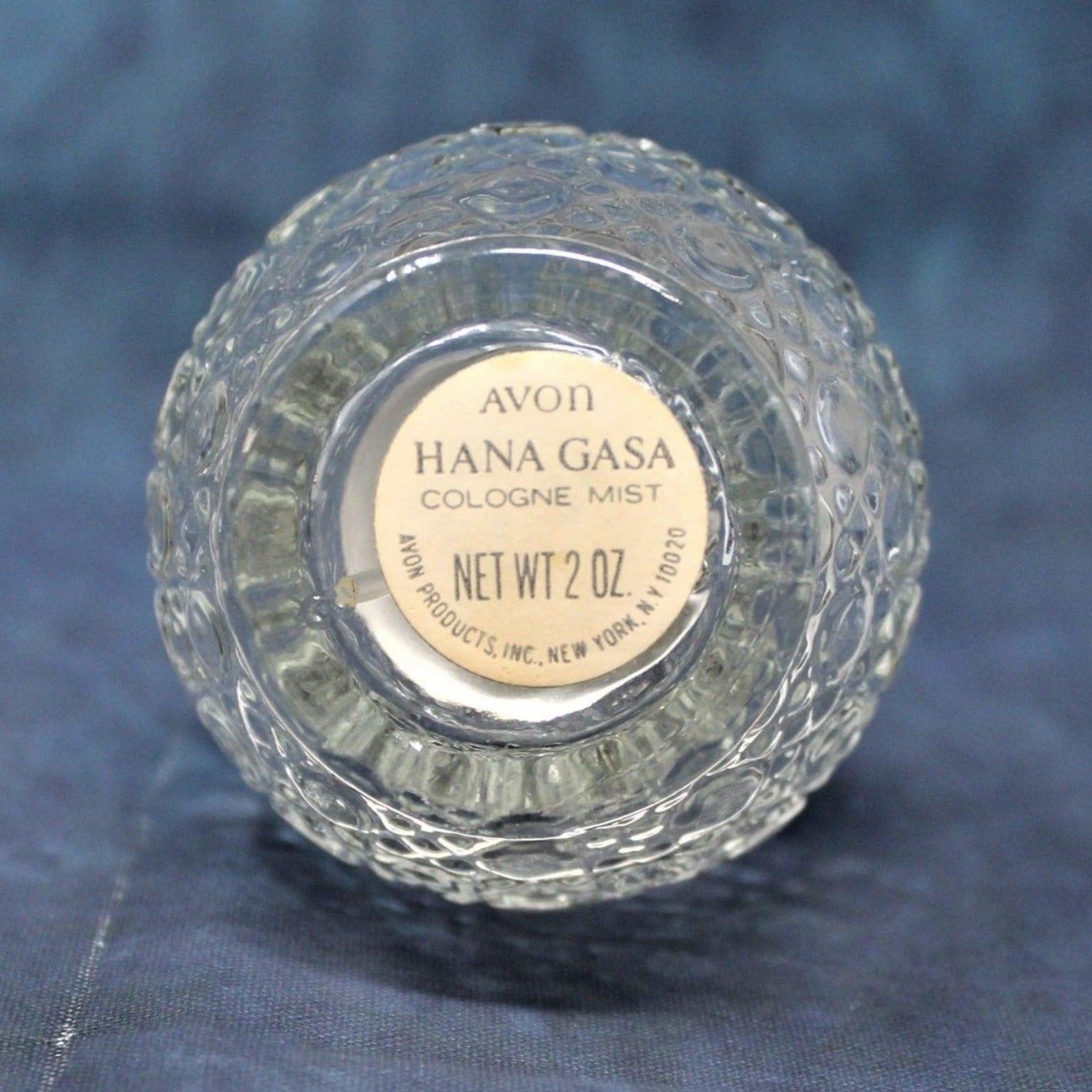 - Details: A really elegant bottle from Avon, originally sold with Hana Gasa cologne mist, now empty. This bottle has a glass body with an embossed bubbles and diamonds pattern and a silver metal neck and lid. The metal lid is adorned with an embossed floral pattern, really pretty! Hana Gasa was launched in 1970, it was a floral fragrance for women with a note of musk. This is not the typical Avon figural decanter, and it's because of that, we think it's one of their more elegant designs, and a perfect addition to any vanity tray or perfume bottle collection. We have two in stock, we photographed them together, they look exactly the same however, one still retains its original sticker on the bottom which says in part: "Avon Hana Gasa Cologne Mist, Net Wt. 2 oz." If you're a collector and this sticker is important to you, please let us know in the comments section at check-out, or Contact Us, otherwise we will ship either one.