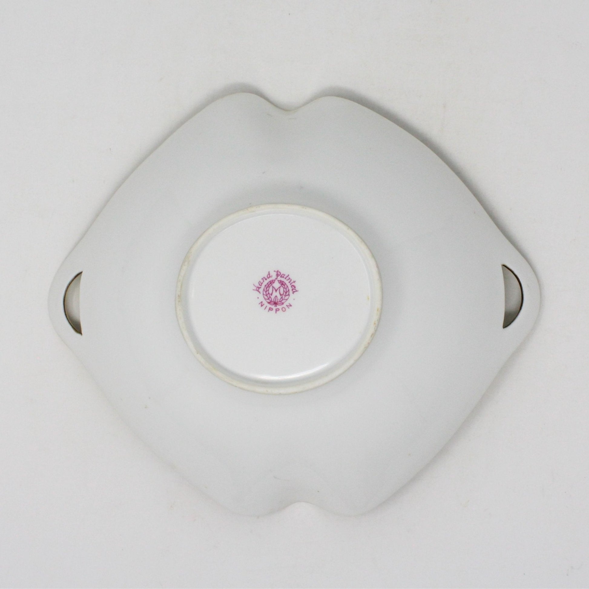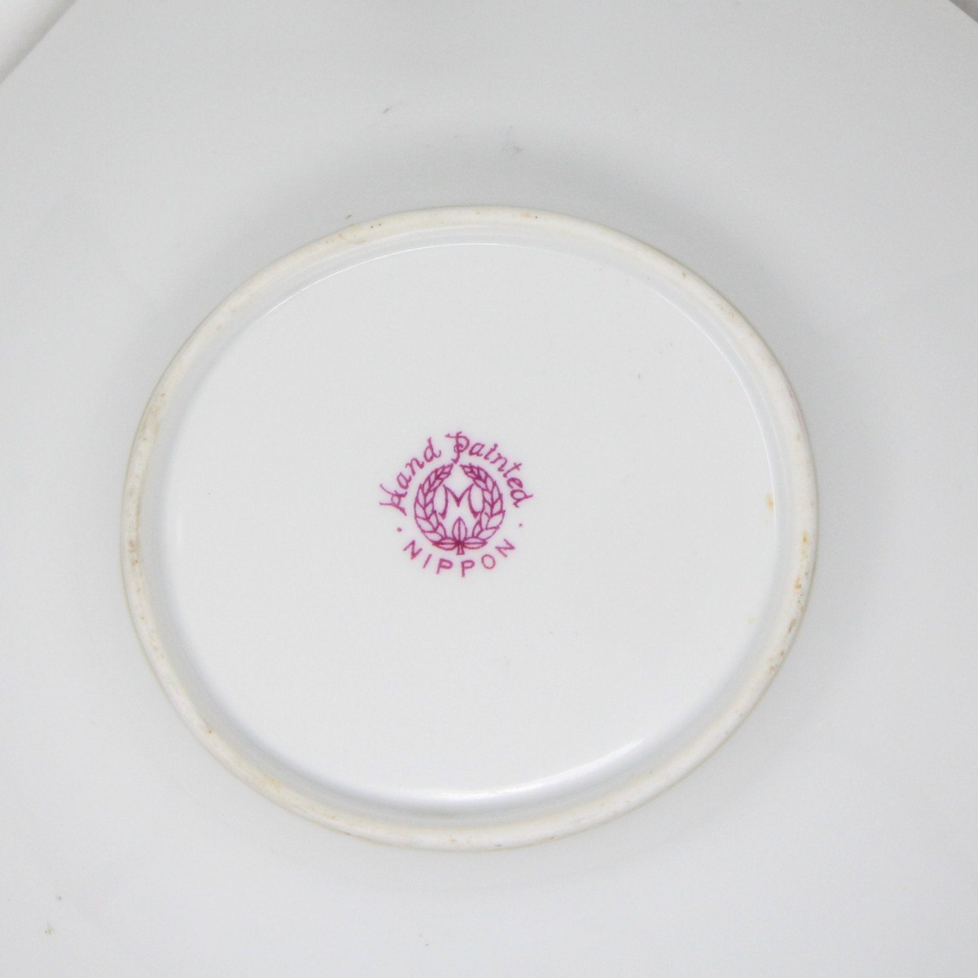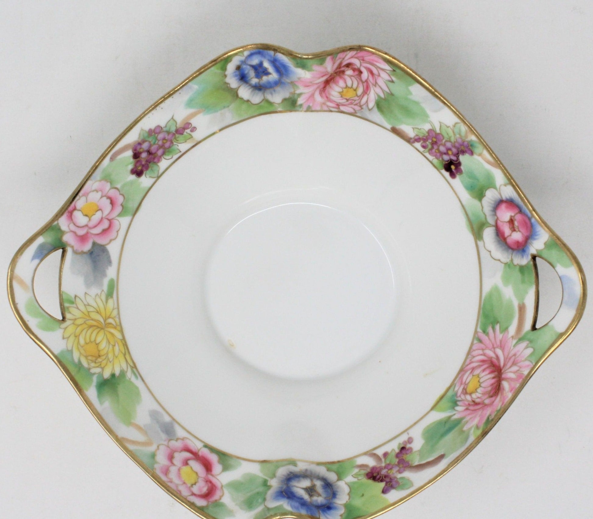 - Details: This is a very beautiful, and very old bowl. It is hand painted all along the border with carnations, spider mums and other smaller flowers. There are green and gray leaves and the band of flowers is bordered in gold on the top and bottom. The bowl has very pretty pierced built-in handles, and if that wasn't enough to make you fall in love with it, the shape will. This porcelain bowl has been shaped into waves/swirls that really makes this a stand-out bowl. It is made of very fine porcelain, very translucent. The bowl is stamped on the back: "Hand Painted Nippon" and the M within a laurel wreath. The "M" is for "Morimura", this mark was used for Japanese imports and was introduced in 1911 and used until 1921. This eventually became the mark for Noritake. Gorgeous piece for decor with potpourri or simply on its own, we don't believe it is food safe. Great Mother's Day or hostess gift!