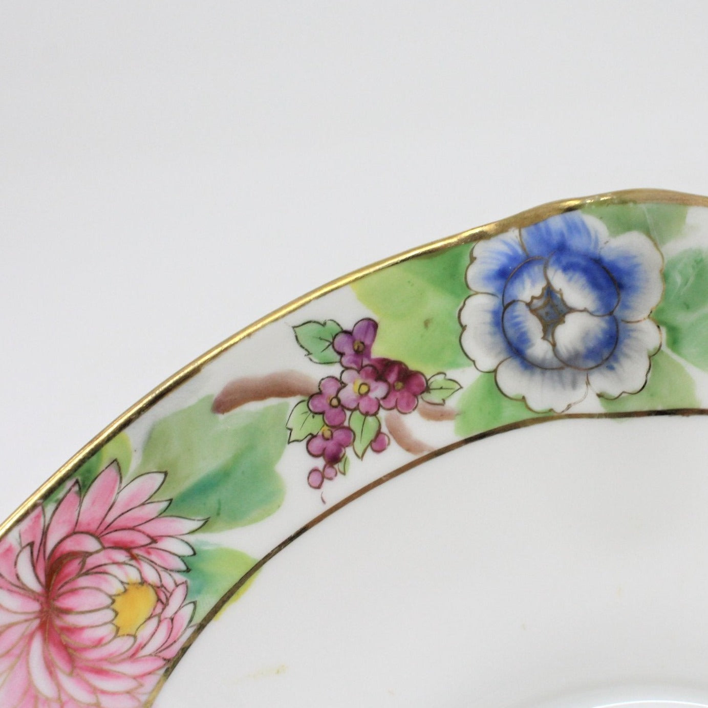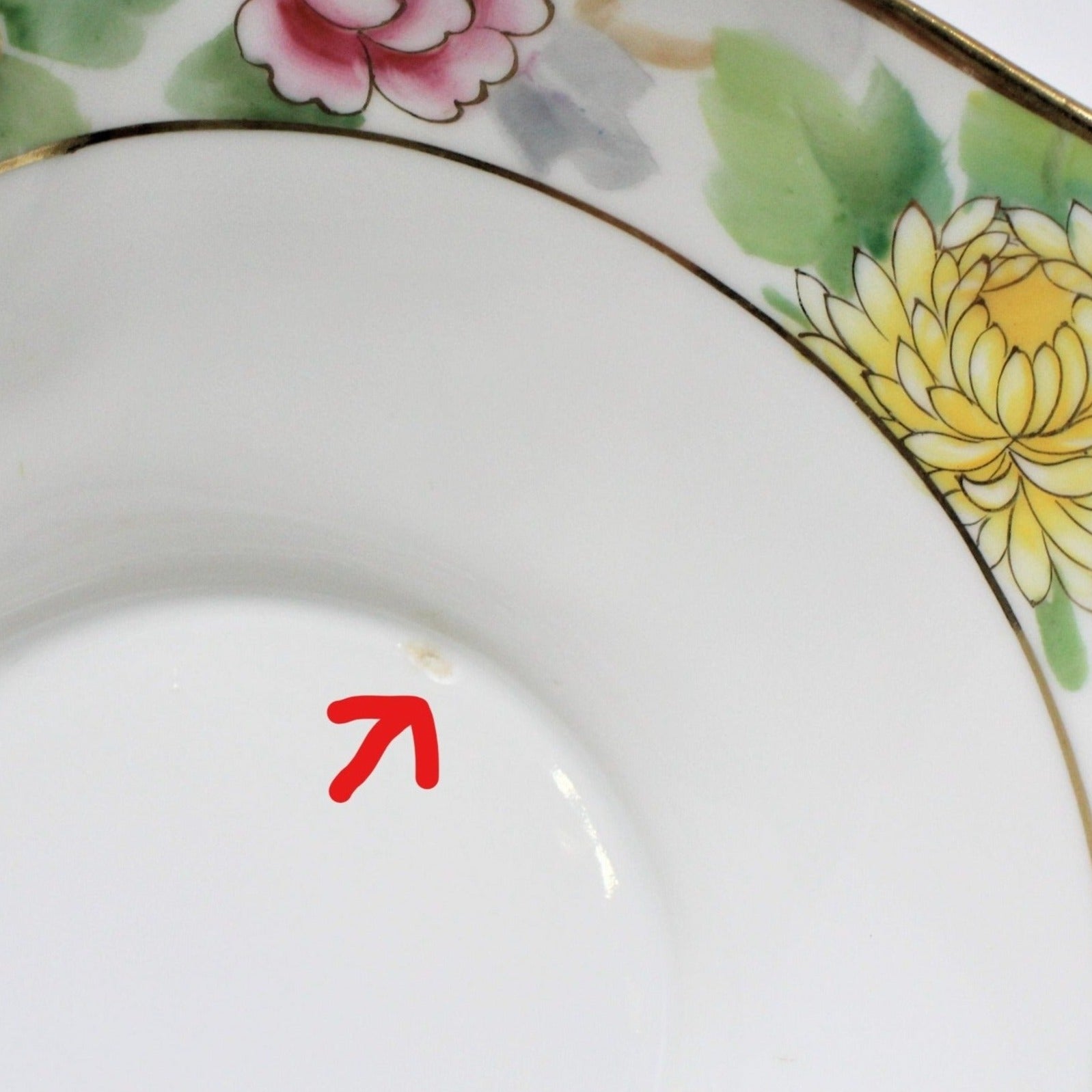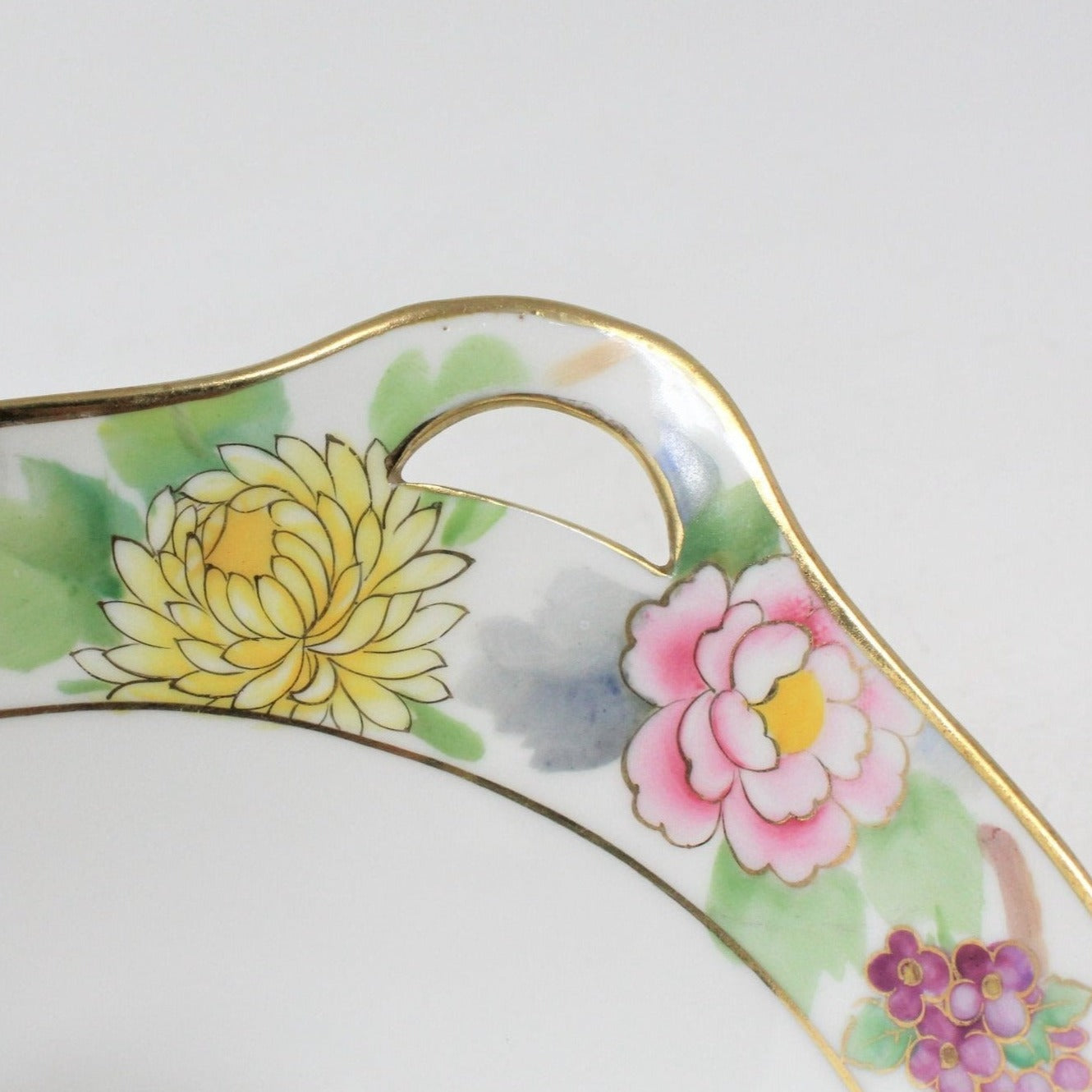 - Details: This is a very beautiful, and very old bowl. It is hand painted all along the border with carnations, spider mums and other smaller flowers. There are green and gray leaves and the band of flowers is bordered in gold on the top and bottom. The bowl has very pretty pierced built-in handles, and if that wasn't enough to make you fall in love with it, the shape will. This porcelain bowl has been shaped into waves/swirls that really makes this a stand-out bowl. It is made of very fine porcelain, very translucent. The bowl is stamped on the back: "Hand Painted Nippon" and the M within a laurel wreath. The "M" is for "Morimura", this mark was used for Japanese imports and was introduced in 1911 and used until 1921. This eventually became the mark for Noritake. Gorgeous piece for decor with potpourri or simply on its own, we don't believe it is food safe. Great Mother's Day or hostess gift!
